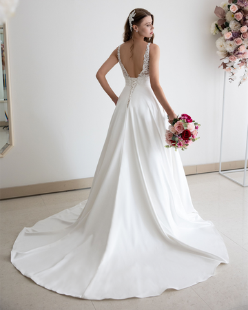 - JENNA- Duchess Satin ballgown with tulle side cut out, features beaded lace bodice with V neckline and invisible pockets.