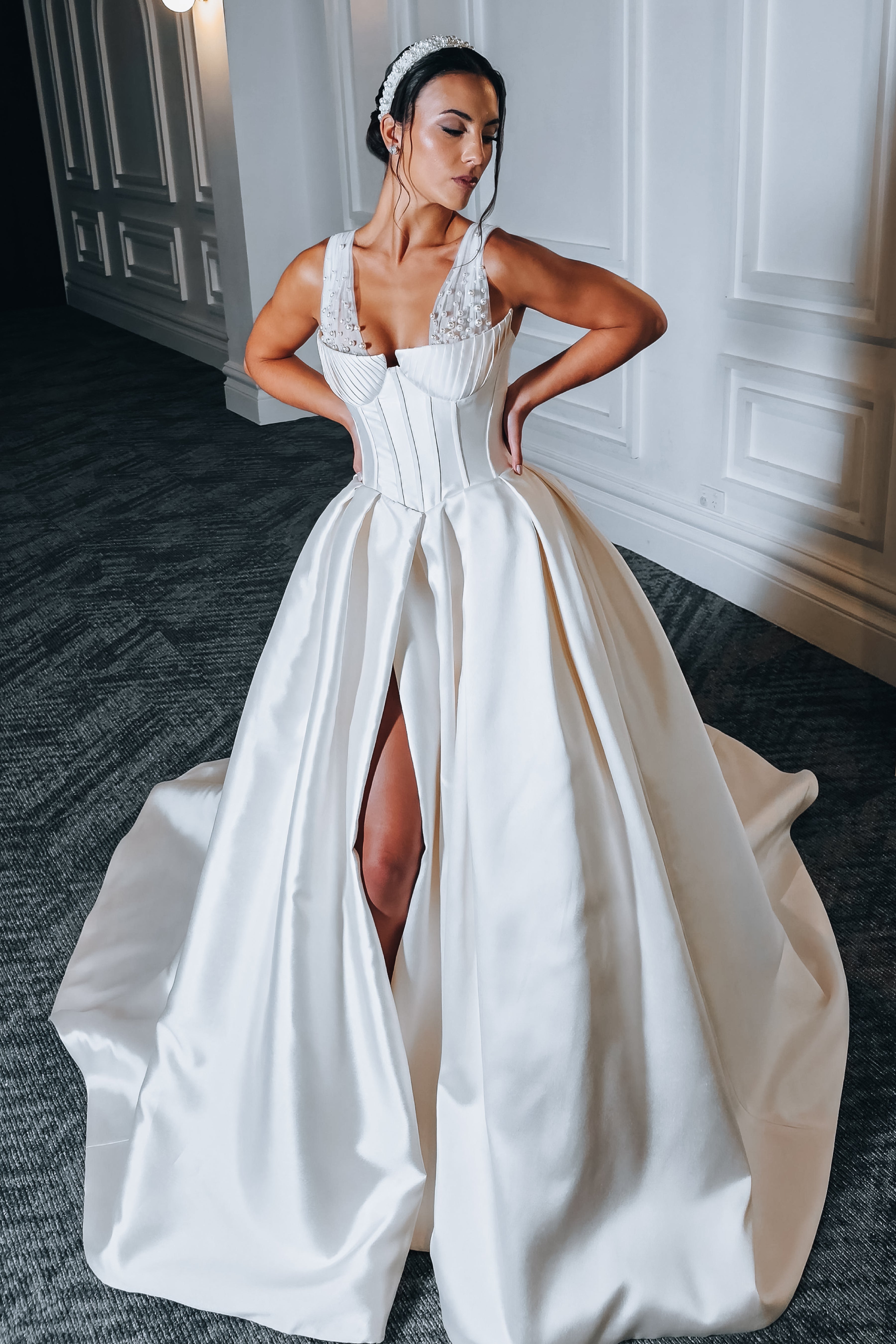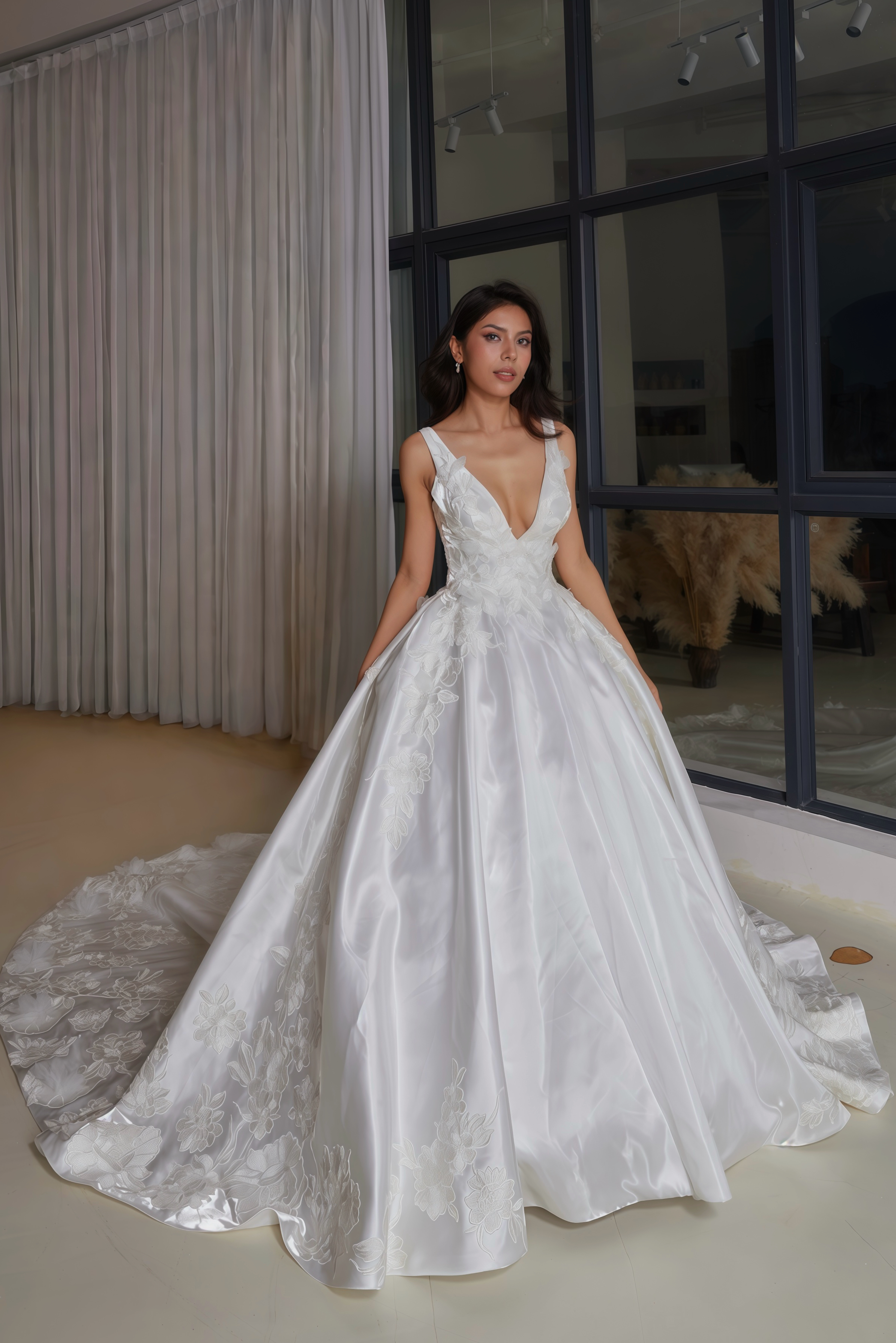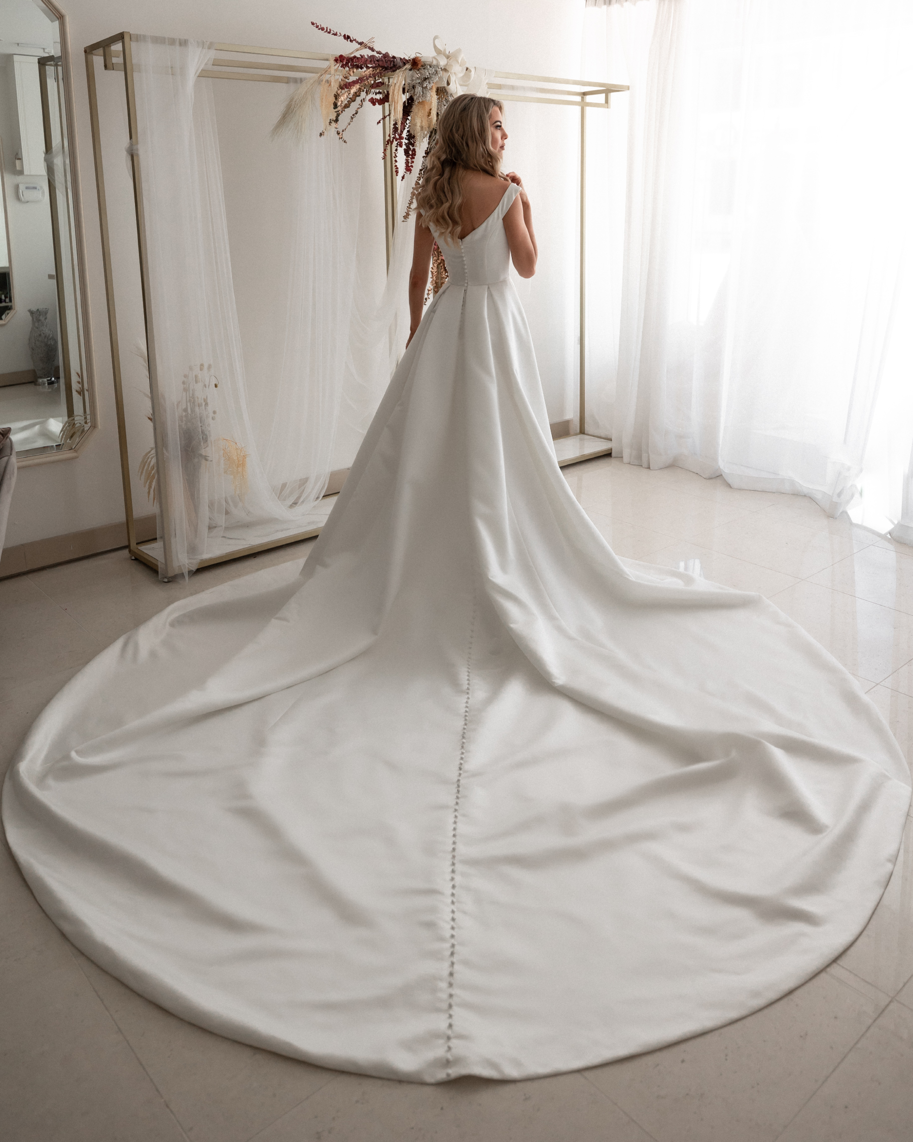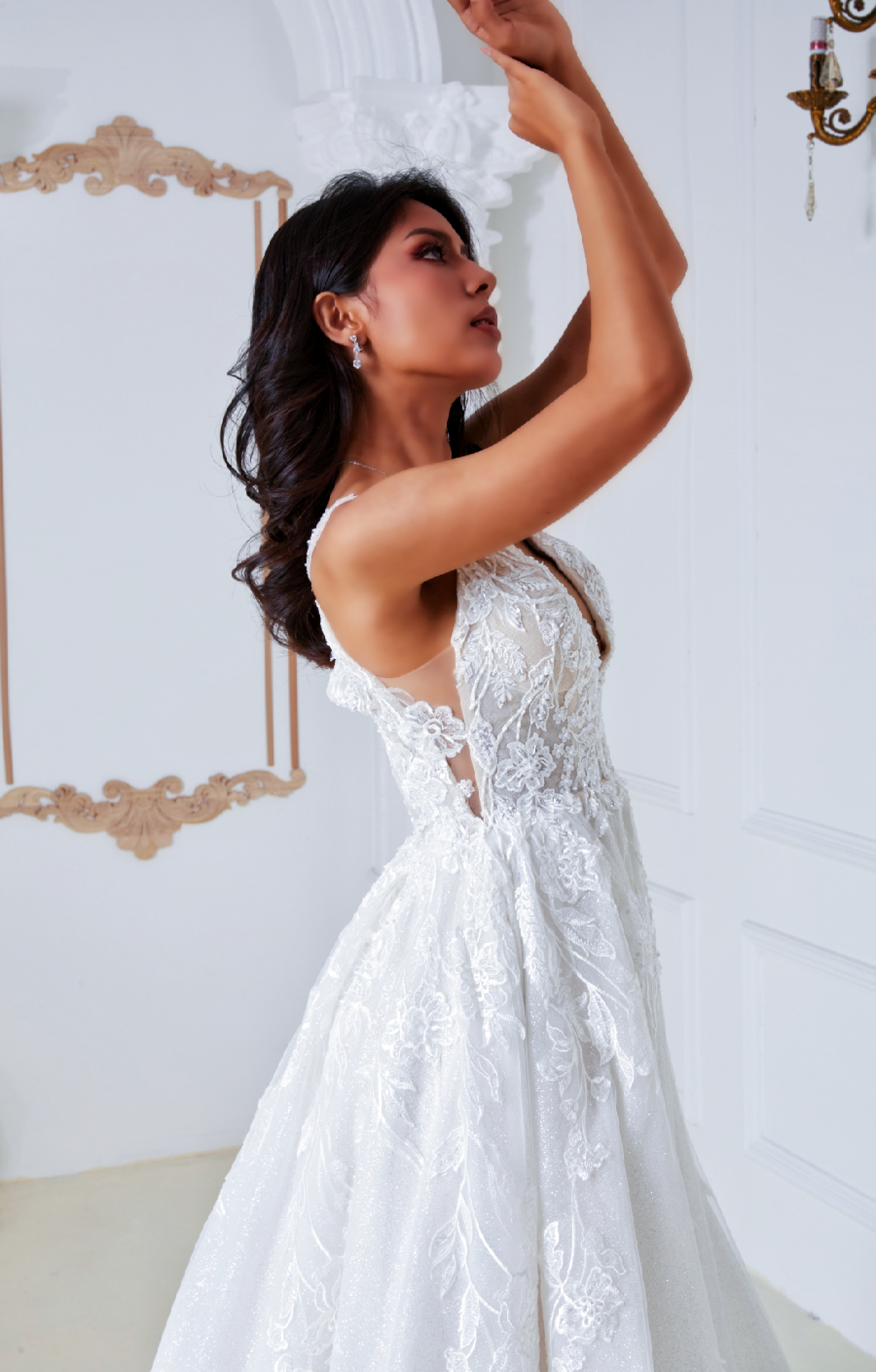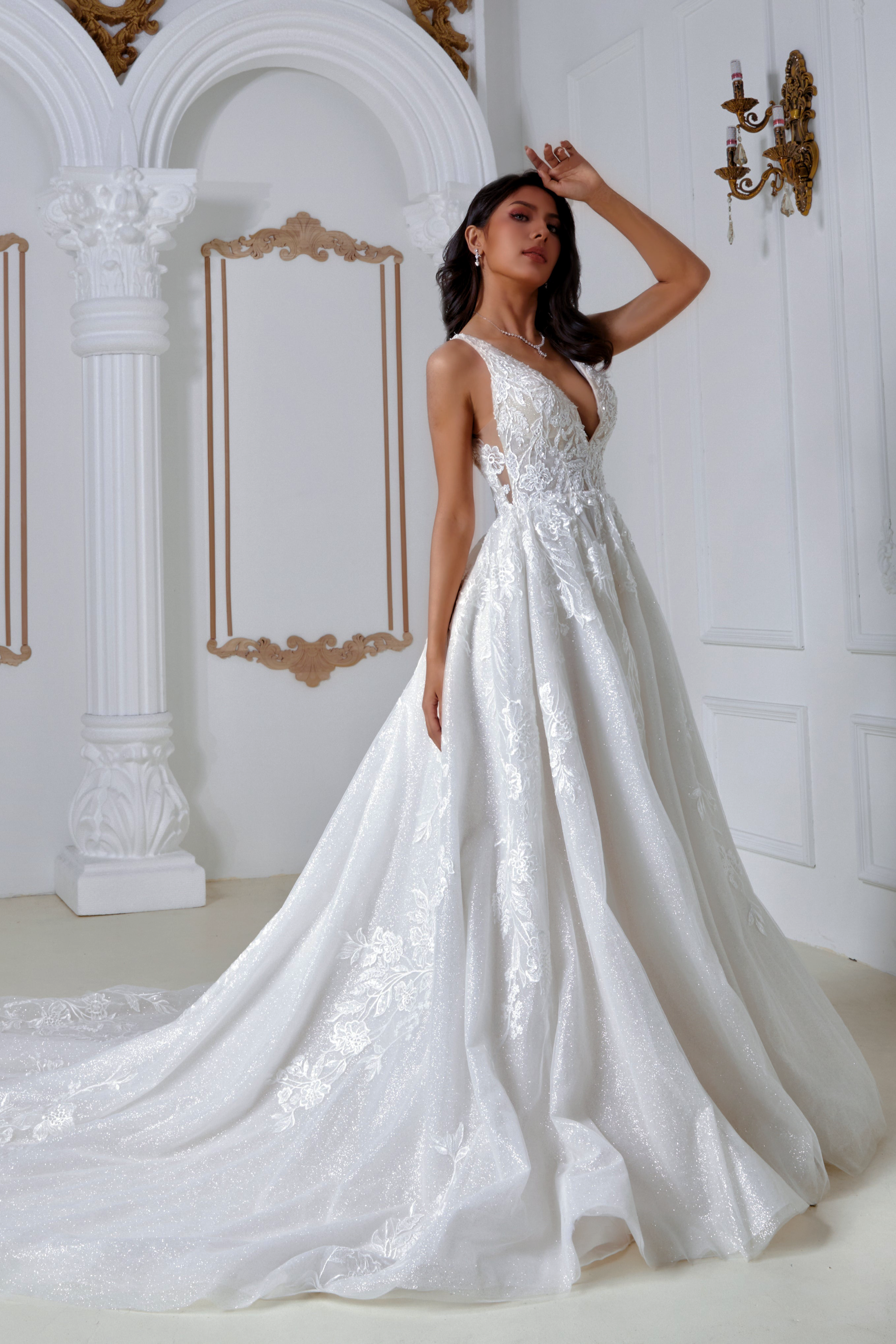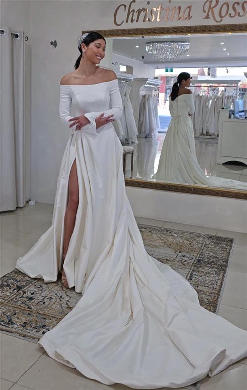 Christina Rossiβs collection of A-line gowns includes timeless, elegant, modern & chic gowns to dresses that are perfect for any wedding theme. The A-line cut flatters a variety of body types, providing a perfect blend of comfort and sophistication. Whether you envision a minimalistic design with clean lines or a more elaborate gown with intricate lace and embellishments, our collection offers something for every bride.