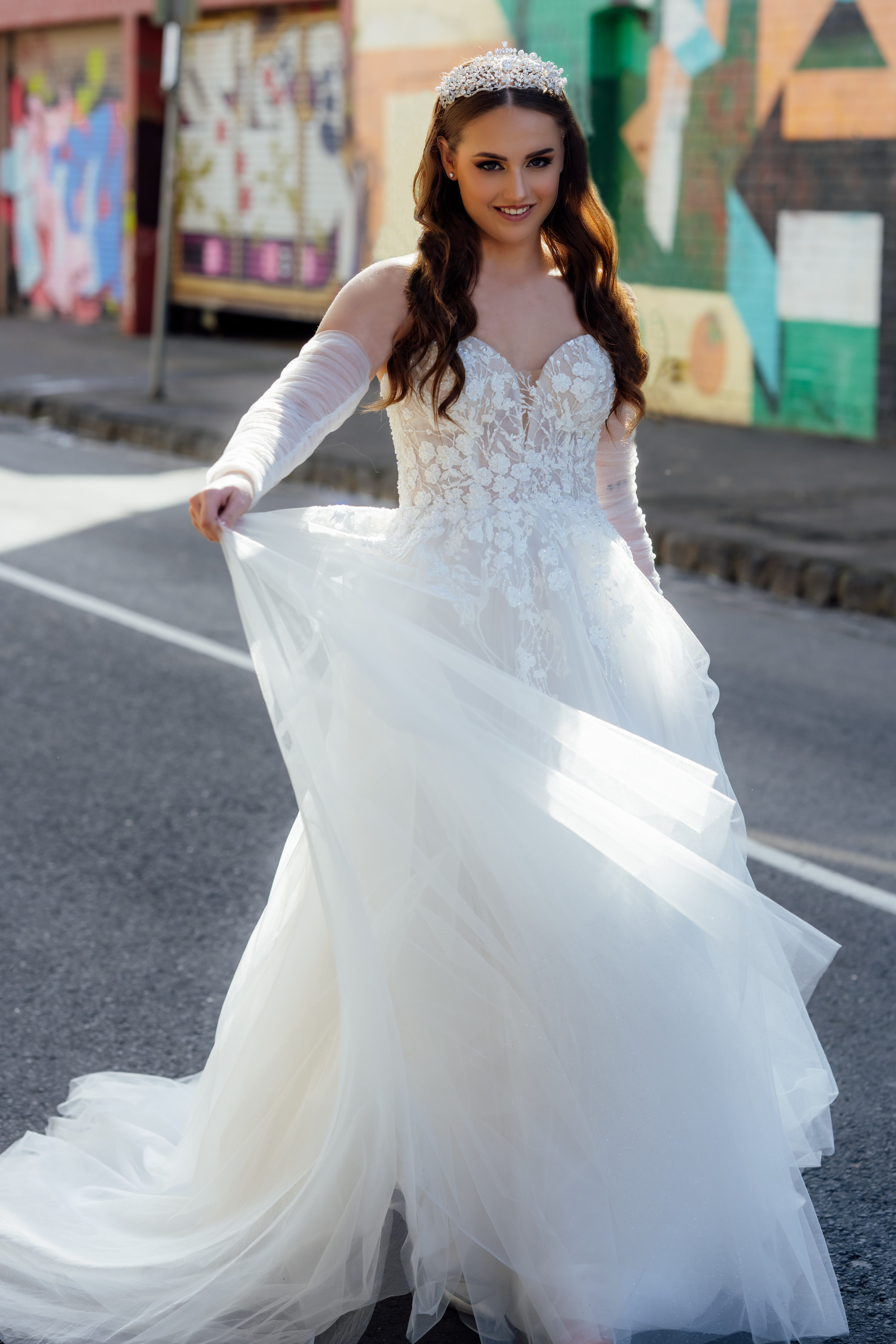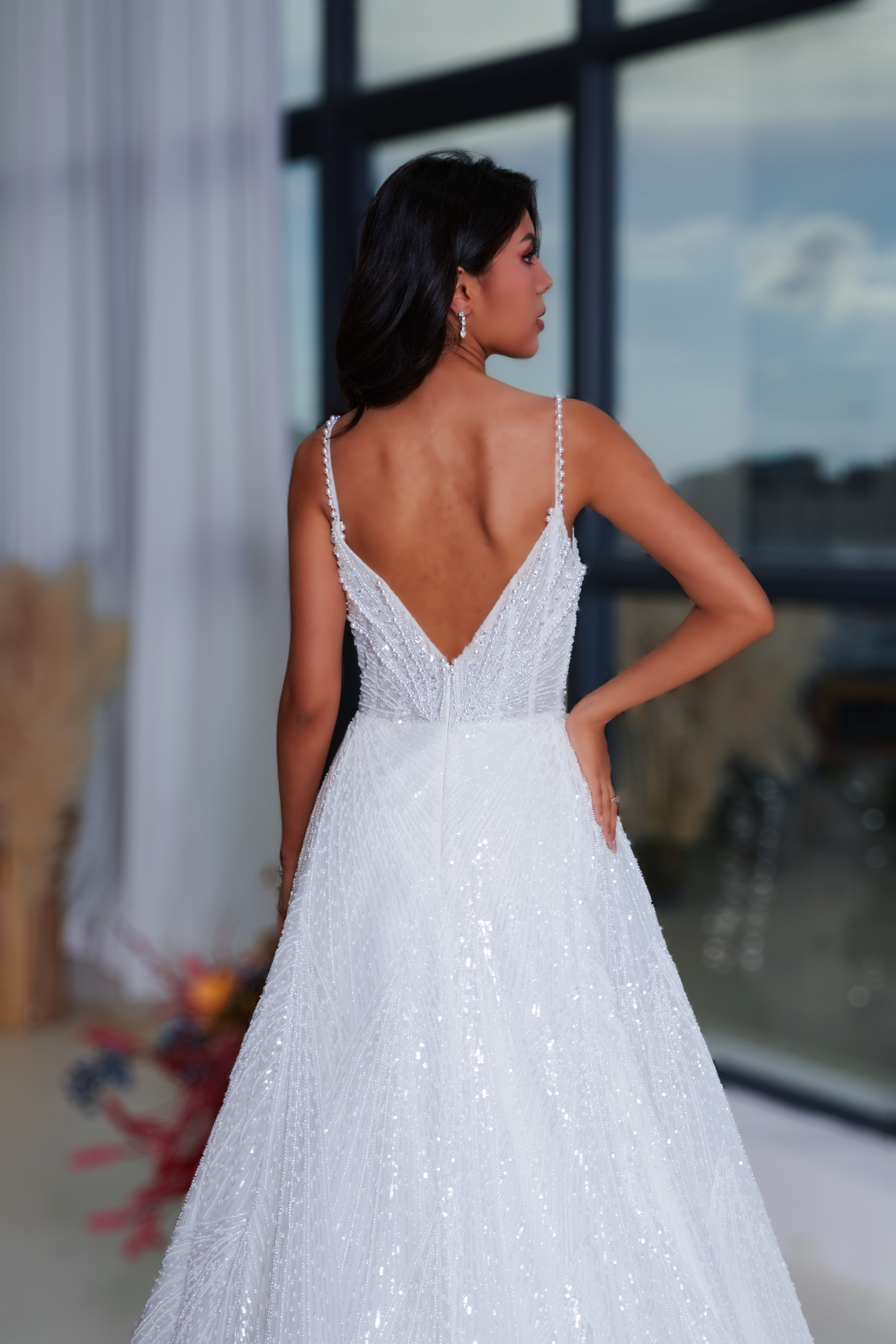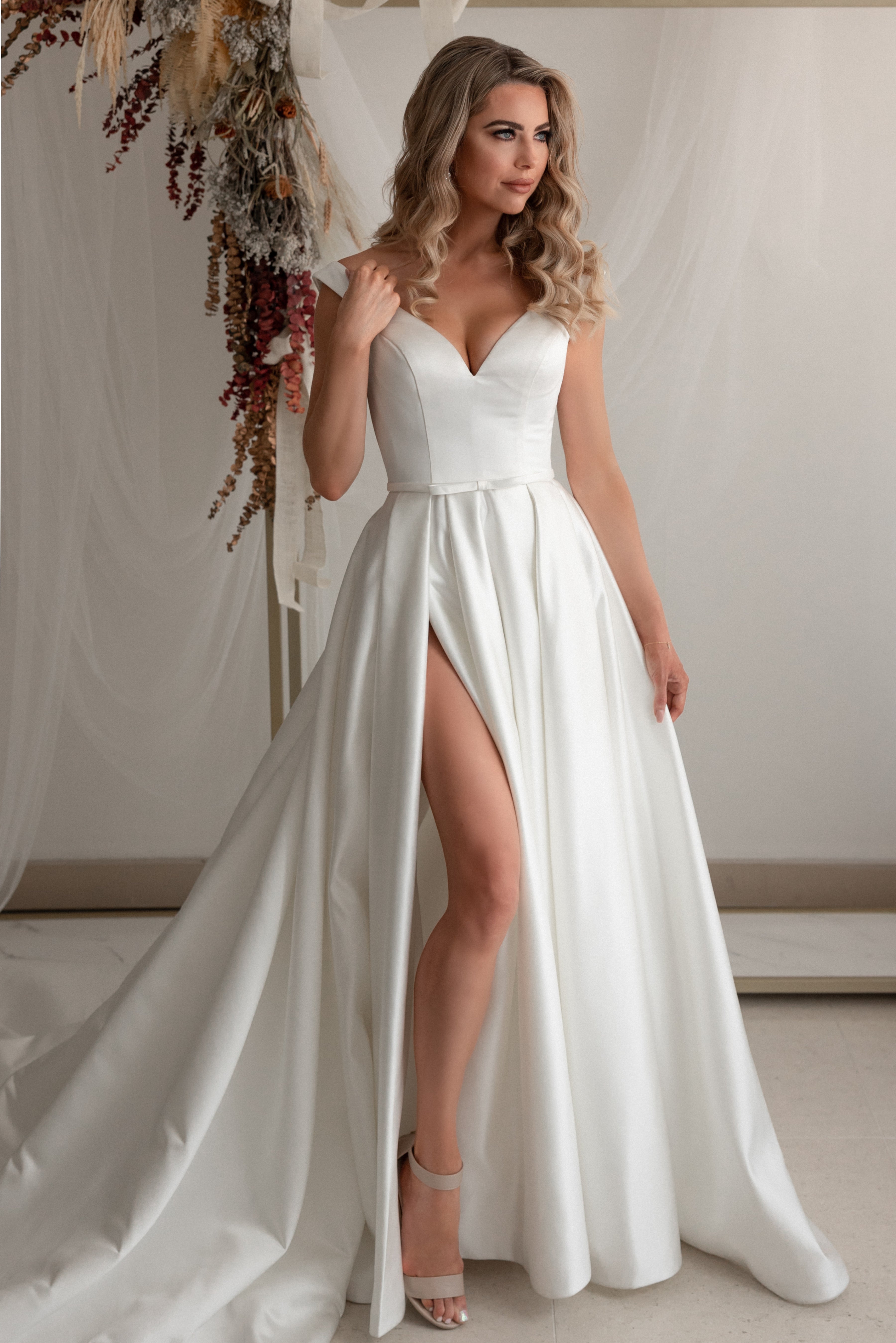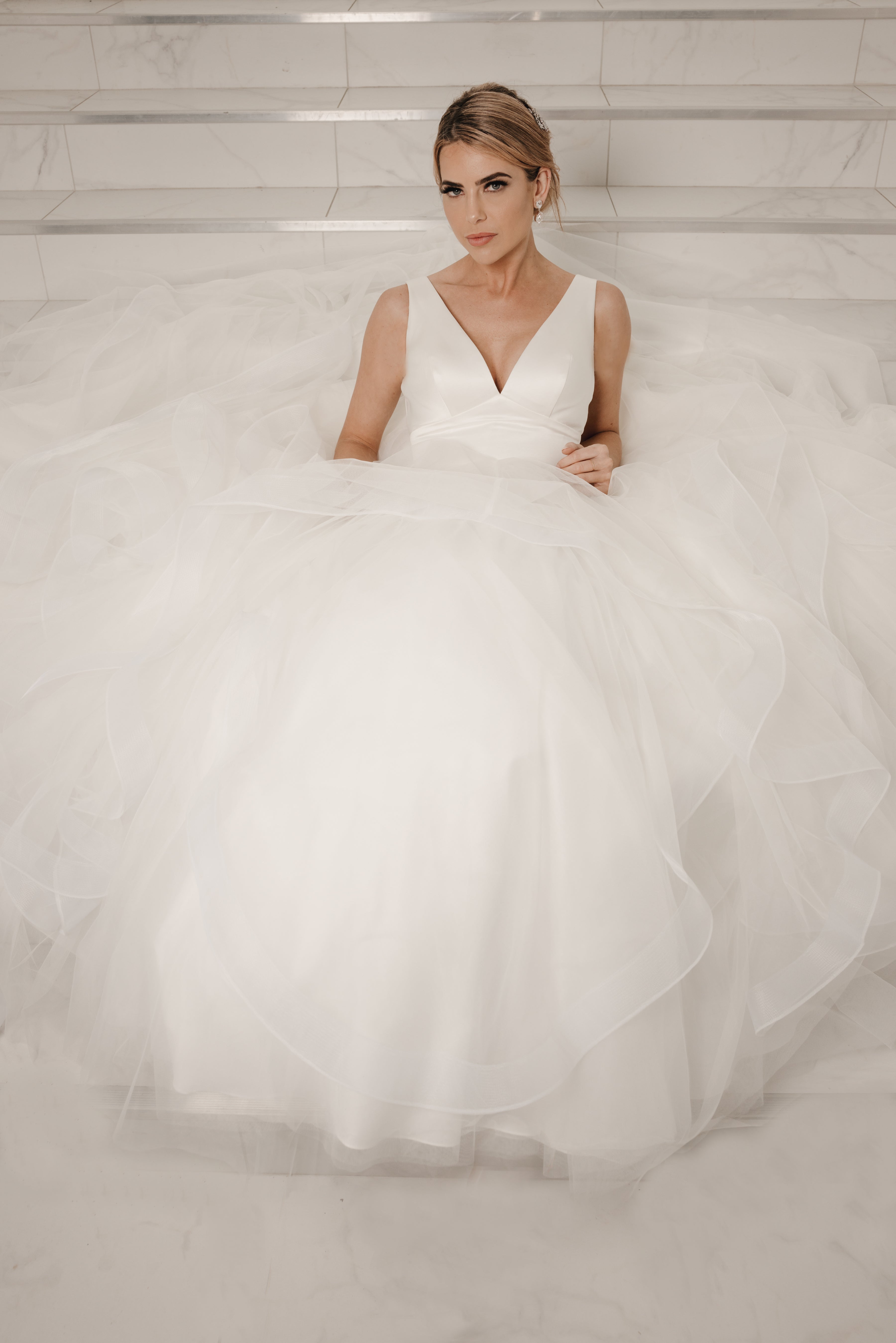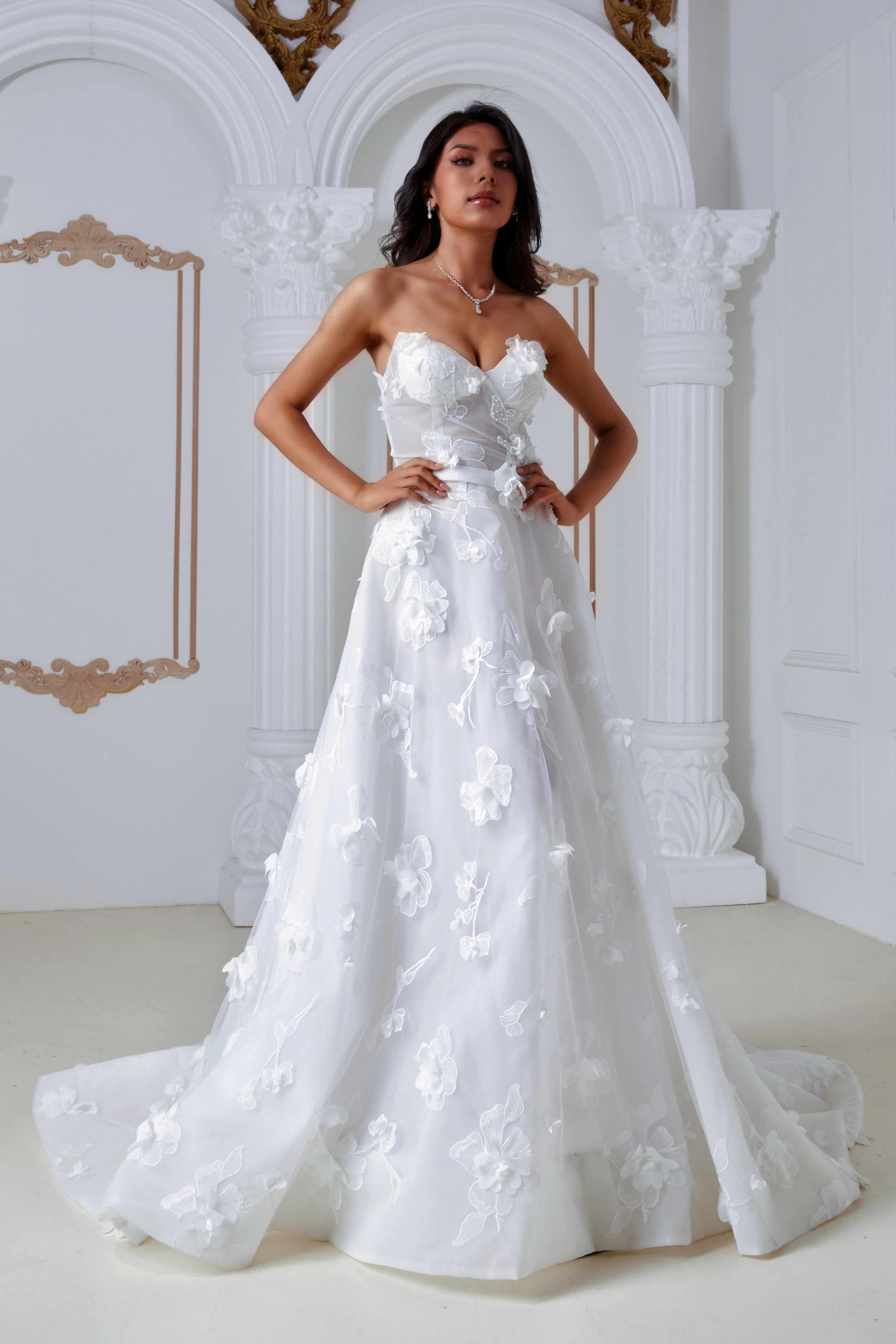 Christina Rossiβs collection of A-line gowns includes timeless, elegant, modern & chic gowns to dresses that are perfect for any wedding theme. The A-line cut flatters a variety of body types, providing a perfect blend of comfort and sophistication. Whether you envision a minimalistic design with clean lines or a more elaborate gown with intricate lace and embellishments, our collection offers something for every bride.