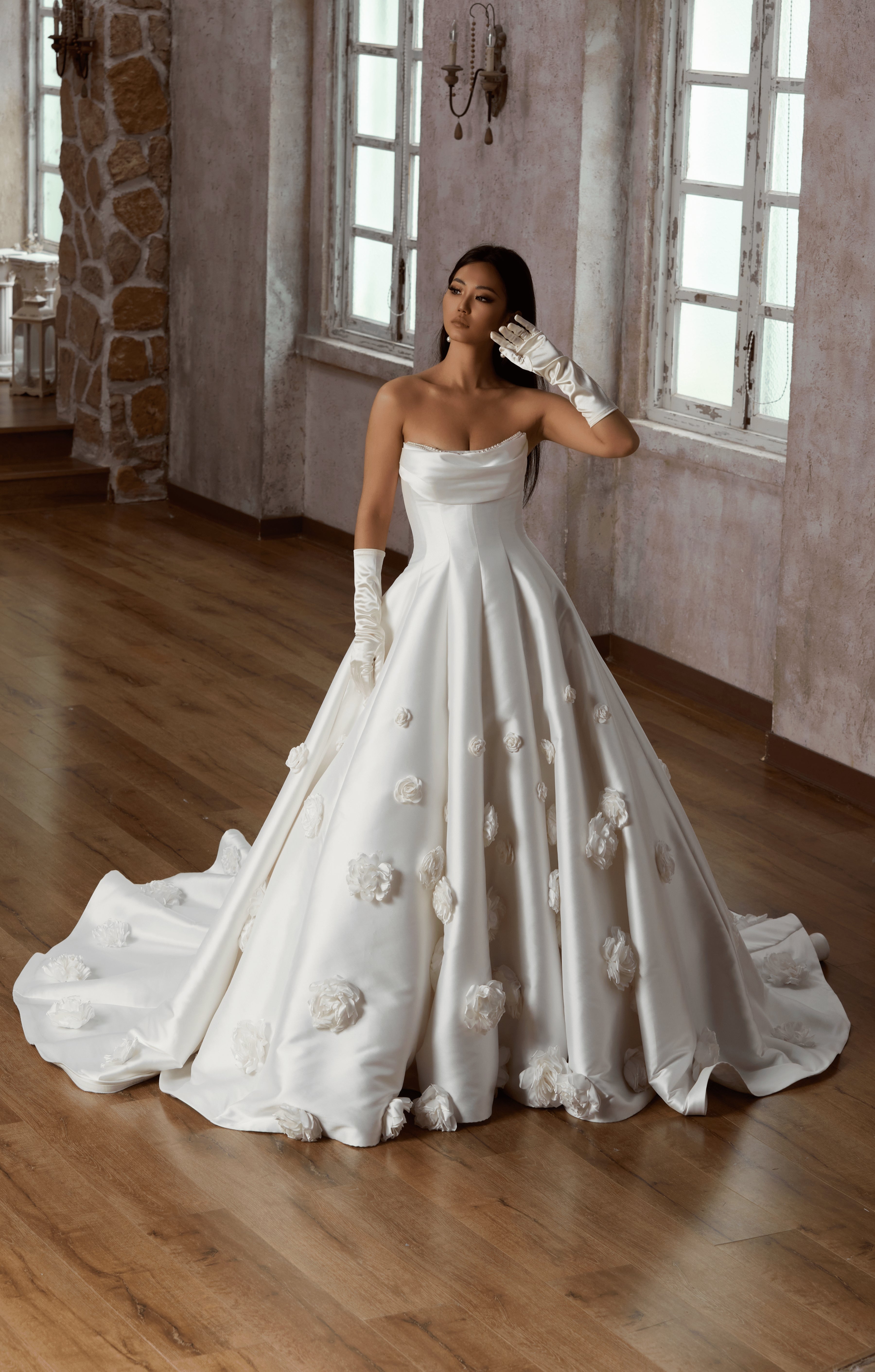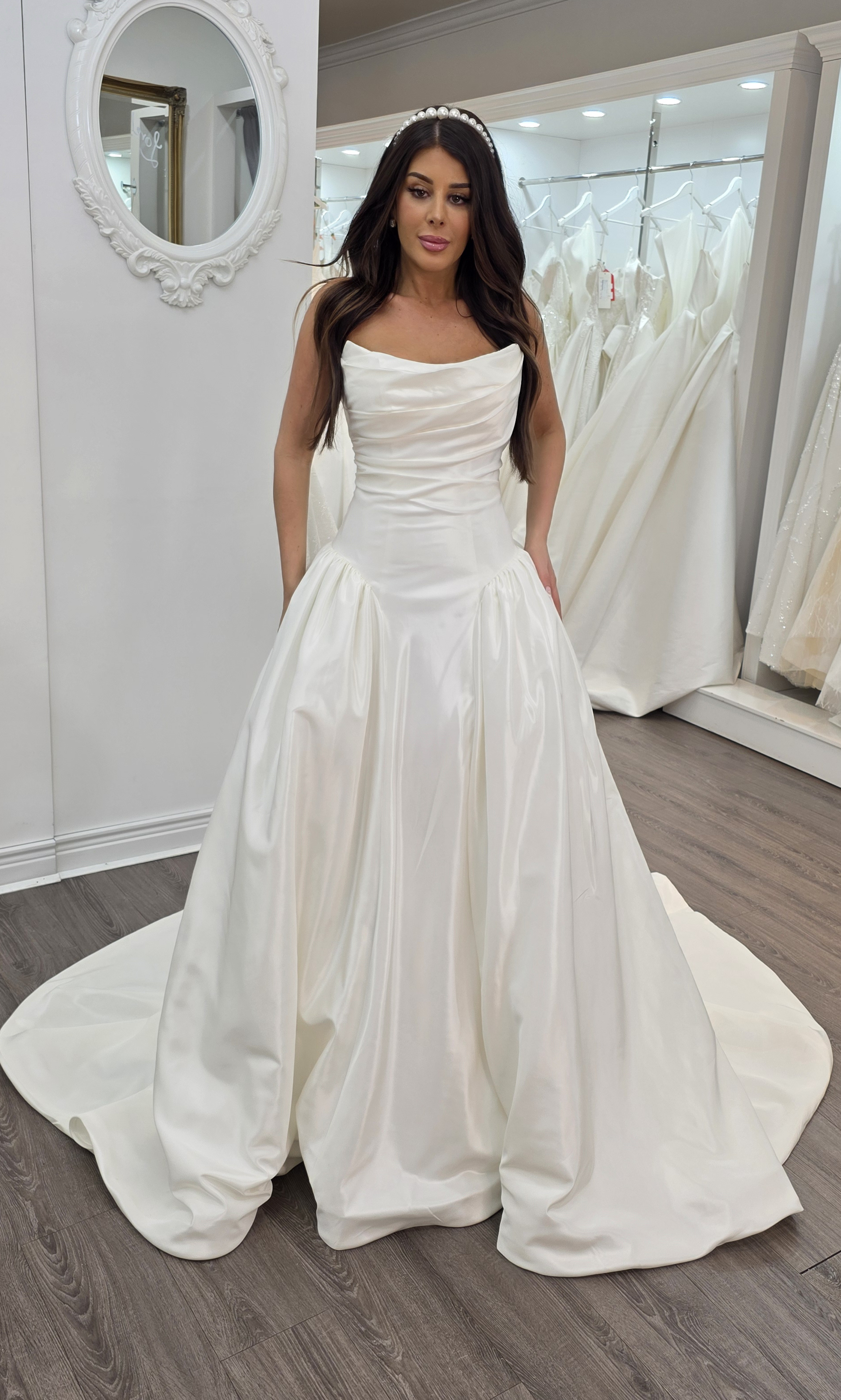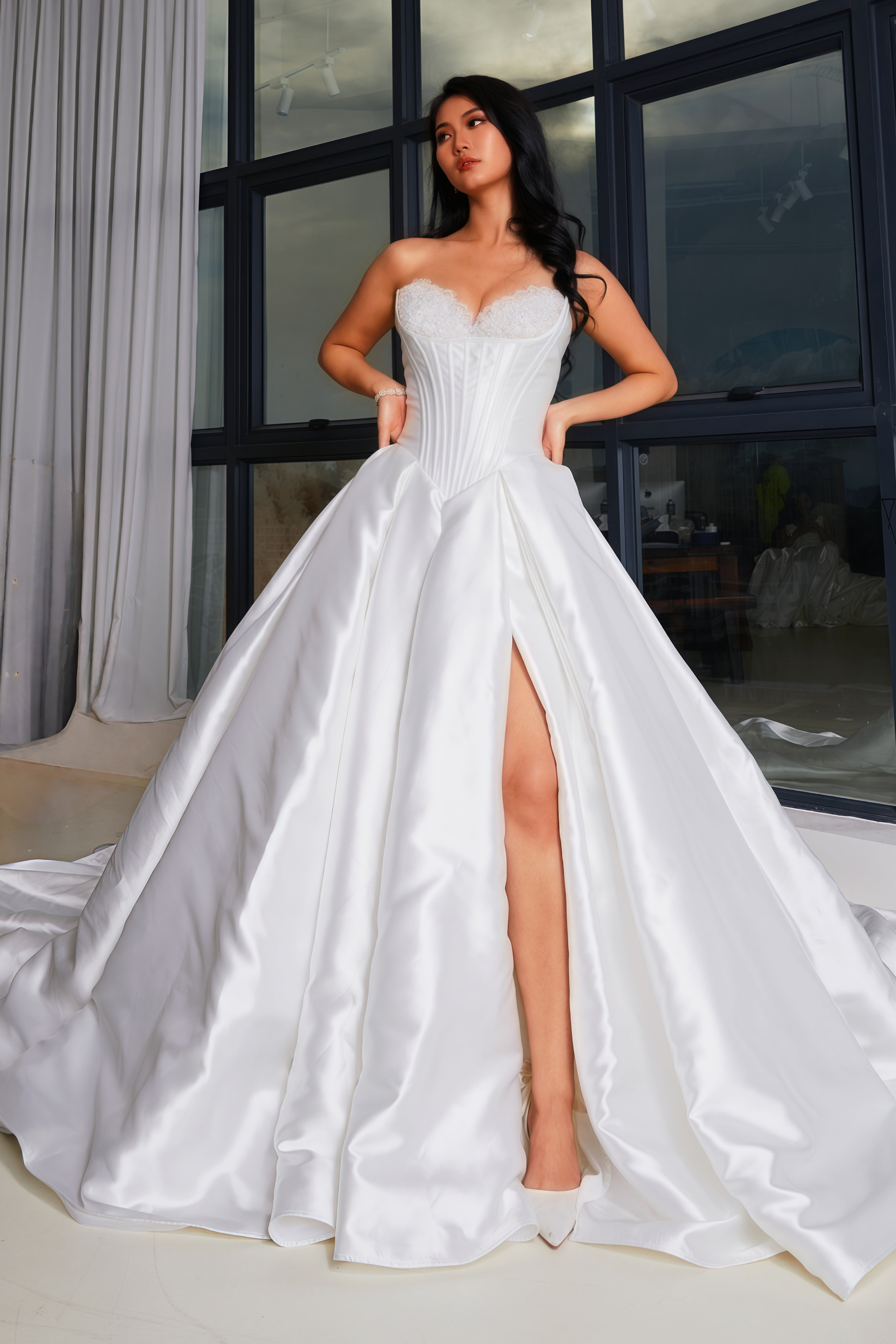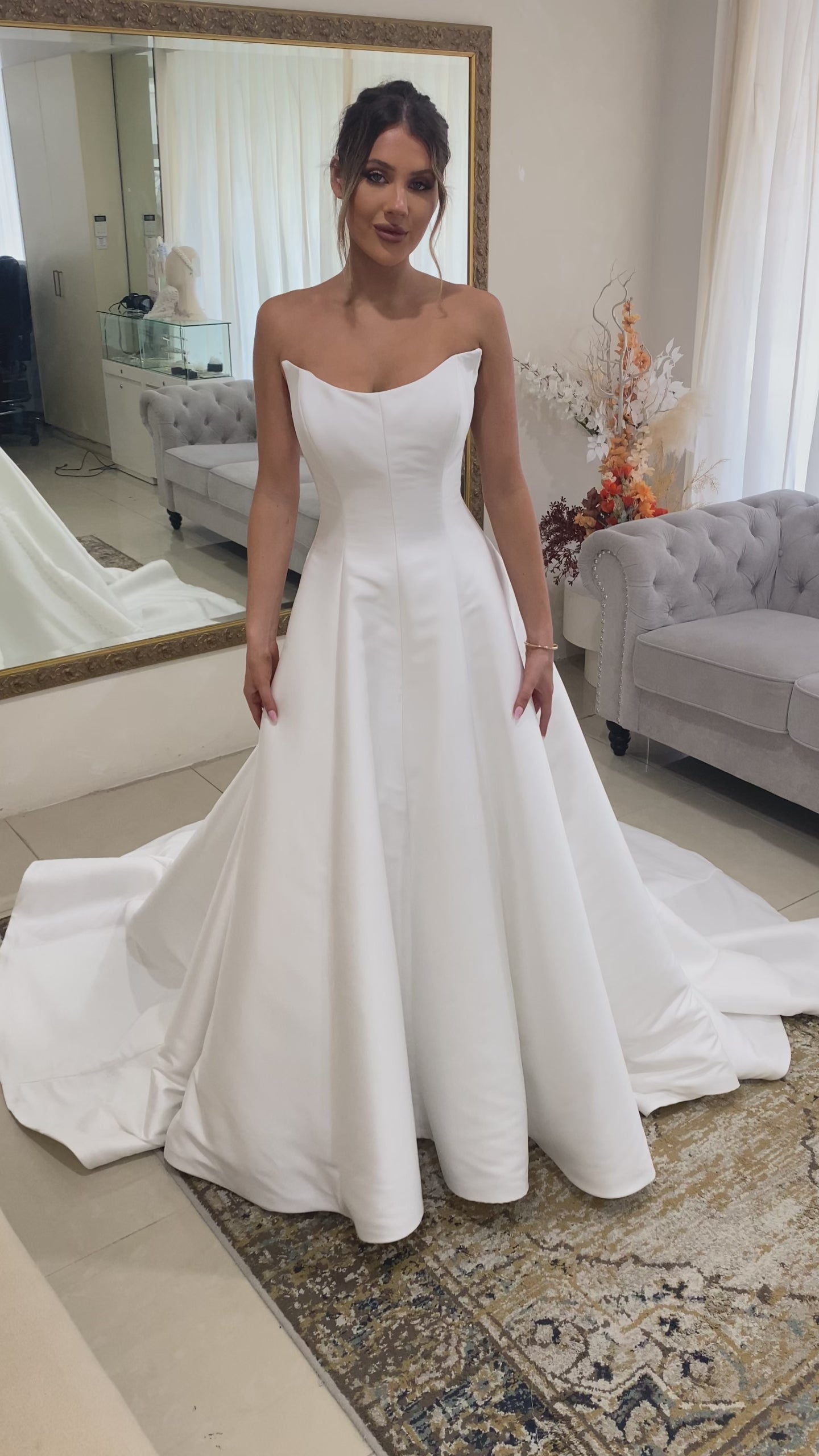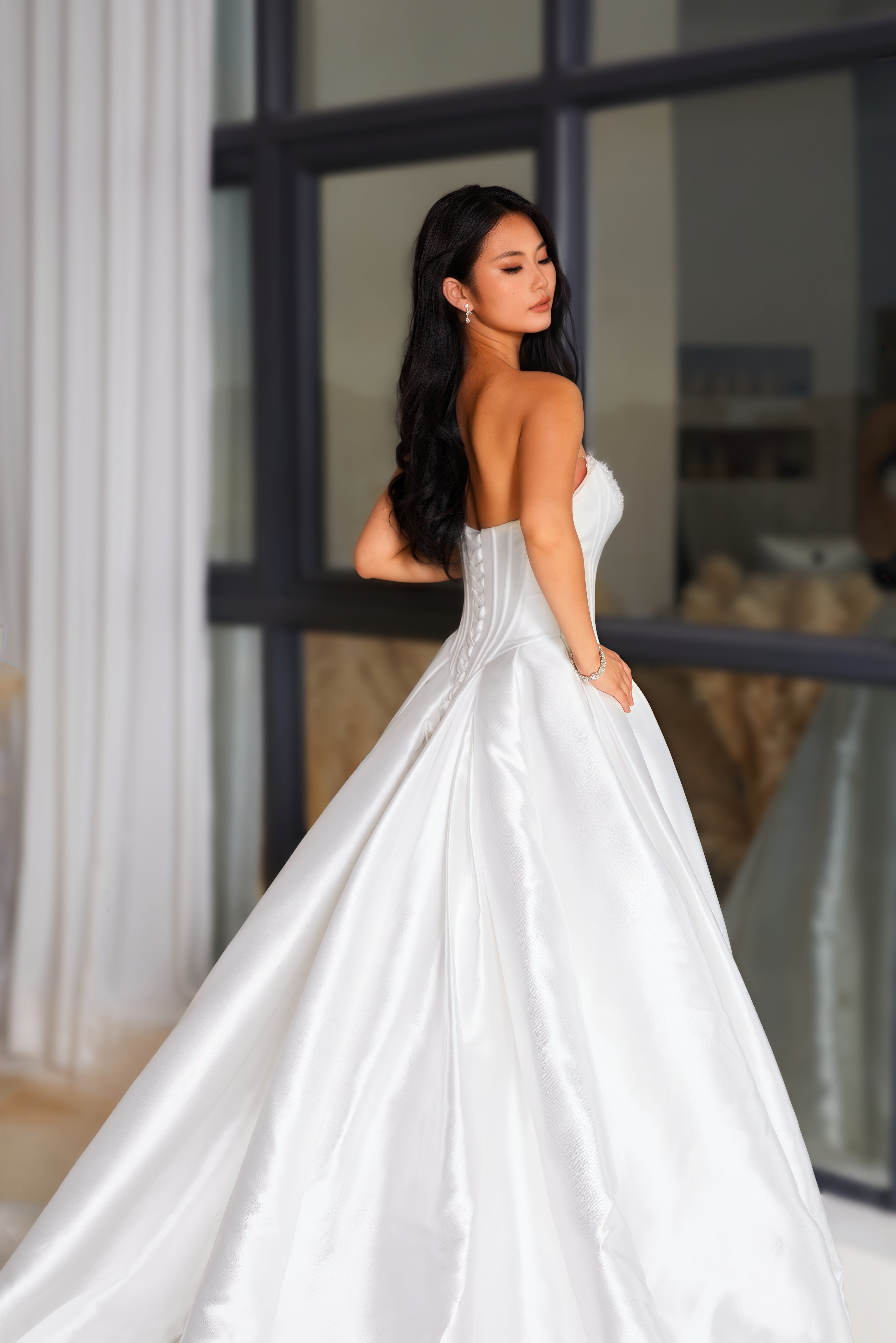 Christina Rossiβs collection of A-line gowns includes timeless, elegant, modern & chic gowns to dresses that are perfect for any wedding theme. The A-line cut flatters a variety of body types, providing a perfect blend of comfort and sophistication. Whether you envision a minimalistic design with clean lines or a more elaborate gown with intricate lace and embellishments, our collection offers something for every bride.