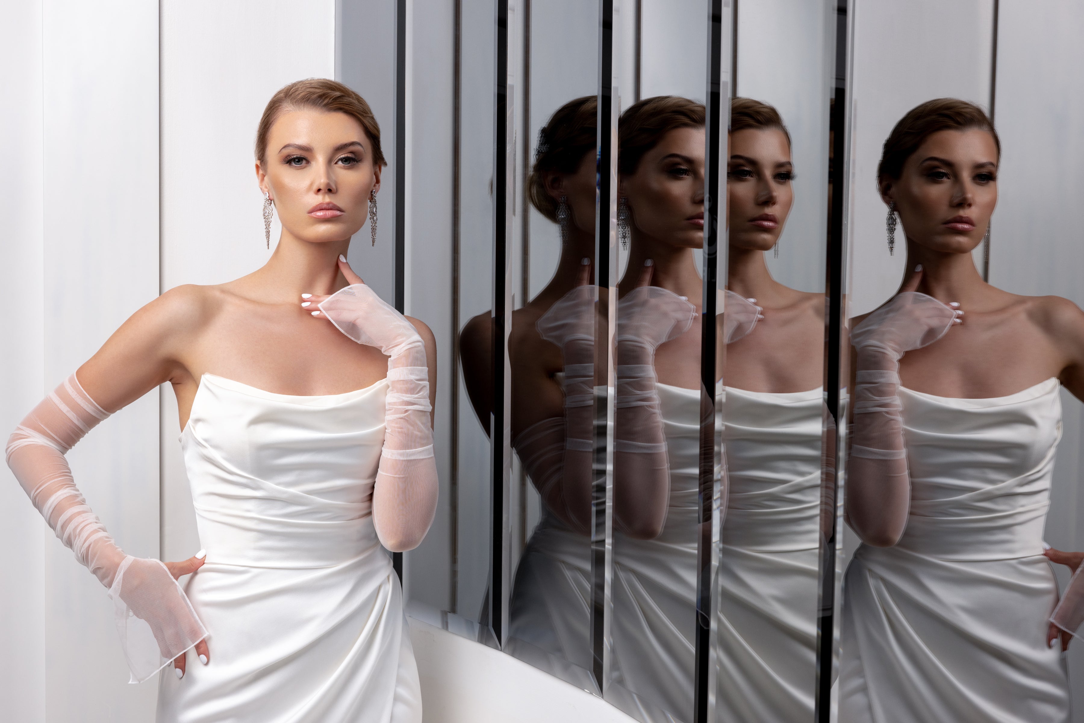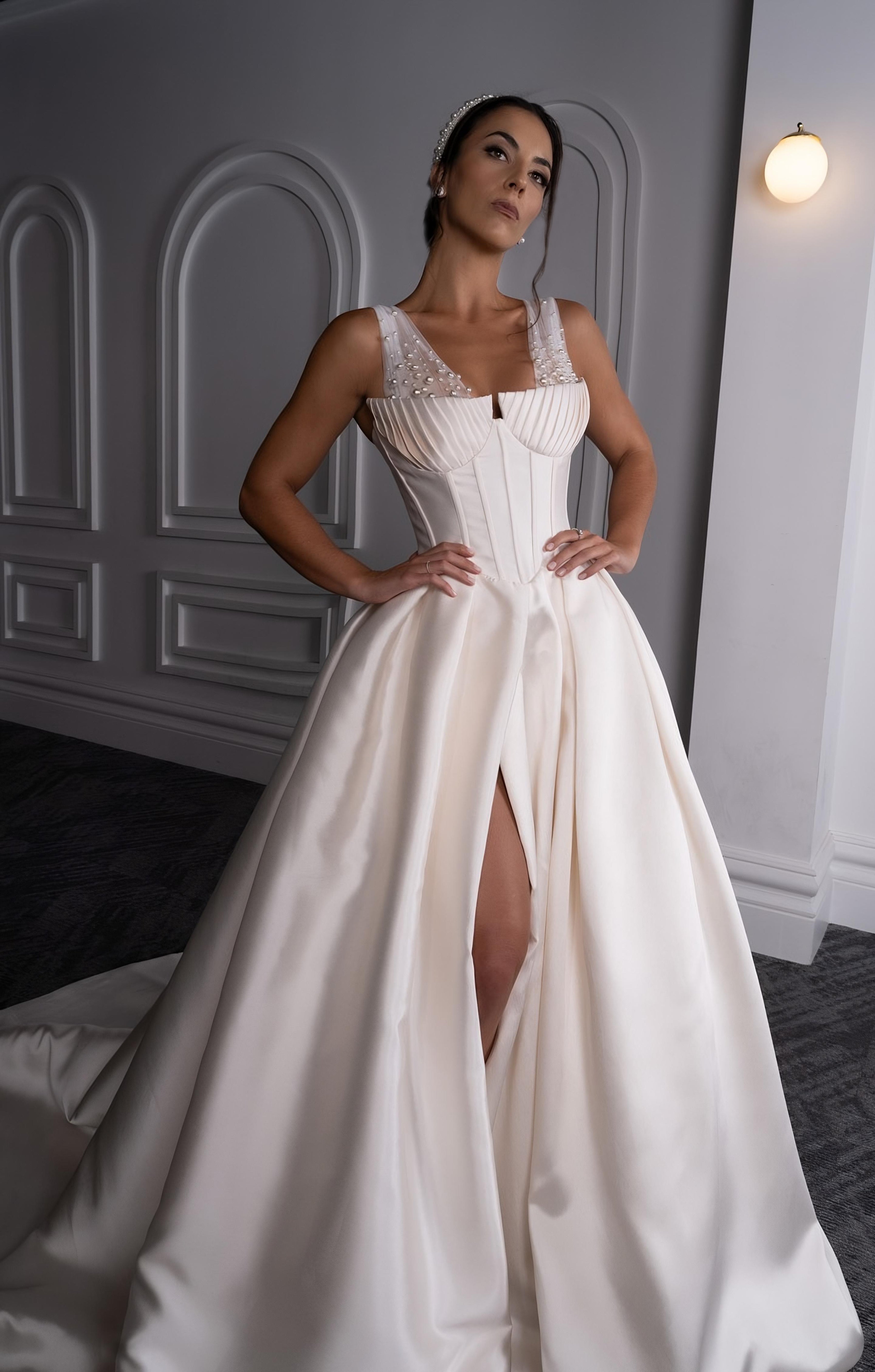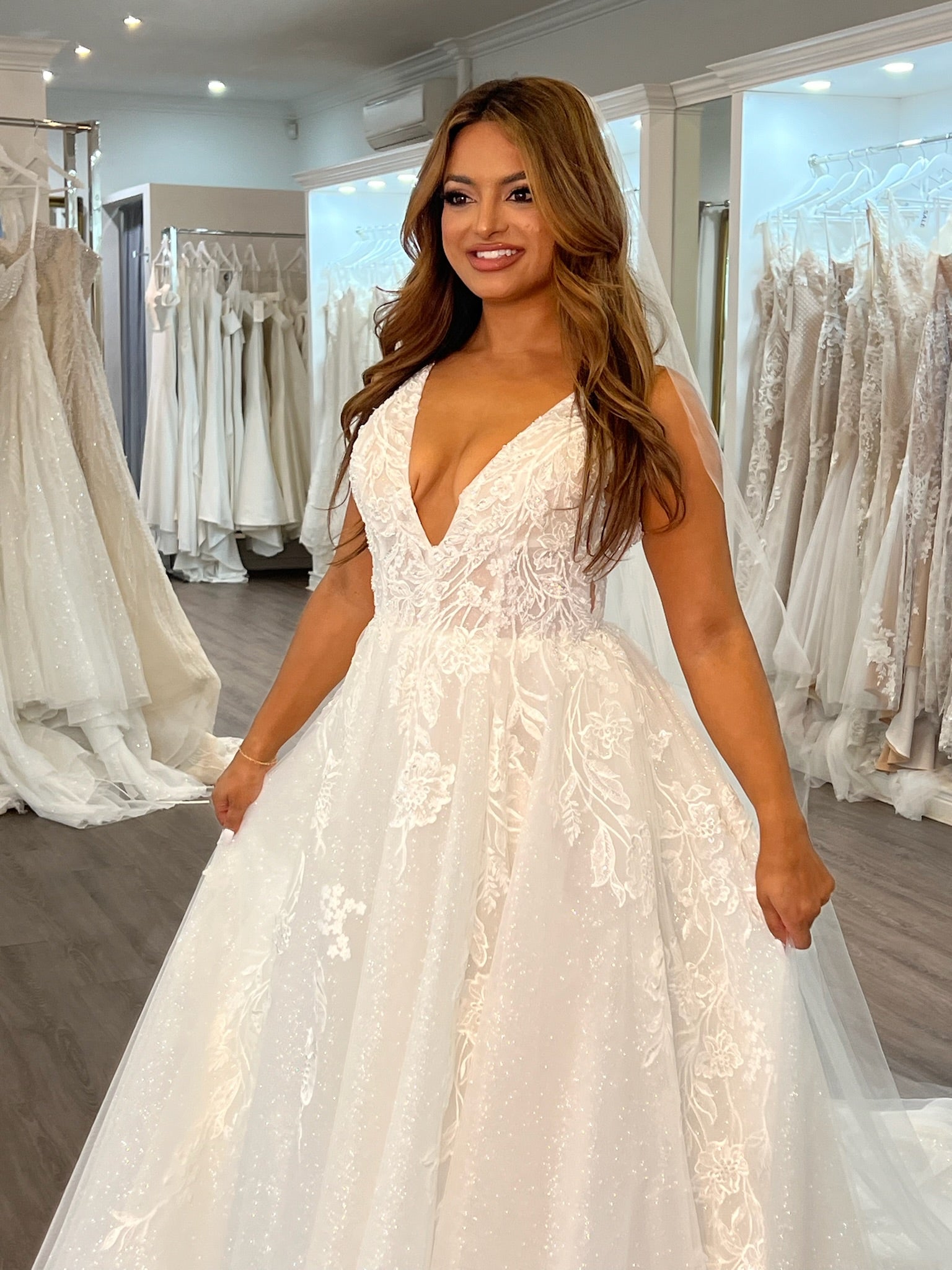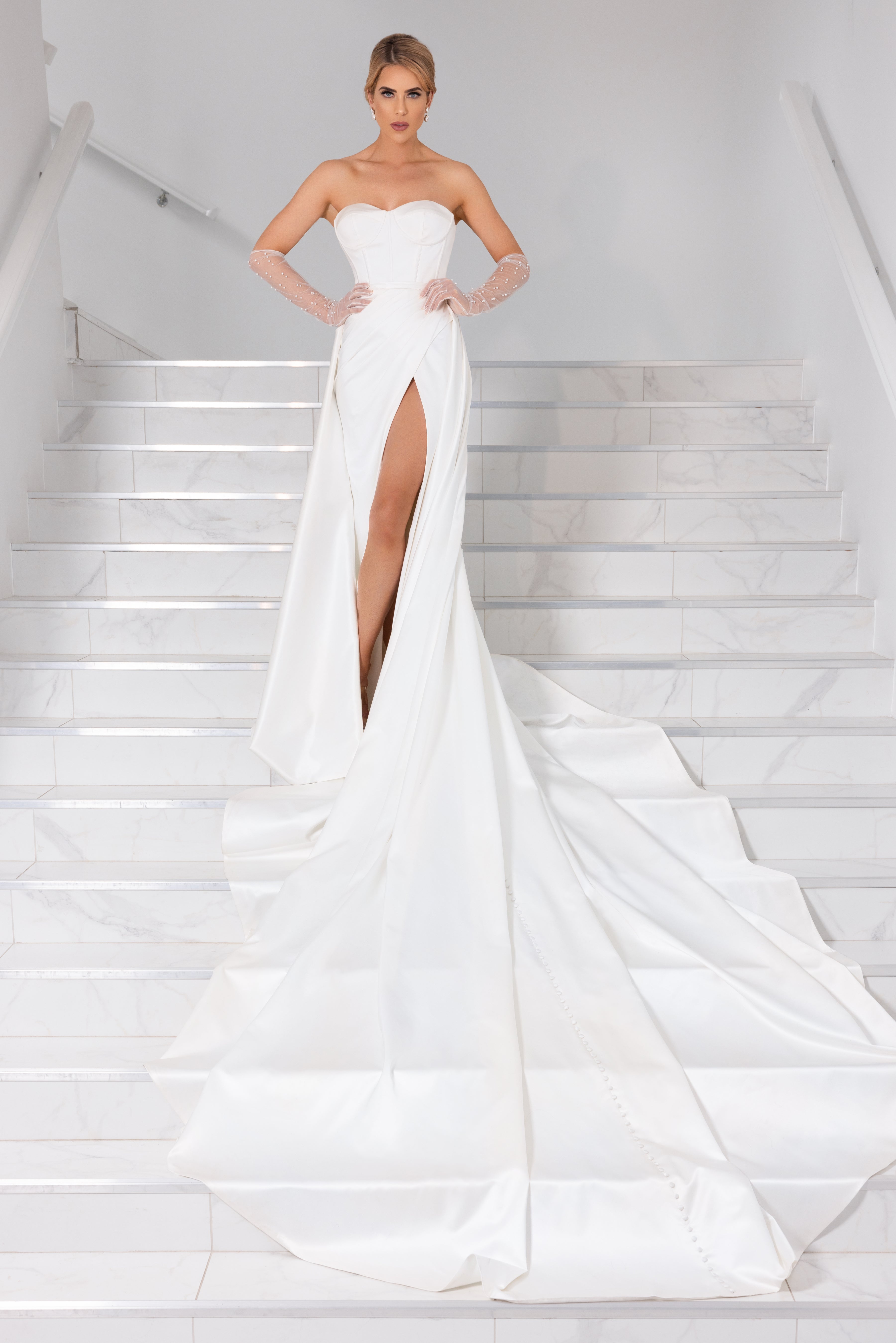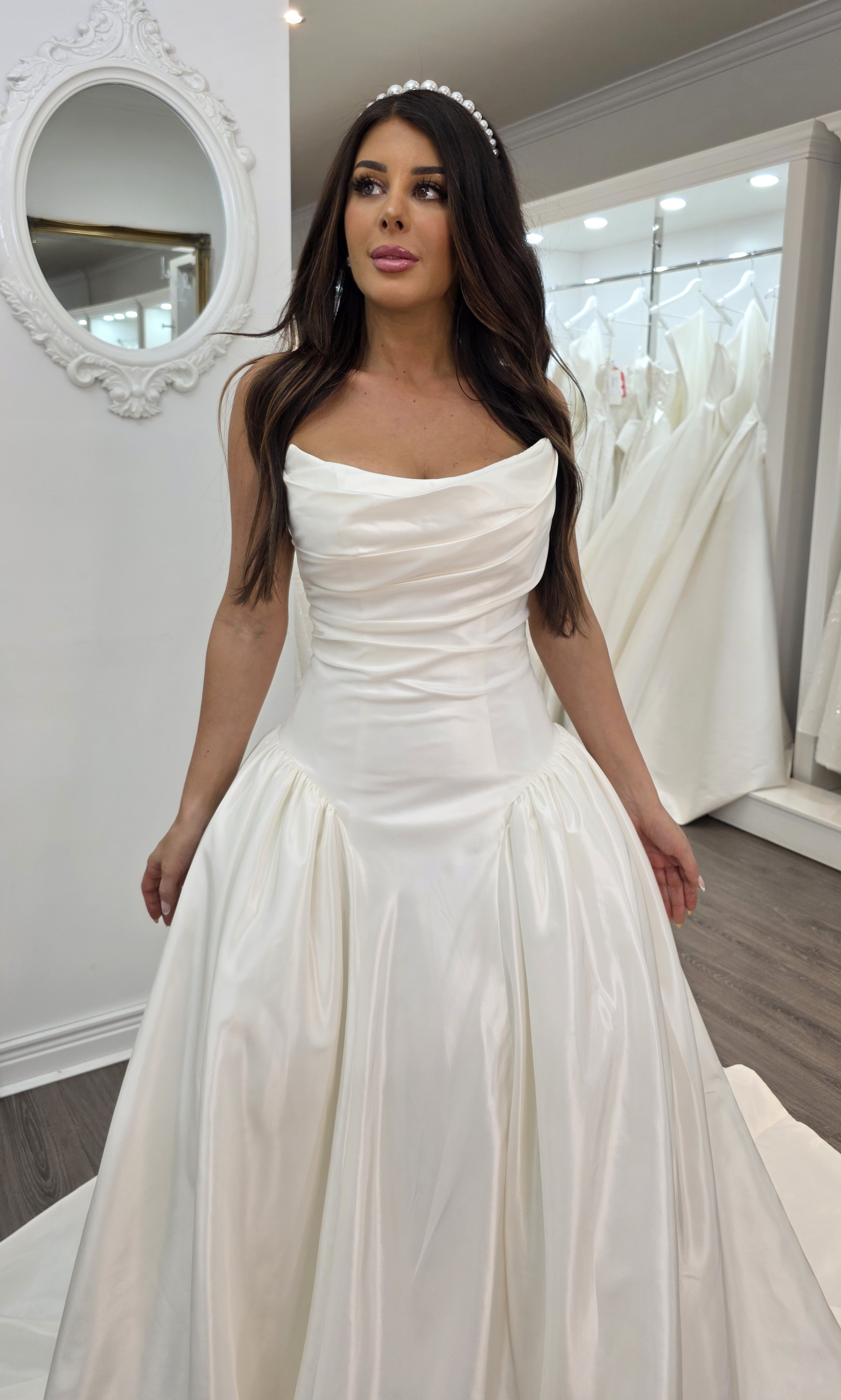 Christina Rossiβs collection of A-line gowns includes timeless, elegant, modern & chic gowns to dresses that are perfect for any wedding theme. The A-line cut flatters a variety of body types, providing a perfect blend of comfort and sophistication. Whether you envision a minimalistic design with clean lines or a more elaborate gown with intricate lace and embellishments, our collection offers something for every bride.