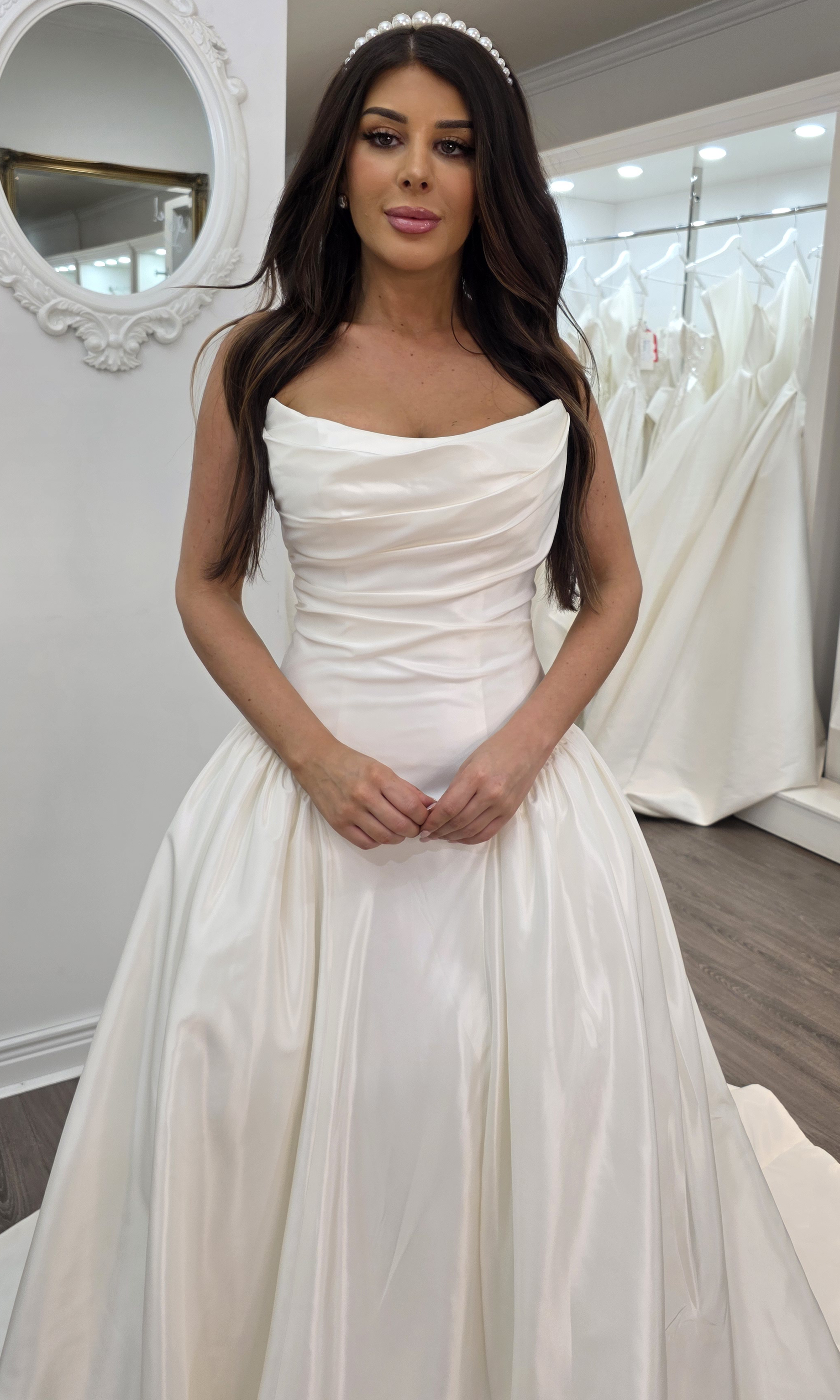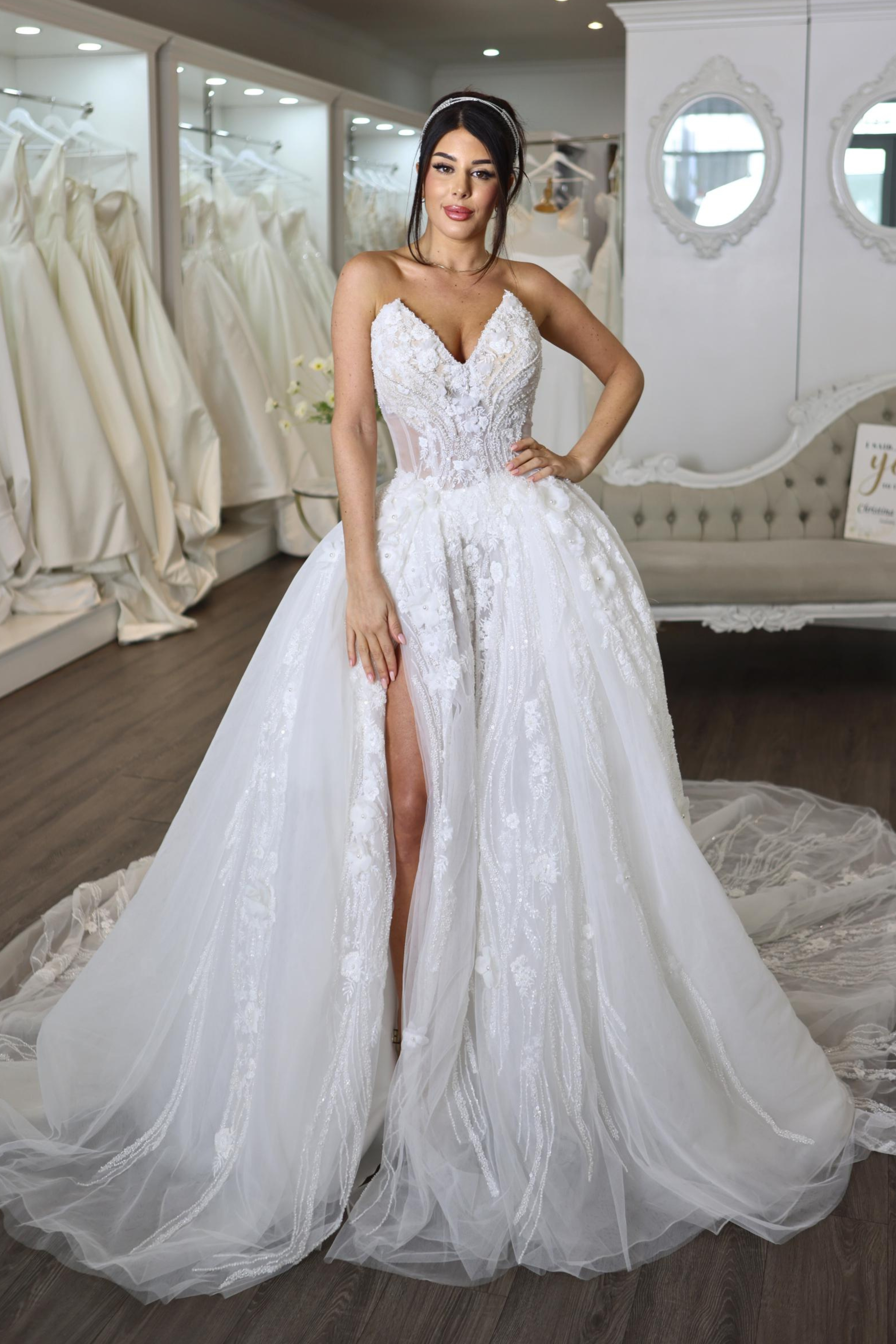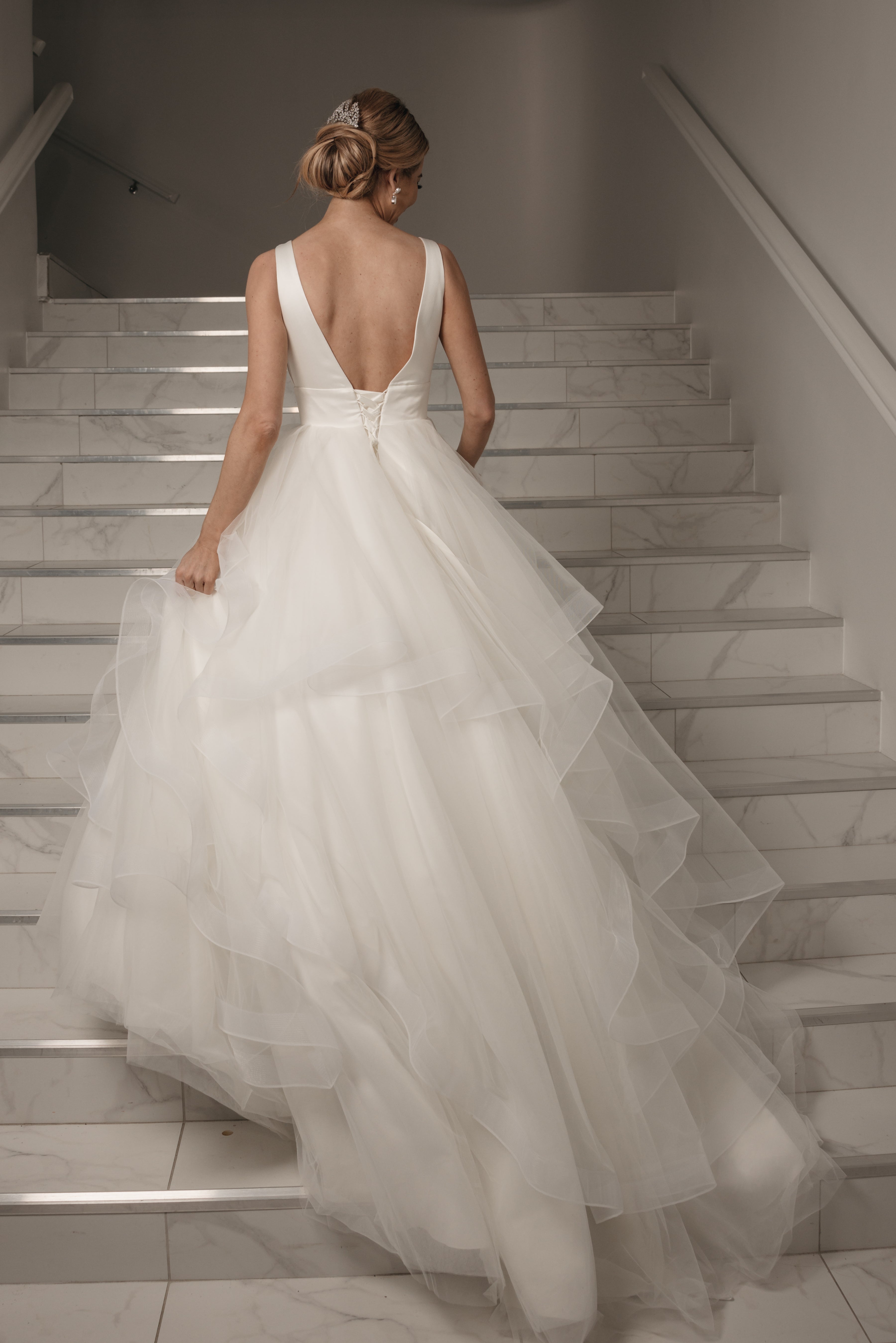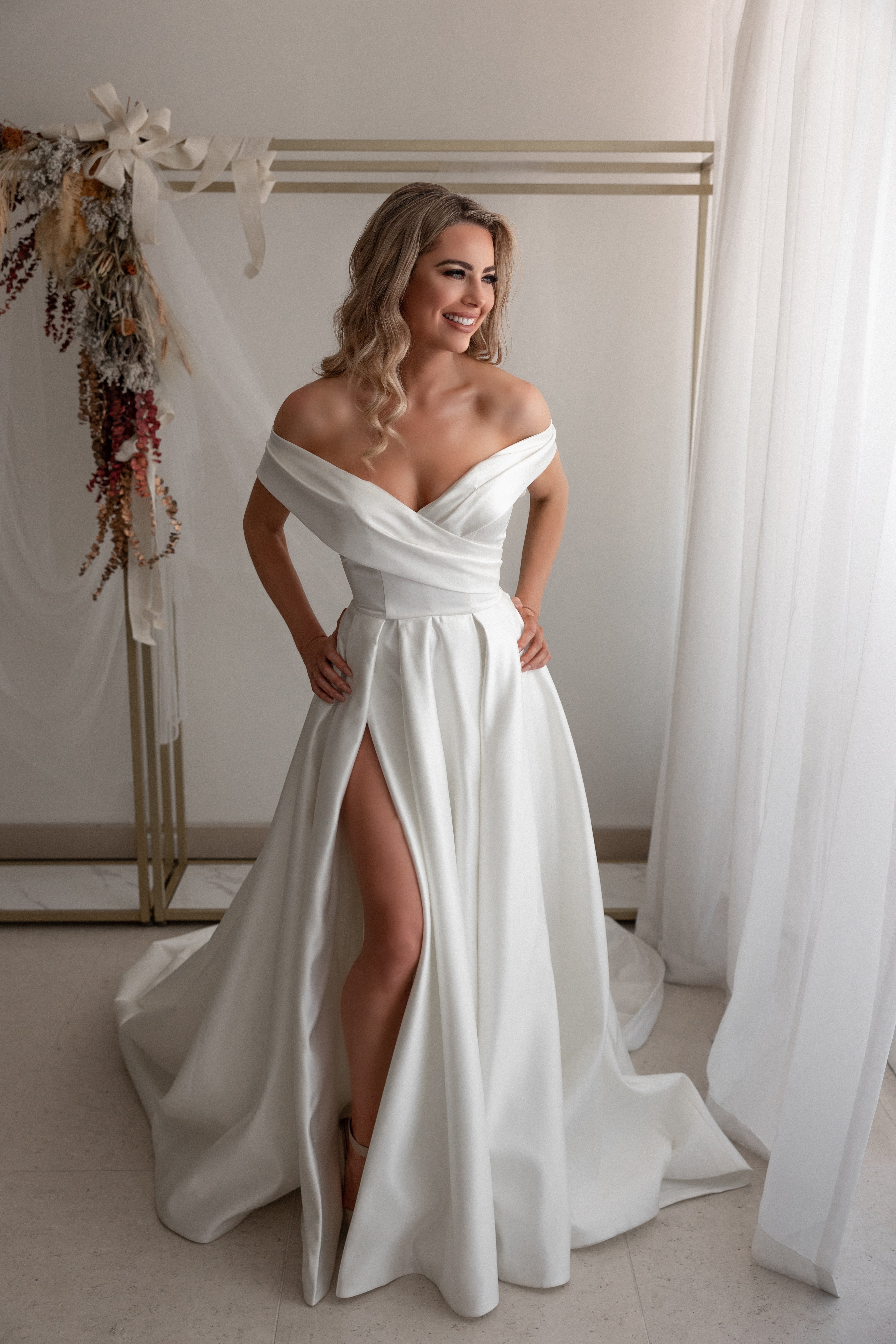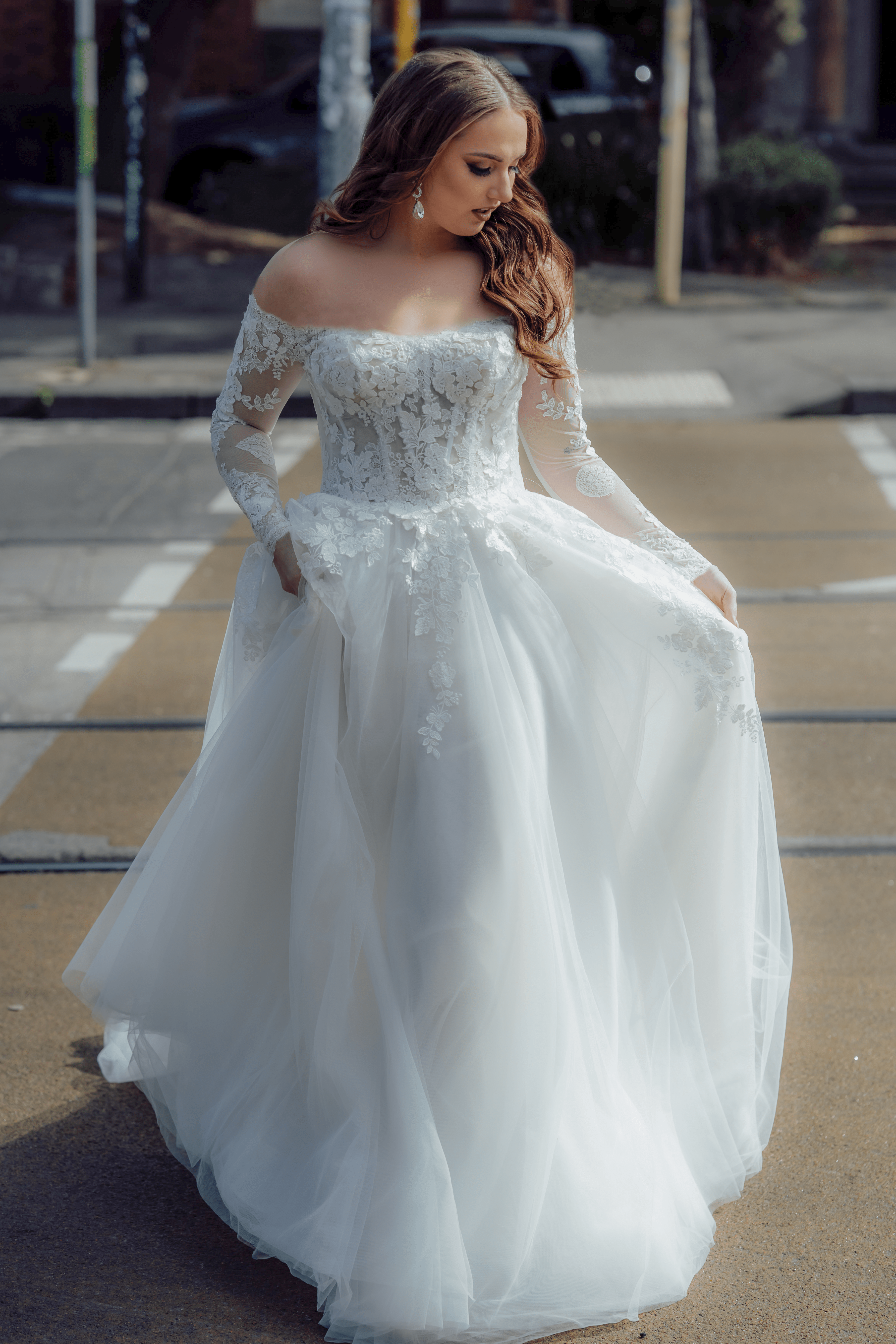 Christina Rossiβs collection of A-line gowns includes timeless, elegant, modern & chic gowns to dresses that are perfect for any wedding theme. The A-line cut flatters a variety of body types, providing a perfect blend of comfort and sophistication. Whether you envision a minimalistic design with clean lines or a more elaborate gown with intricate lace and embellishments, our collection offers something for every bride.