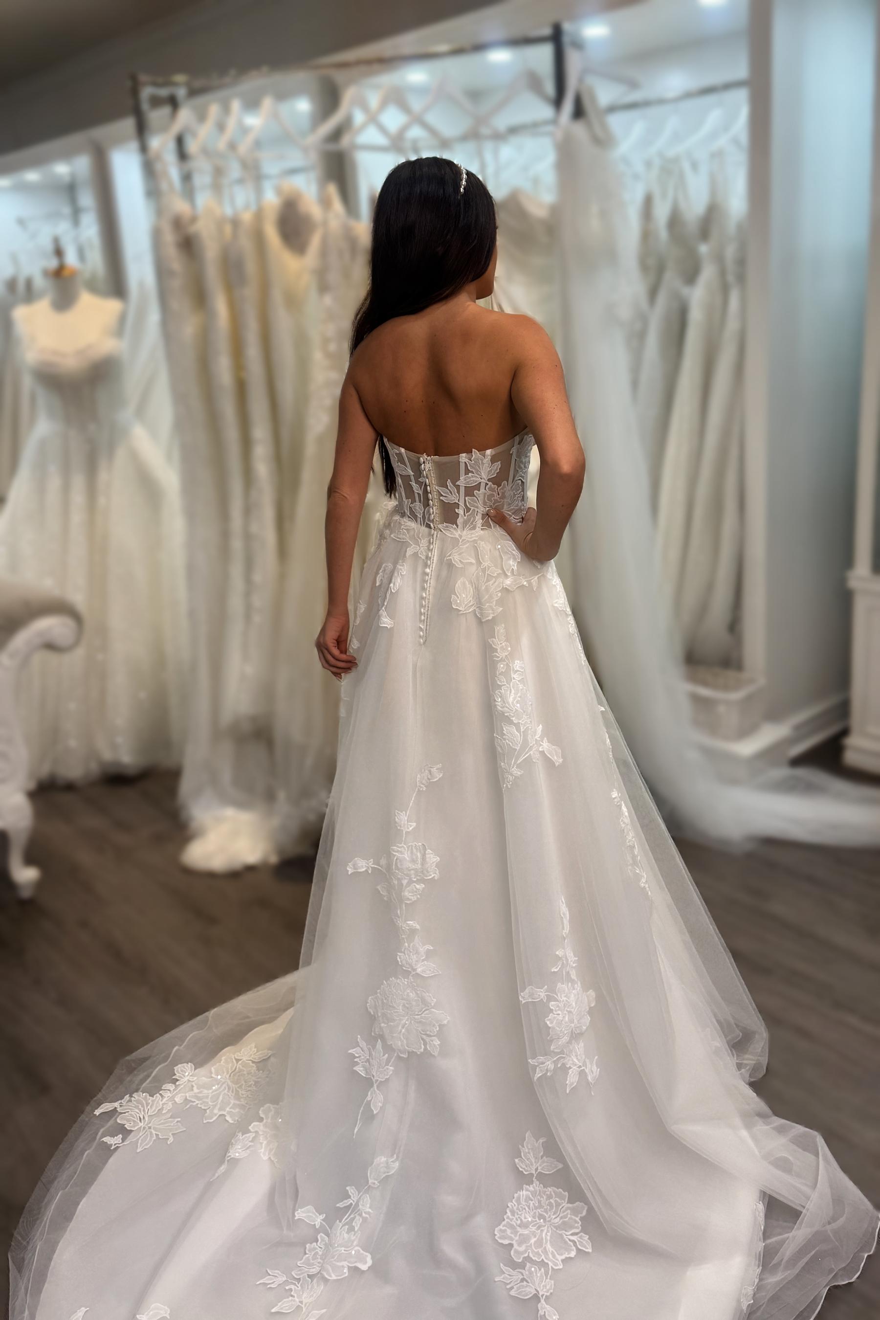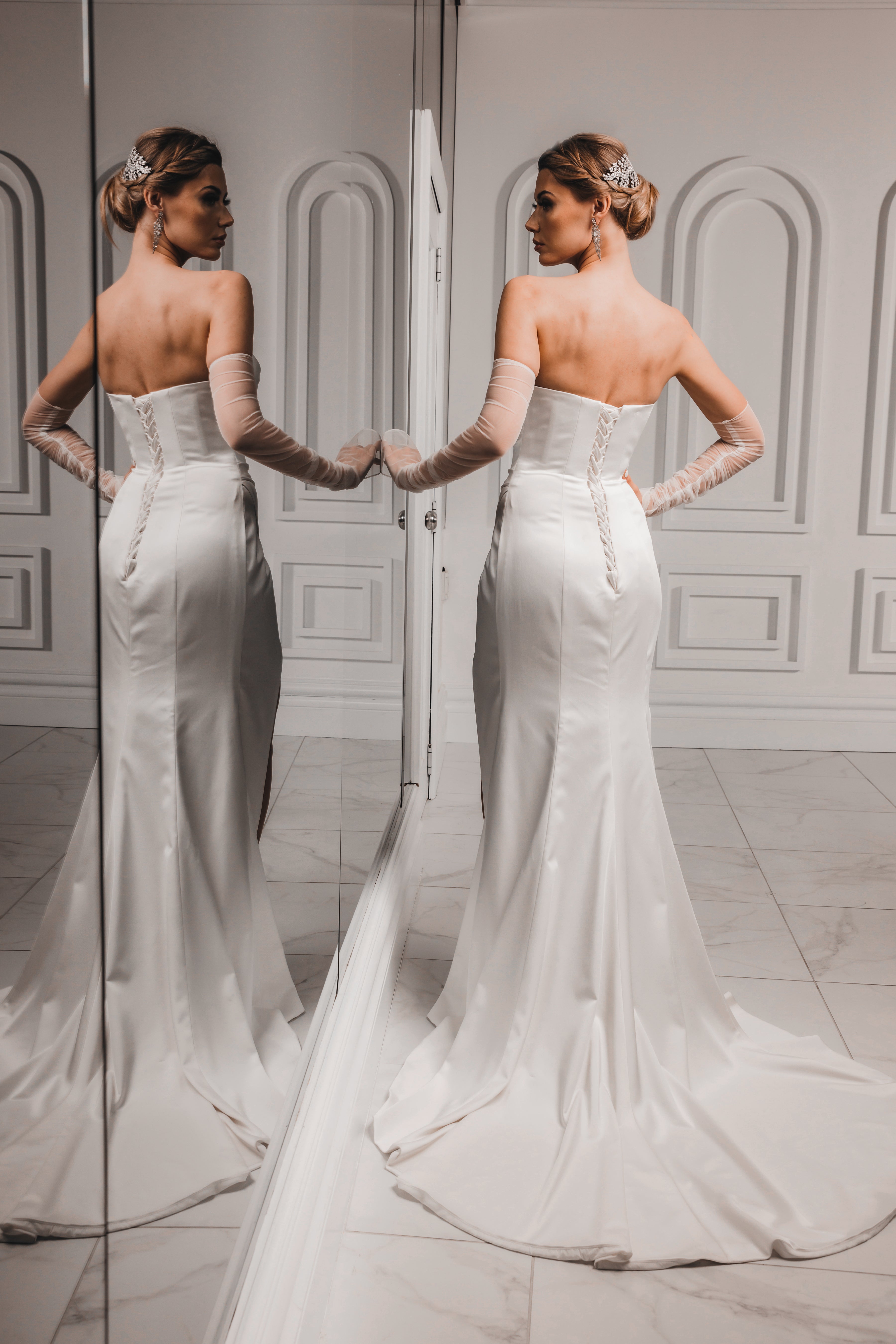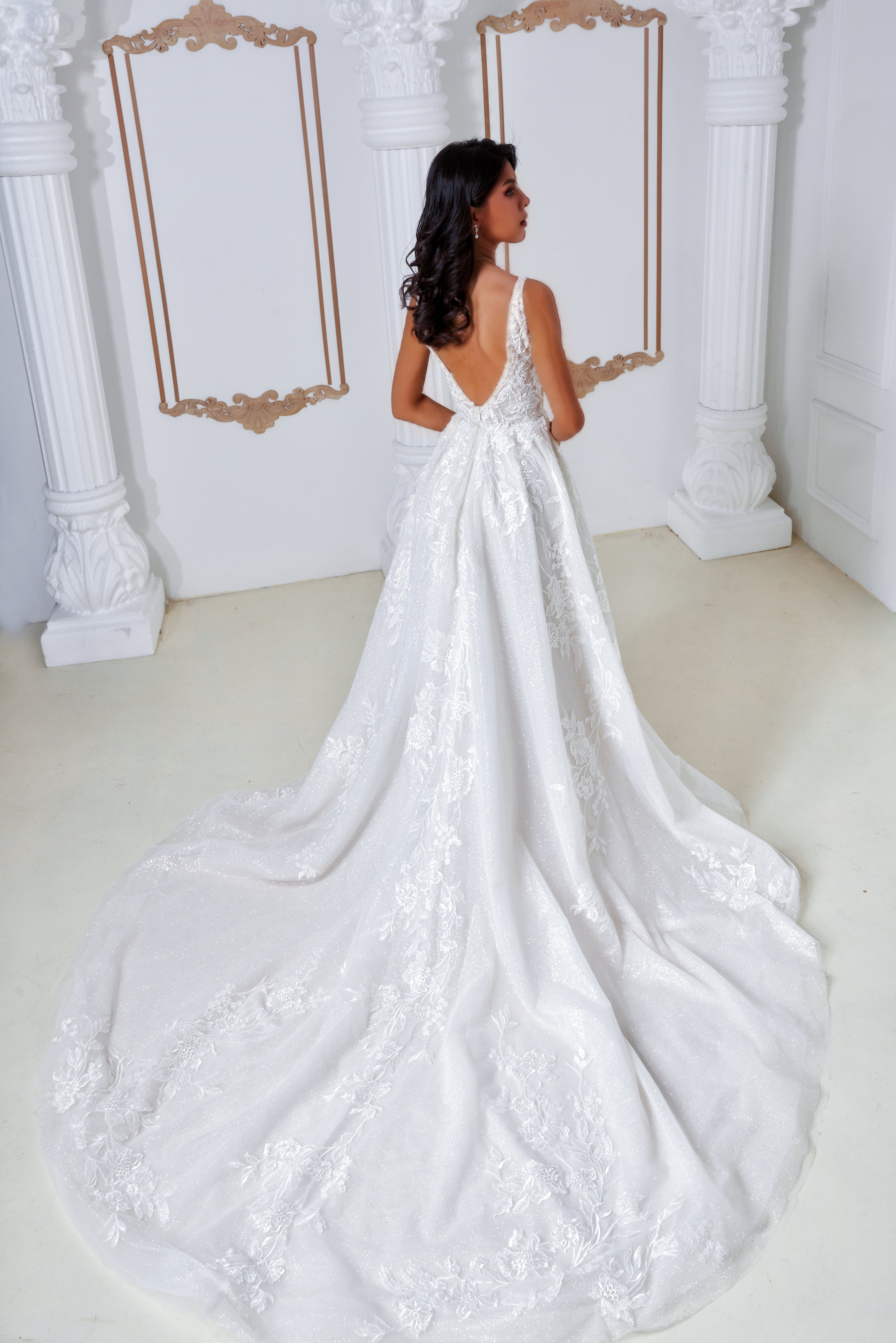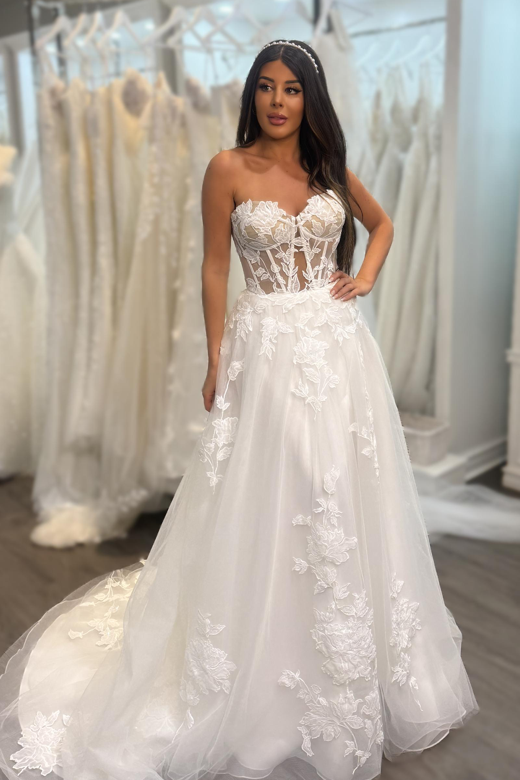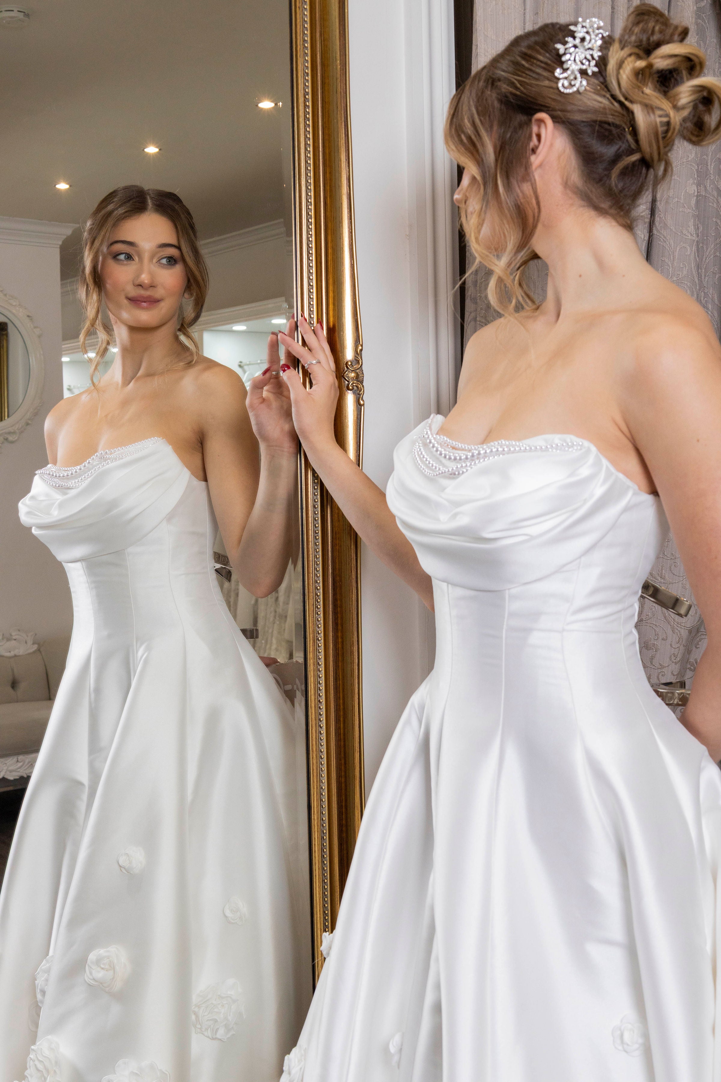 Christina Rossiβs collection of A-line gowns includes timeless, elegant, modern & chic gowns to dresses that are perfect for any wedding theme. The A-line cut flatters a variety of body types, providing a perfect blend of comfort and sophistication. Whether you envision a minimalistic design with clean lines or a more elaborate gown with intricate lace and embellishments, our collection offers something for every bride.