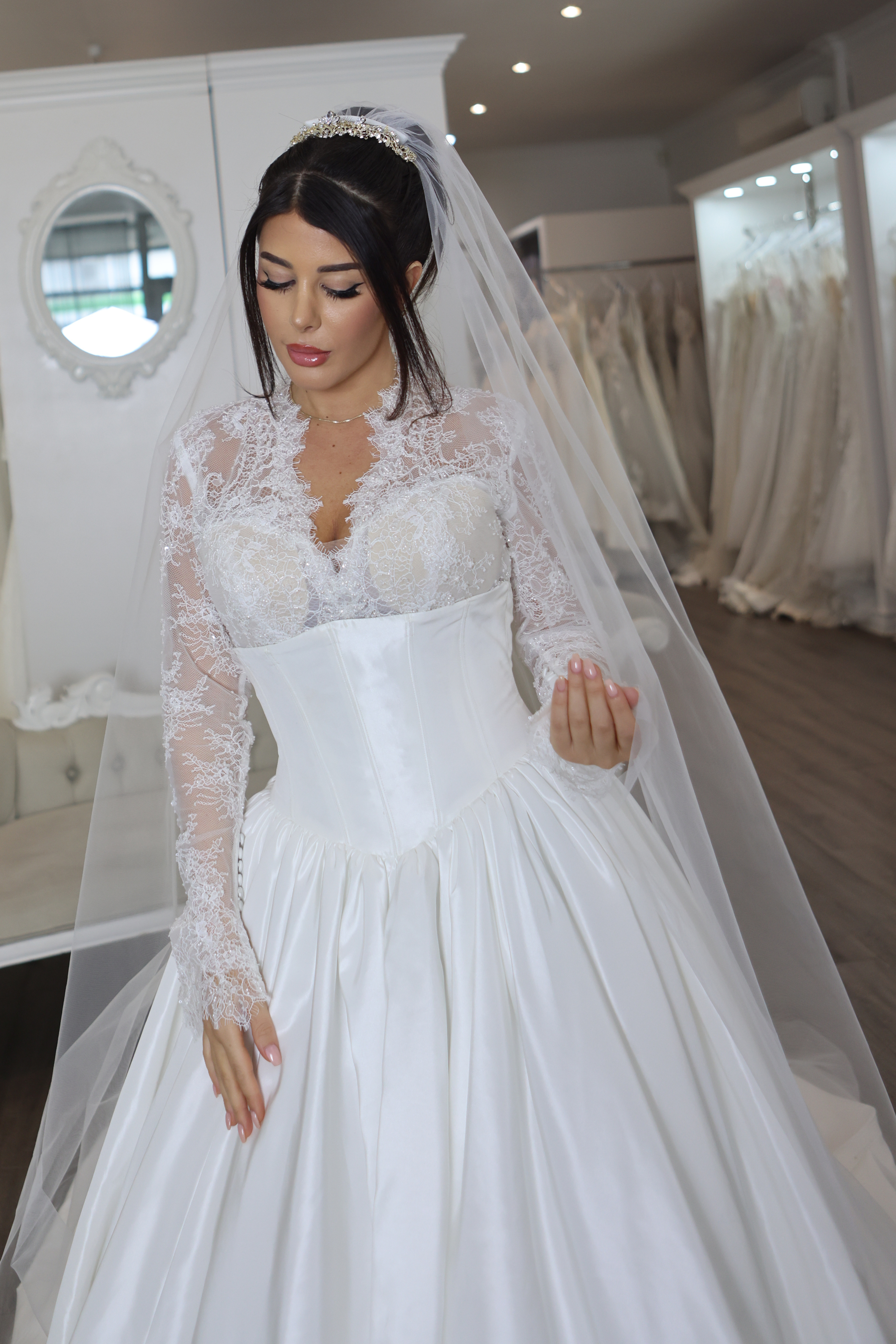 Finished with a cathedral-length veil and a crystal-embellished headpiece, this look is perfect for brides seeking an elevated, regal style with intricate detail. The mix of textures—romantic lace and lustrous satin—adds depth and drama to a gown designed to leave a lasting impression.