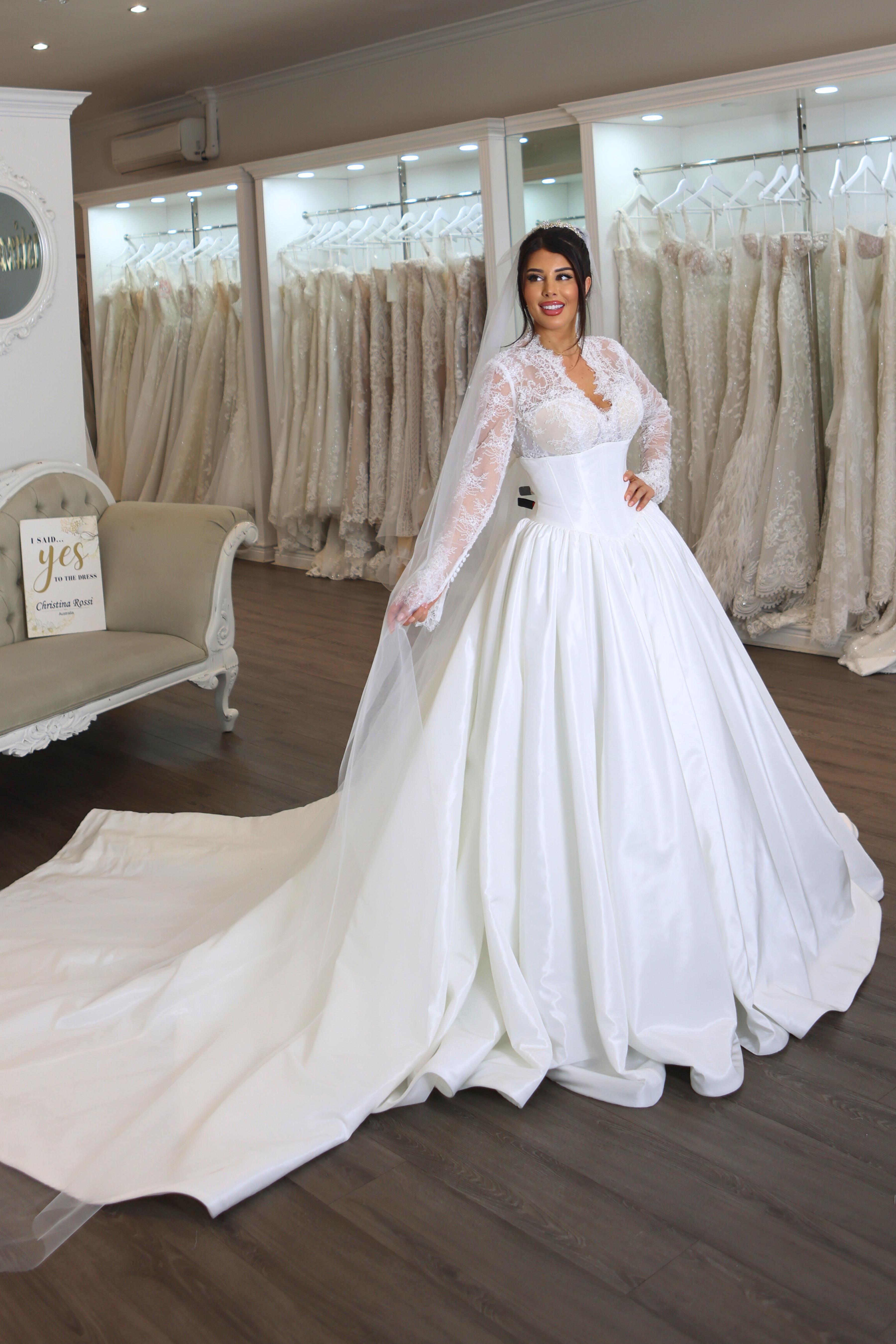 This custom mix-and-match wedding gown is a vision of timeless elegance and royal sophistication. Featuring a delicate lace bodice with a high neckline and long sleeves, the gown evokes classic bridal charm while offering a modern silhouette. The structured satin corset cinches the waist with sculpted precision, creating a flattering shape that flows into a voluminous, pleated skirt—dramatic yet graceful.