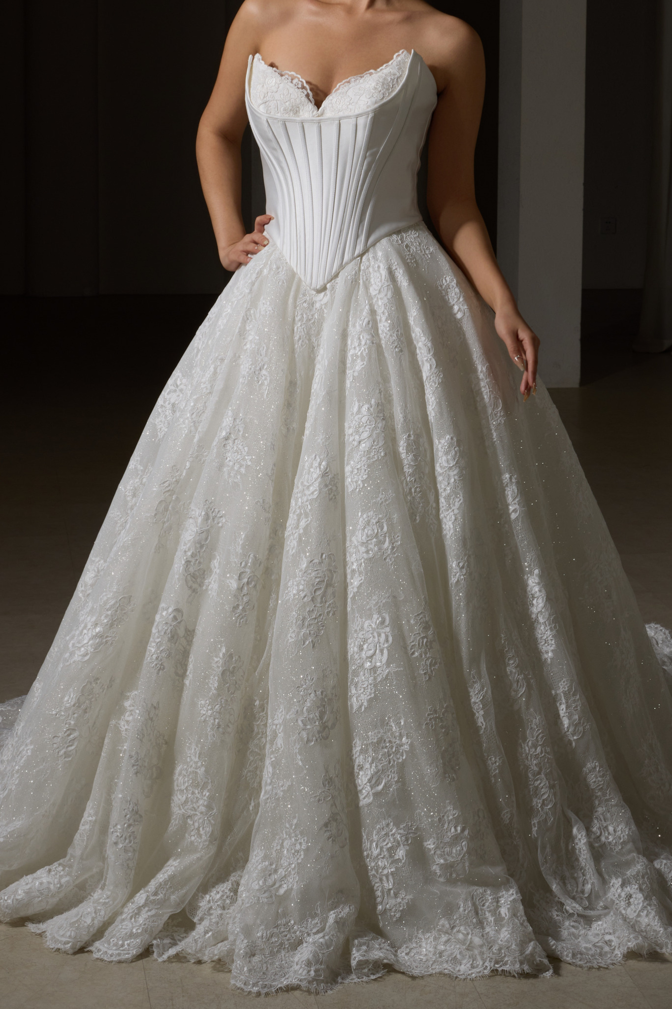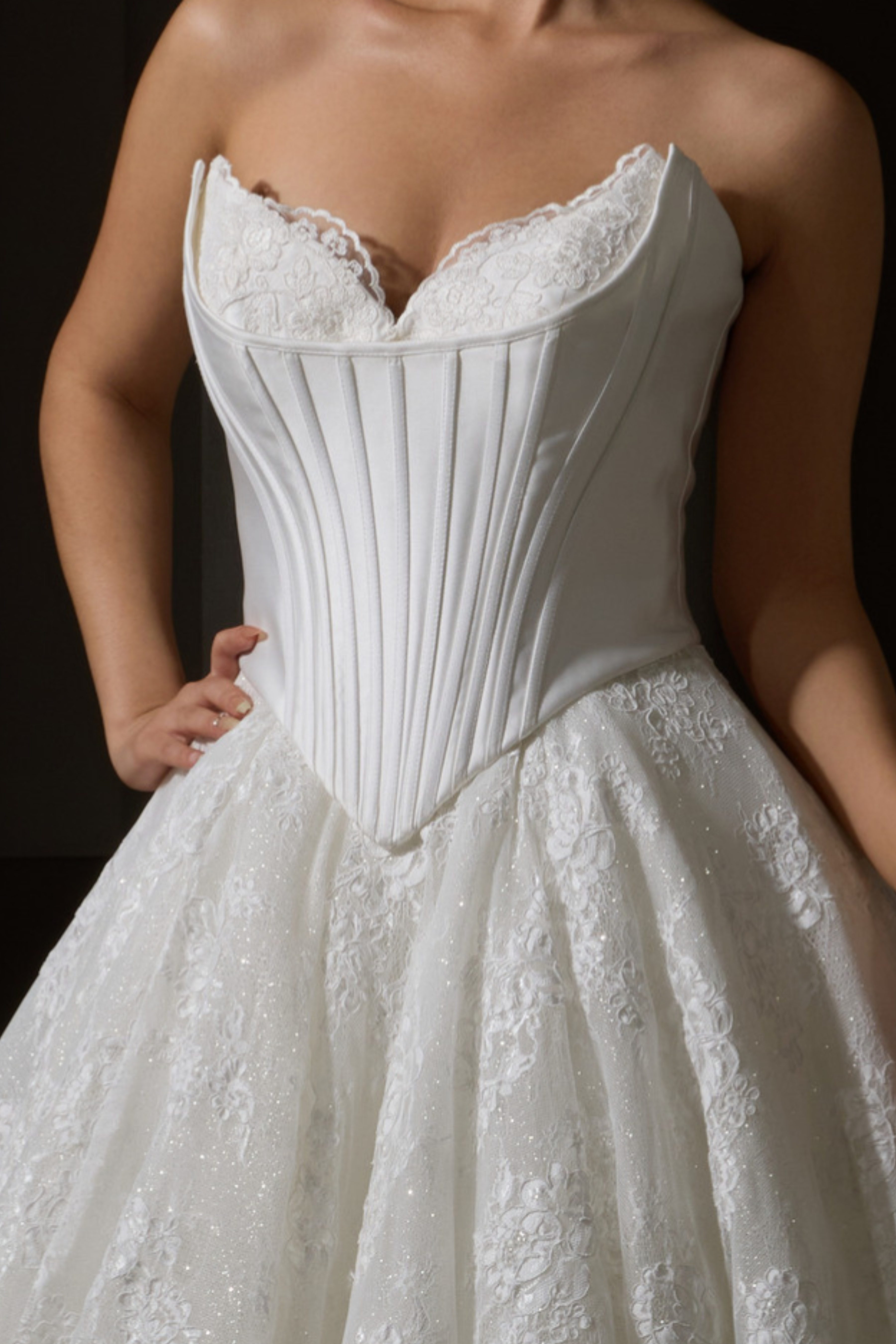 Transform into royalty with our breathtaking Isabella gown, an architectural masterpiece featuring a dramatic corset bodice and sweeping lace ballgown skirt. This stunning two-piece creation marries traditional elegance with modern sophistication.