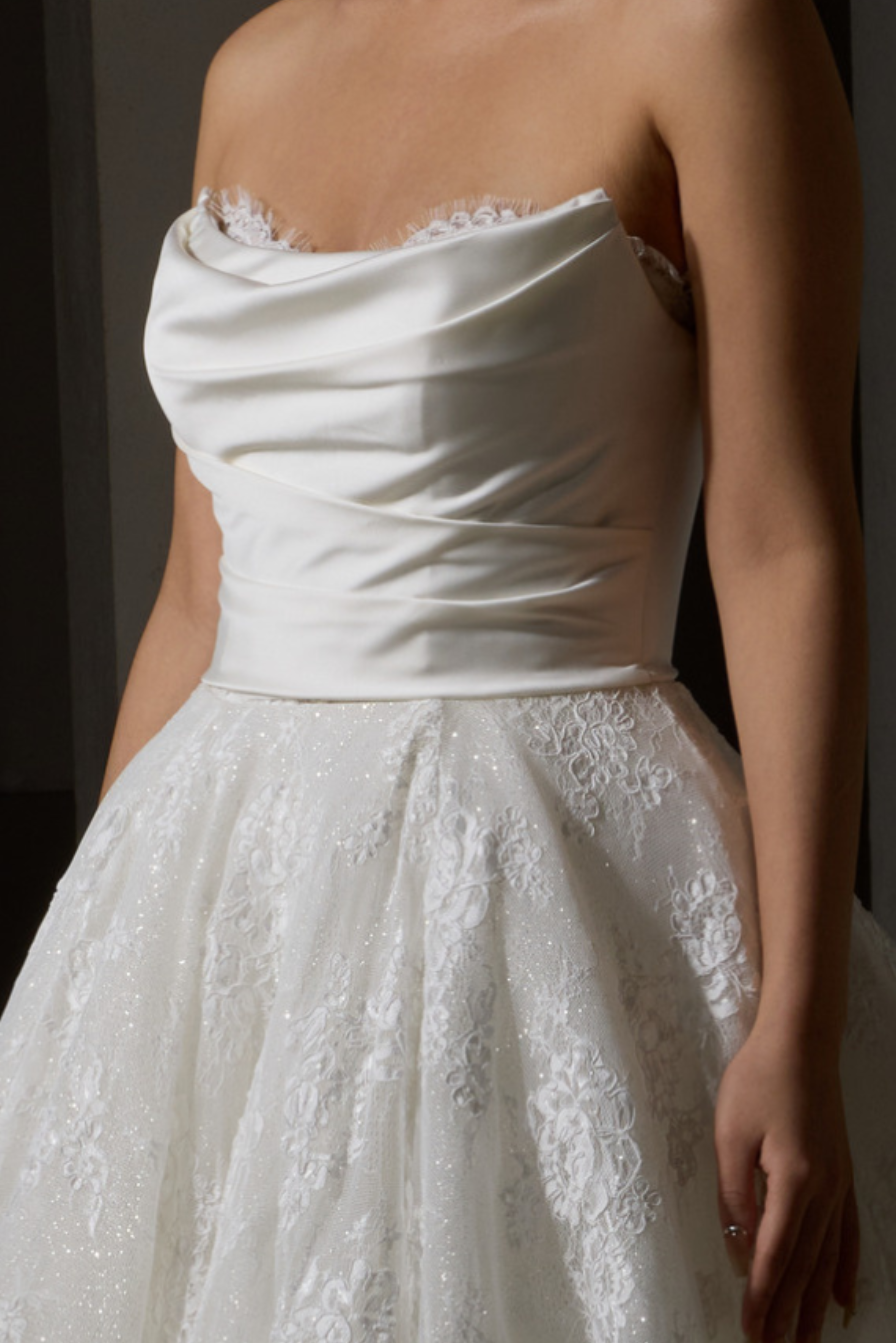 Make a statement in our exquisite Sophia two-piece ensemble, where modern minimalism meets timeless romance. This stunning combination features an architecturally draped bodice paired with a show-stopping lace ballgown skirt.