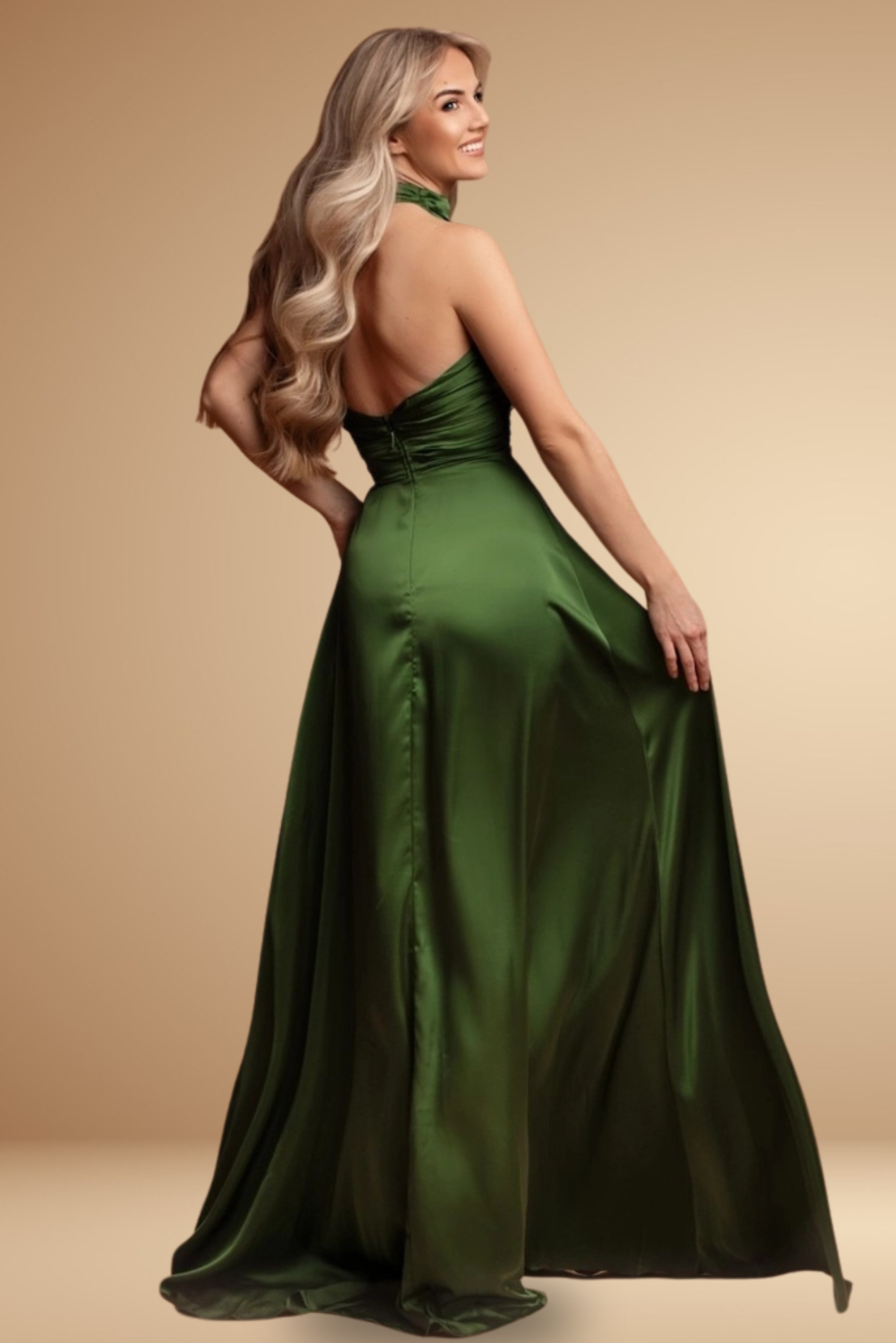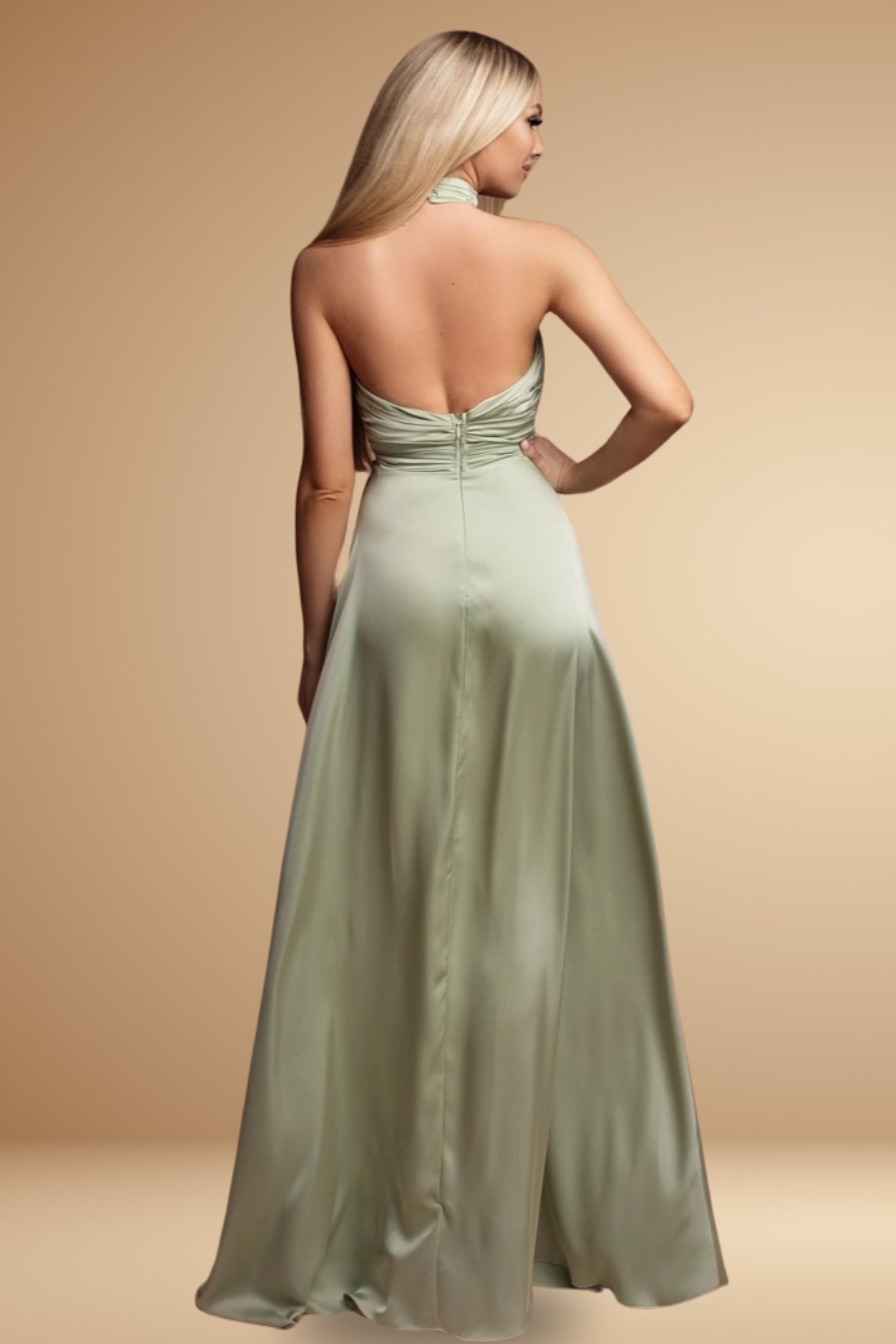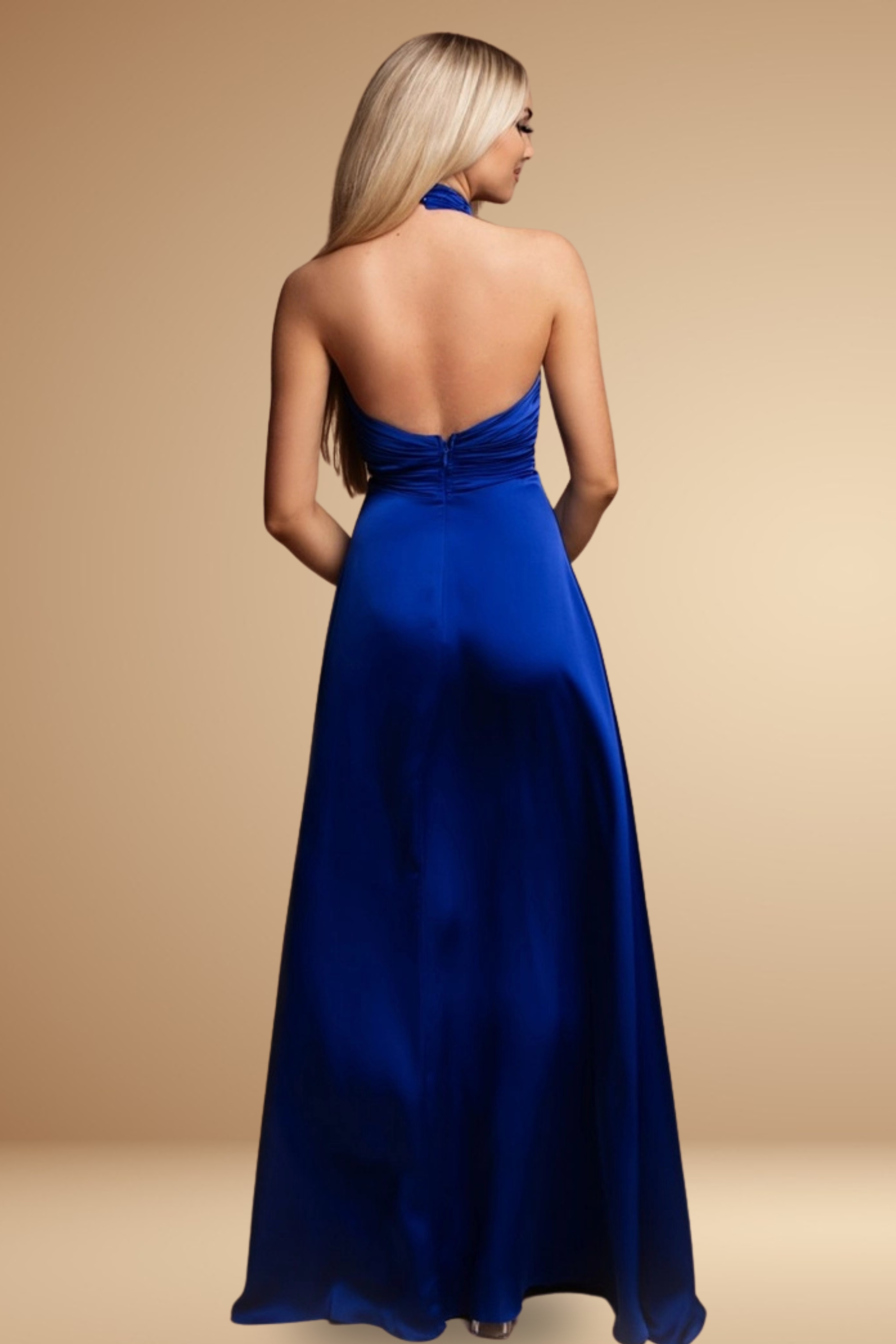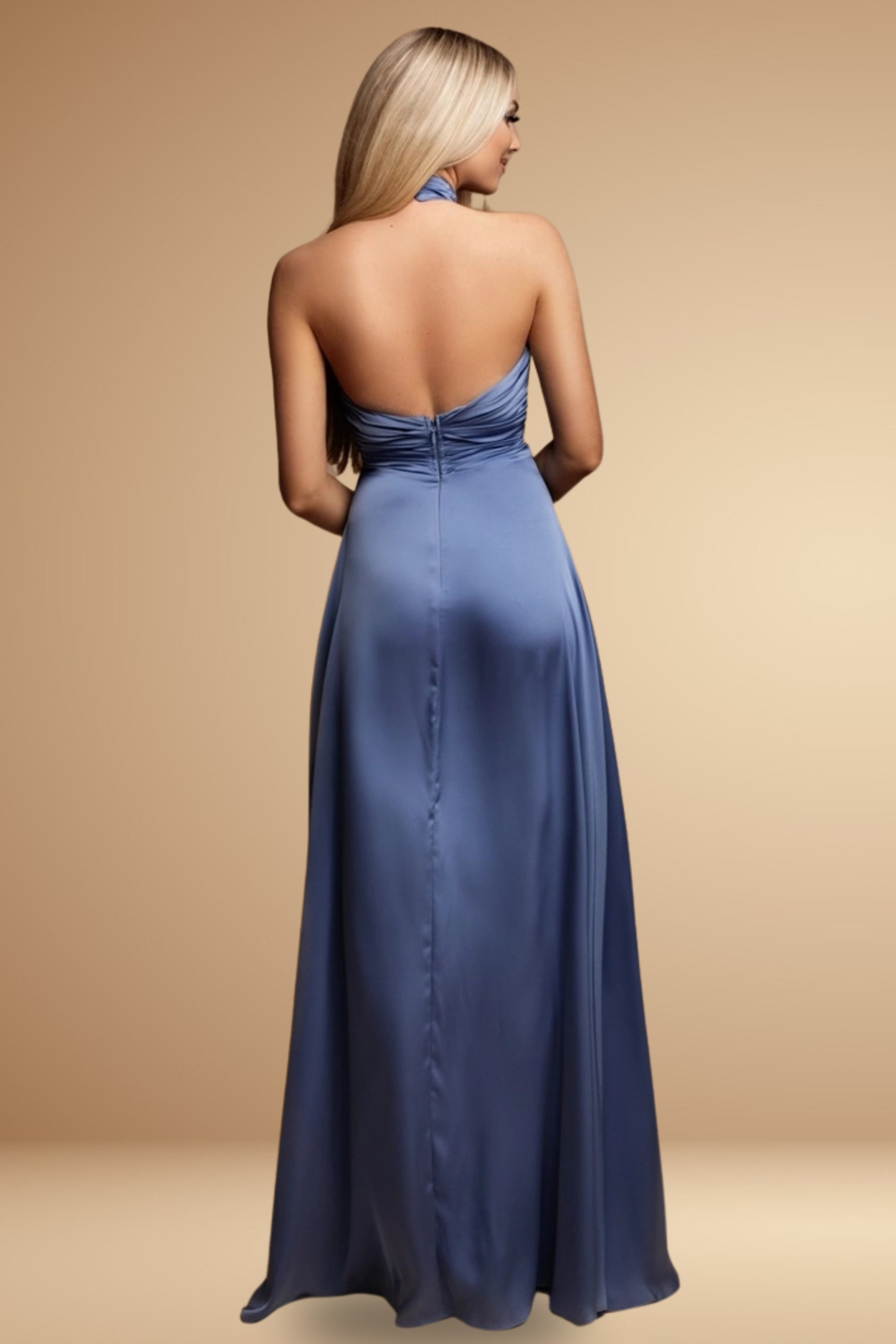 This evening dress features a slim fit that highlights the curves of the body gracefully. It is split up to the thigh, creating a sensual and daring look, while allowing great freedom of movement. The top of the dress reveals a magnificent open back, decorated with a discreet and elegant zipper that runs along the spine, adding a modern and chic touch.