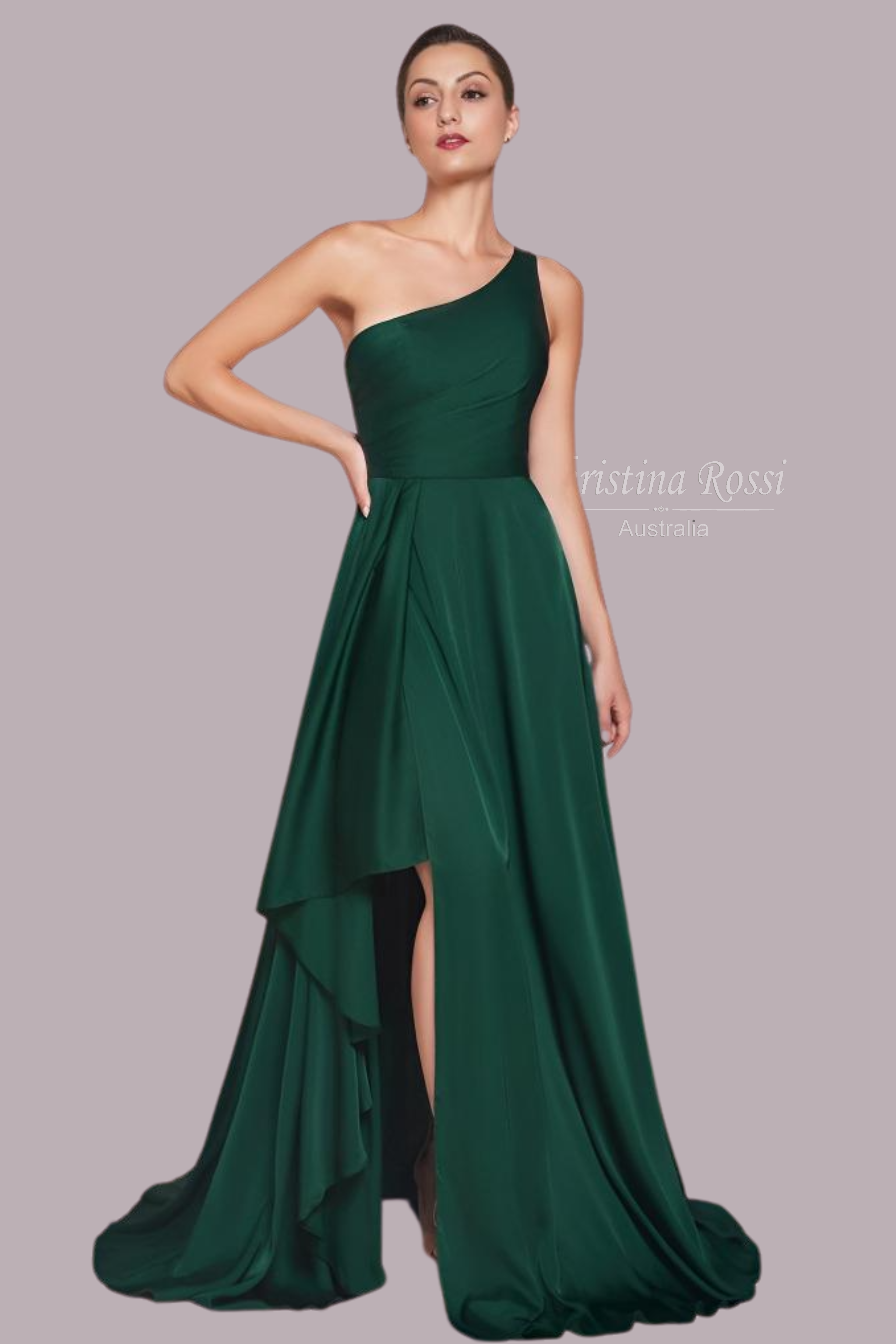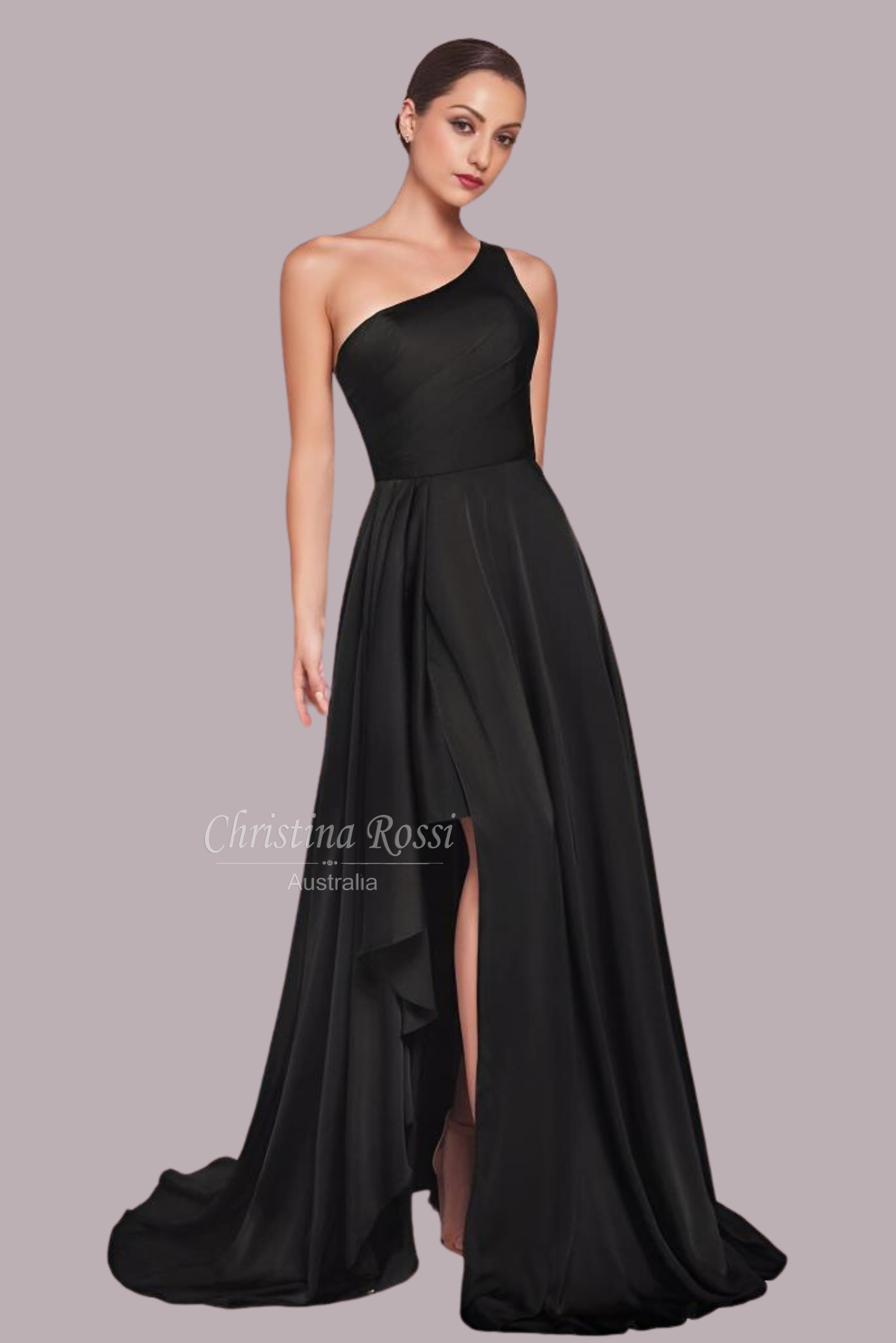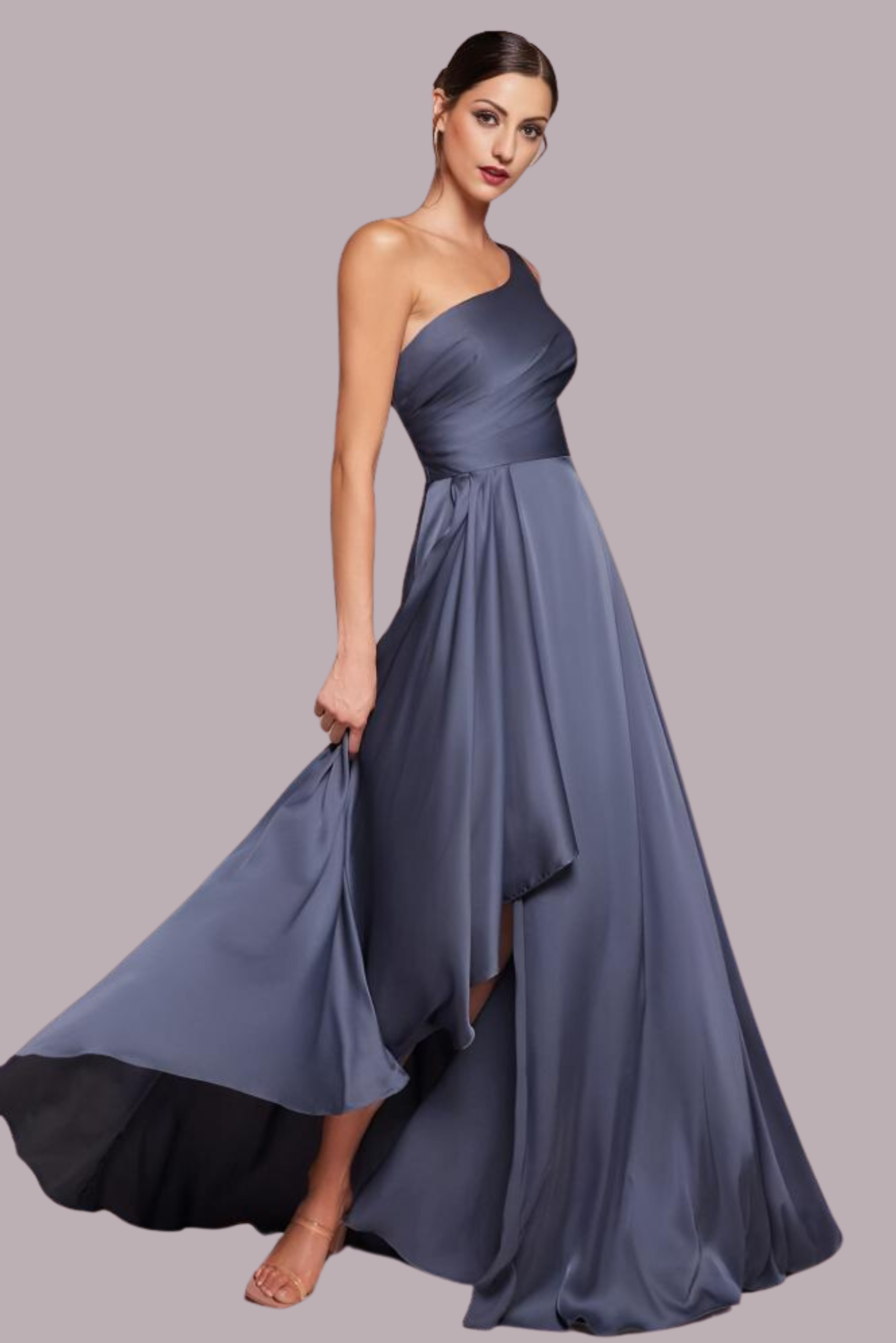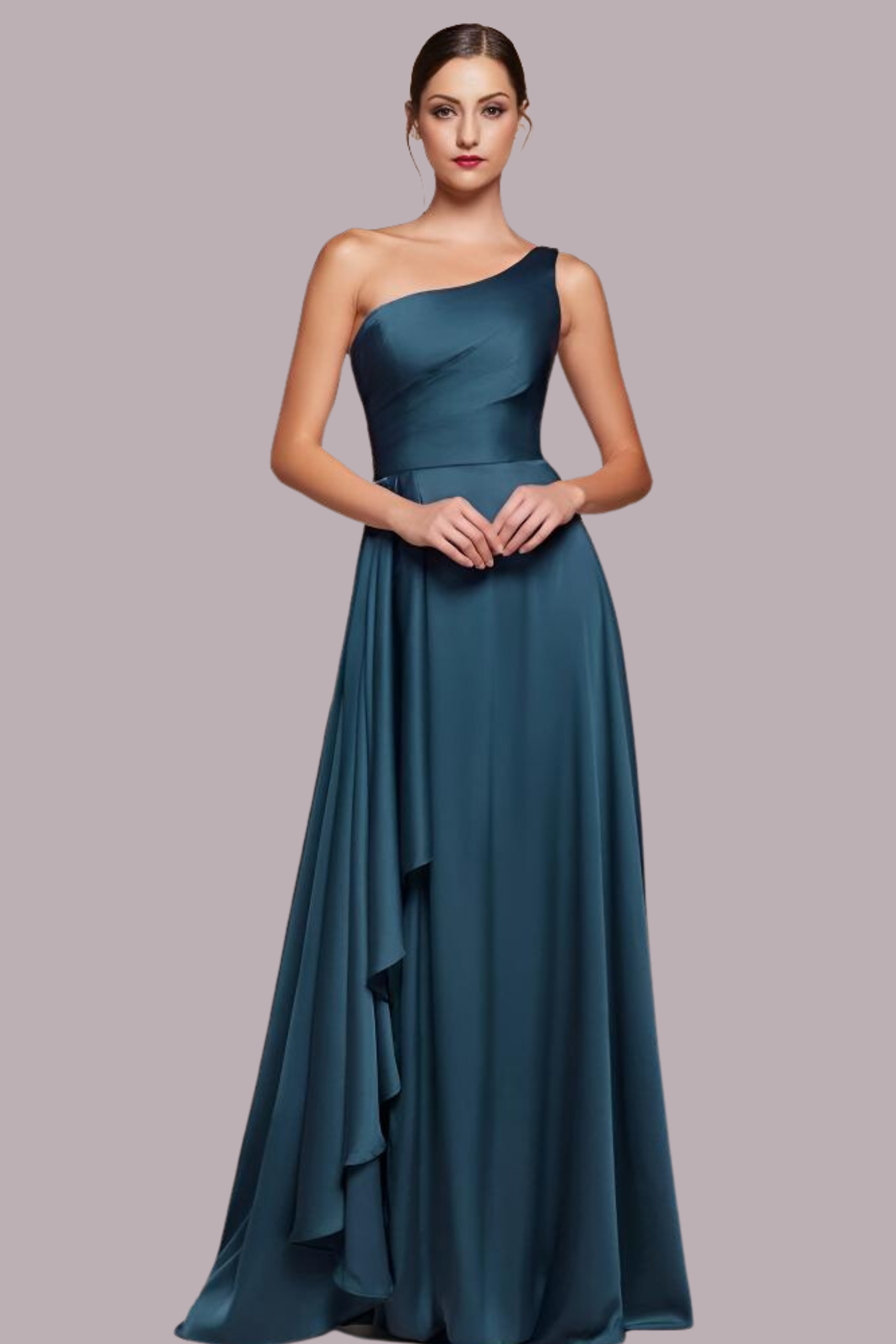 This elegant A-line long dress features a chic one-shoulder design and a flowing asymmetrical skirt crafted from soft satin. The fitted bodice beautifully complements the flowy skirt, creating a graceful silhouette. Ideal for bridesmaids, wedding guests, or formal events, this dress exudes timeless sophistication.