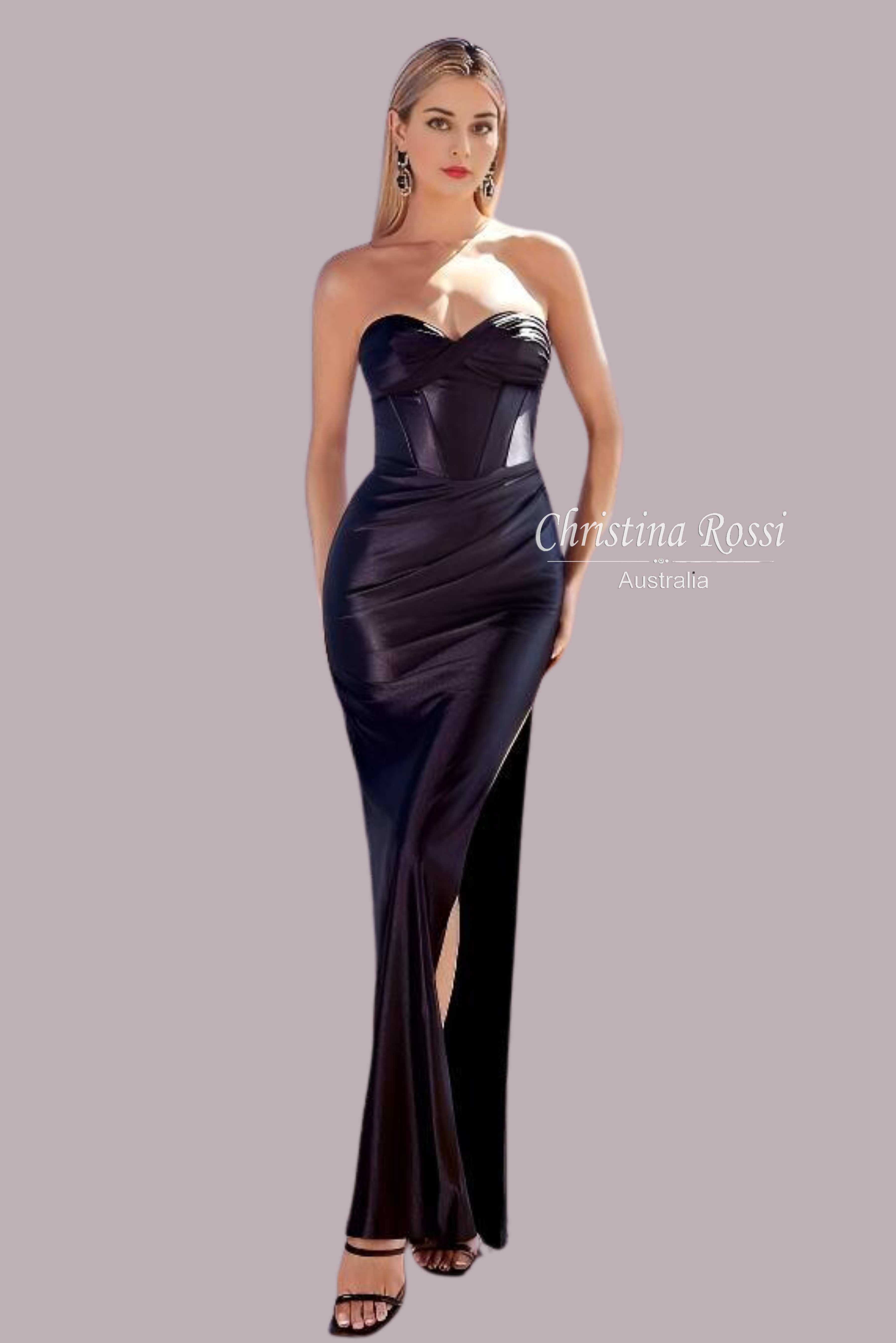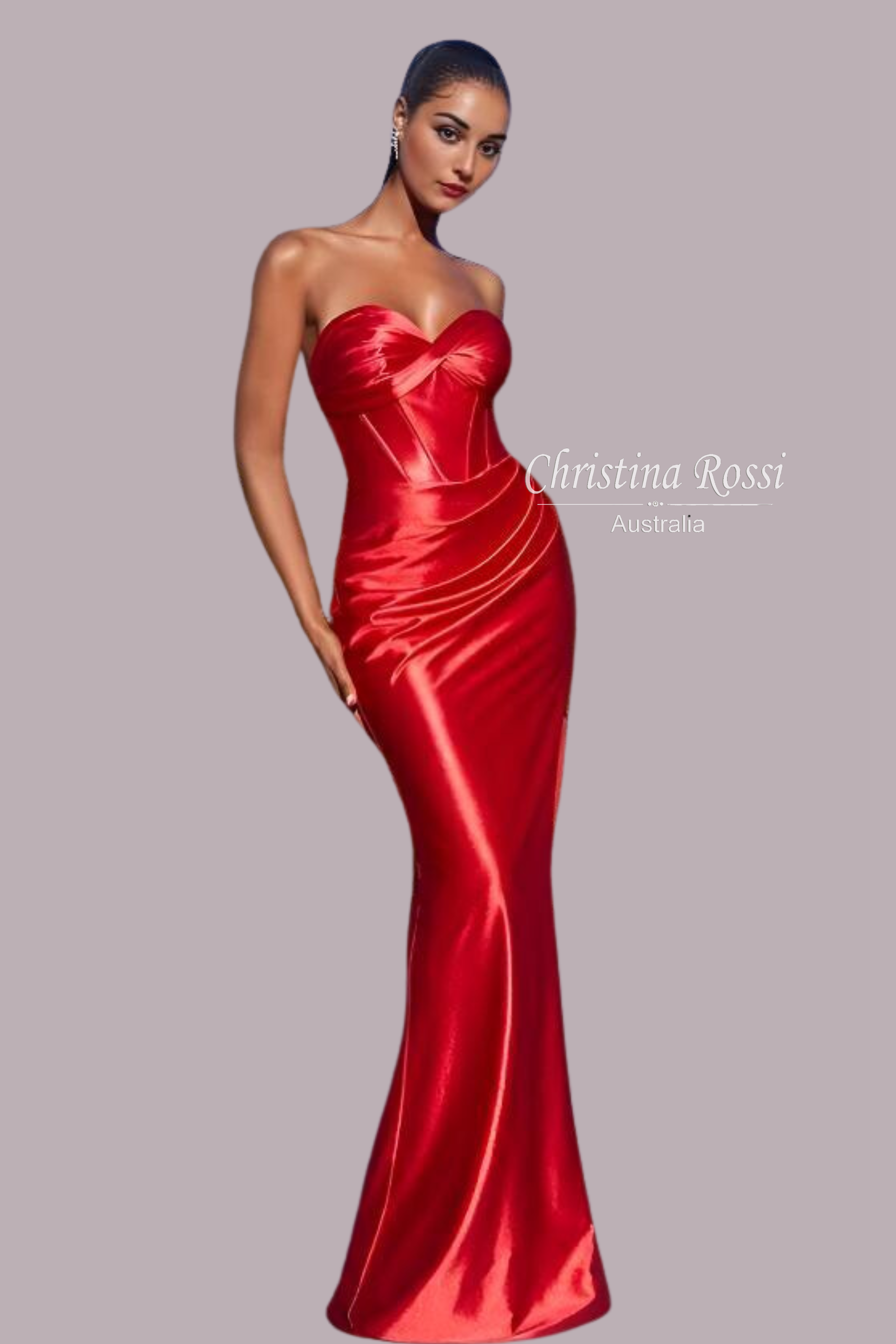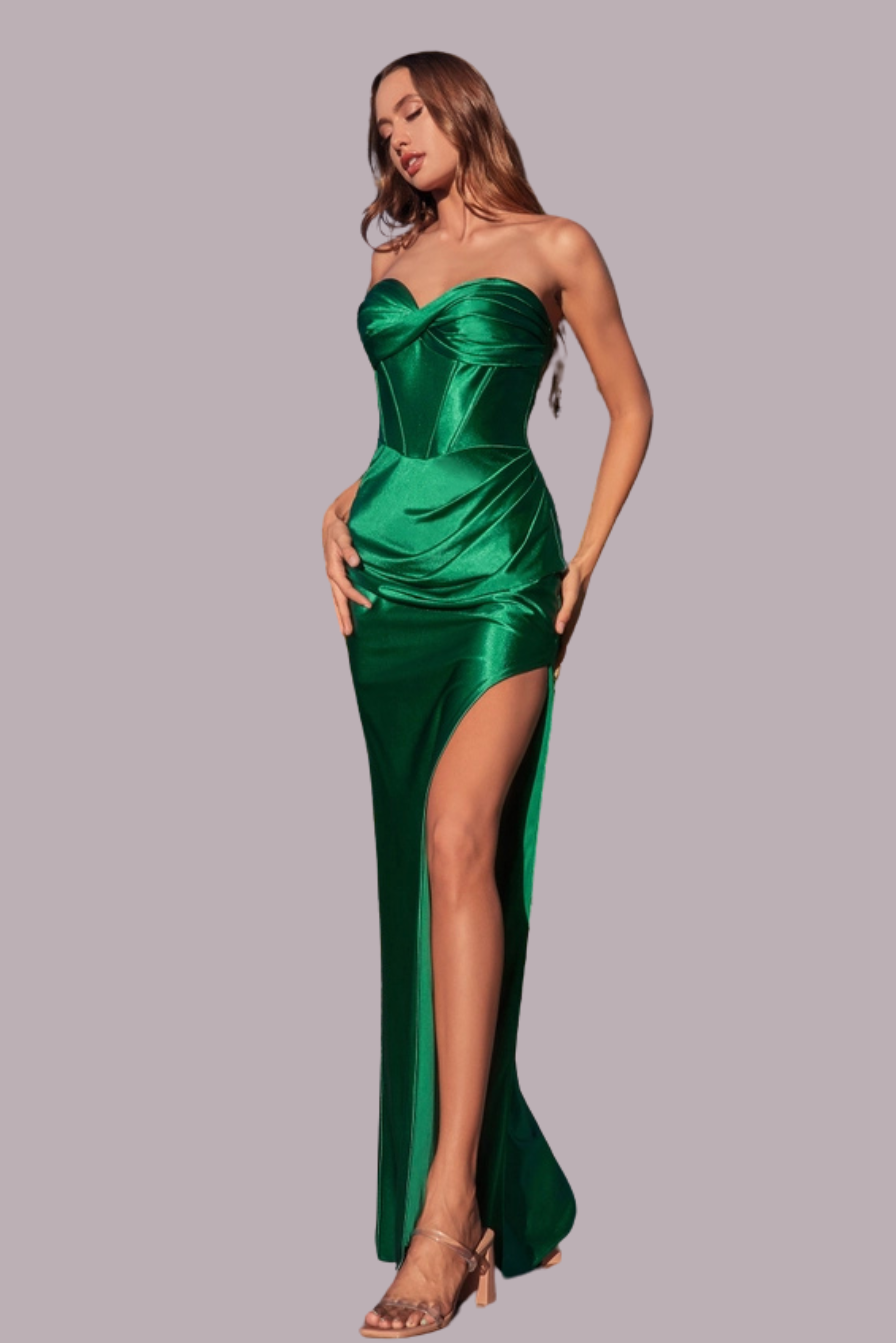 Get ready to turn heads in our strapless satin gown! This classic, sexy design is the perfect choice for any formal event. Featuring a fitted silhouette, boned bodice, and a twisted sweetheart neckline, you are sure to look your absolute best. The semi-stretch luxe Satin is incredibly comfortable, while the pleated hip line and leg slit add a flirty touch. With our exquisite strapless satin gown, you will have all eyes on you. So don't wait - this timeless piece is a must-have addition to your wardrobe!