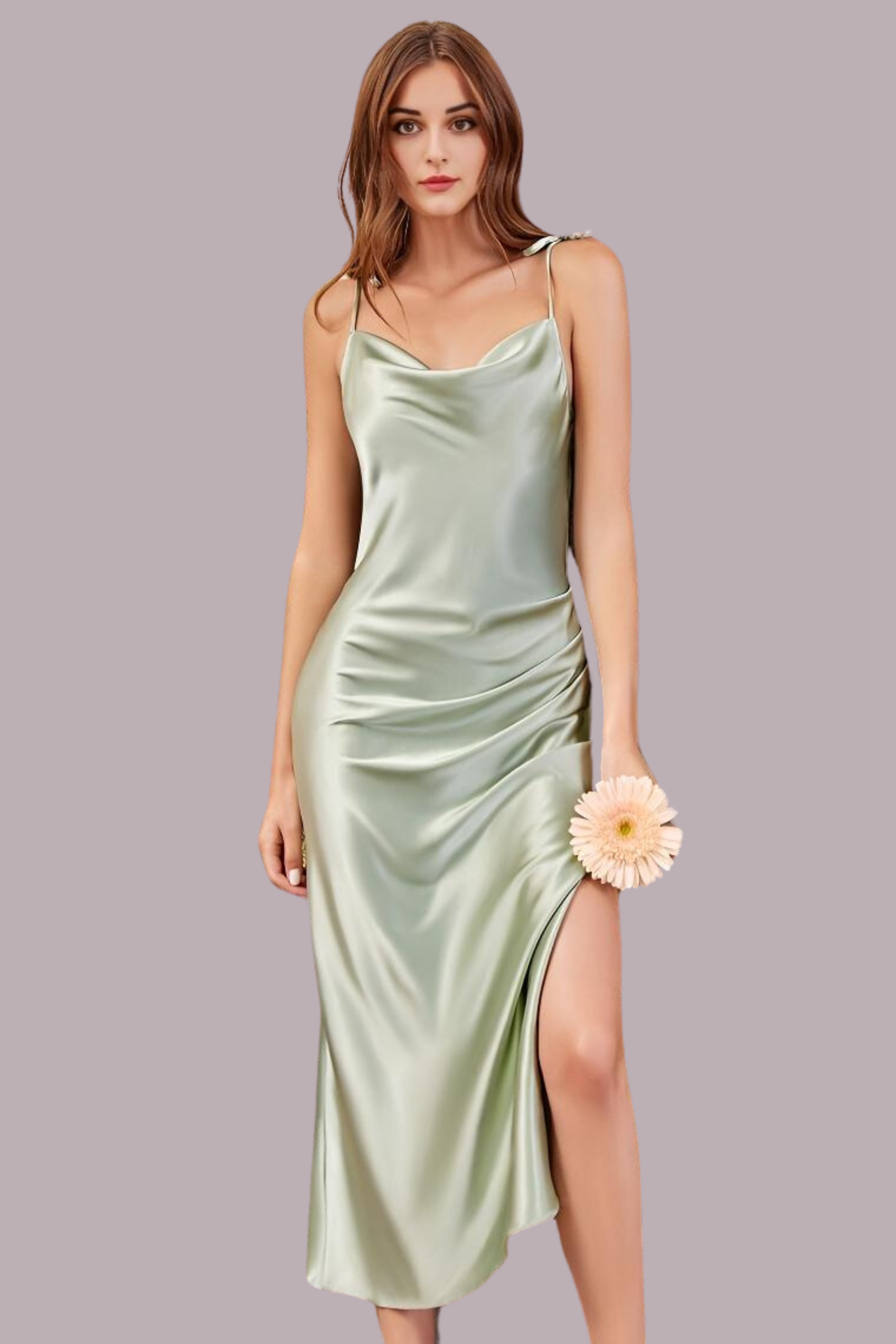 Fitted satin slip gown with tie shoulders, cowl neckline and mid length tea cut.