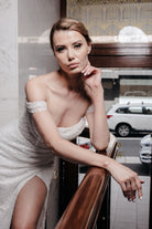 Breathtaking off-the-shoulder tulle gown lavishly sprinkled with pearls along the entire length. Features a high-split skirt with a significant long train covered in pearls.