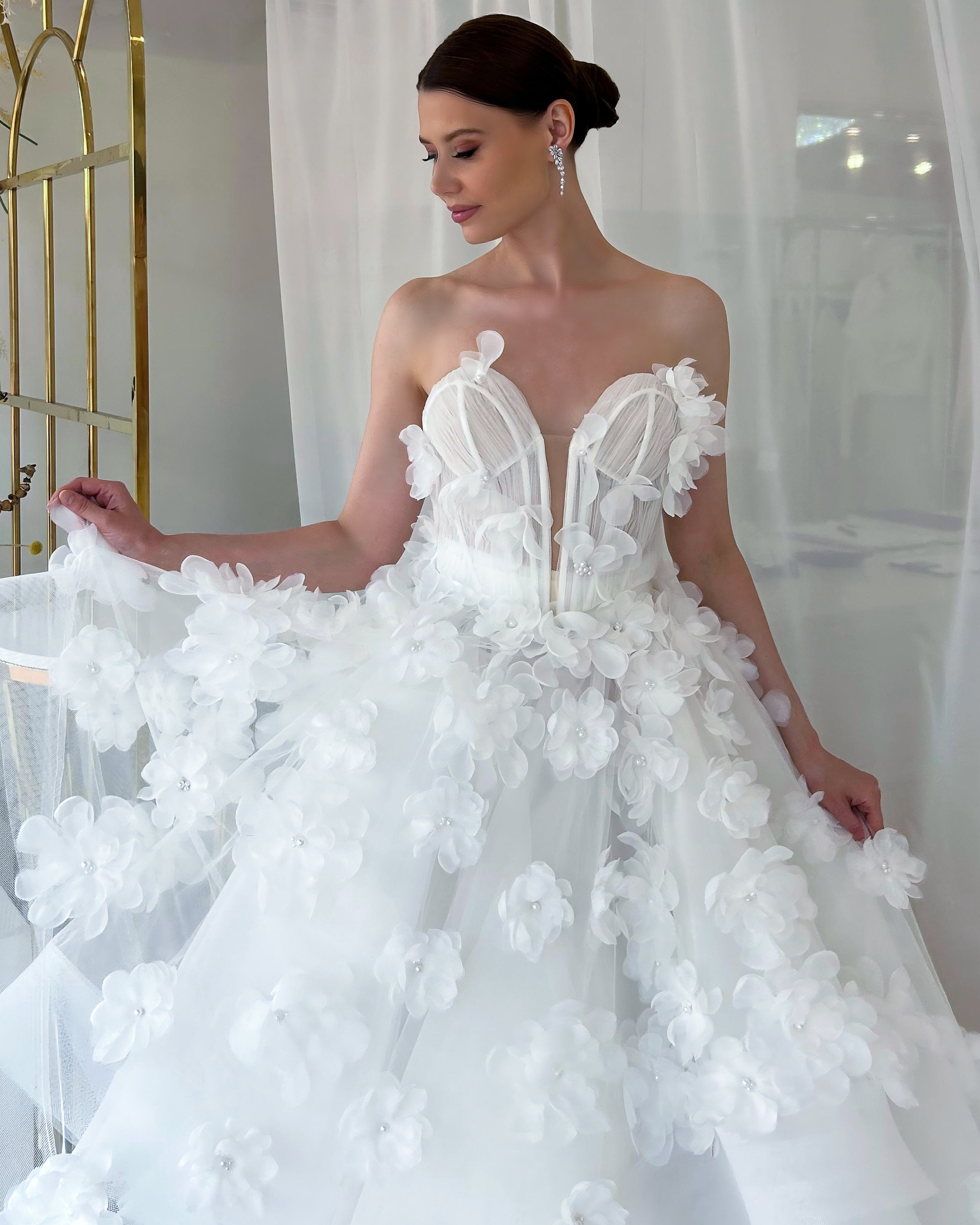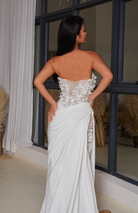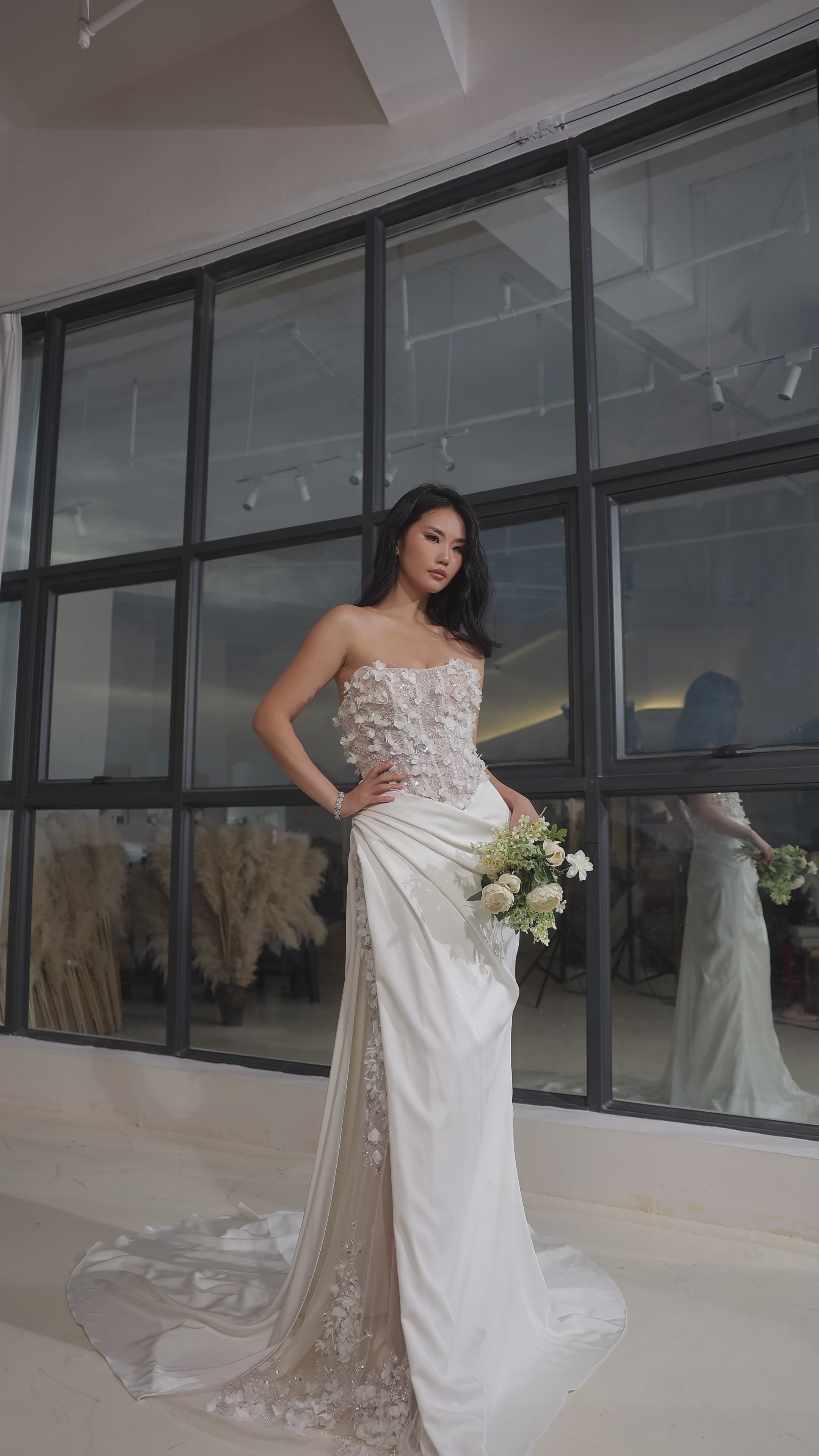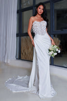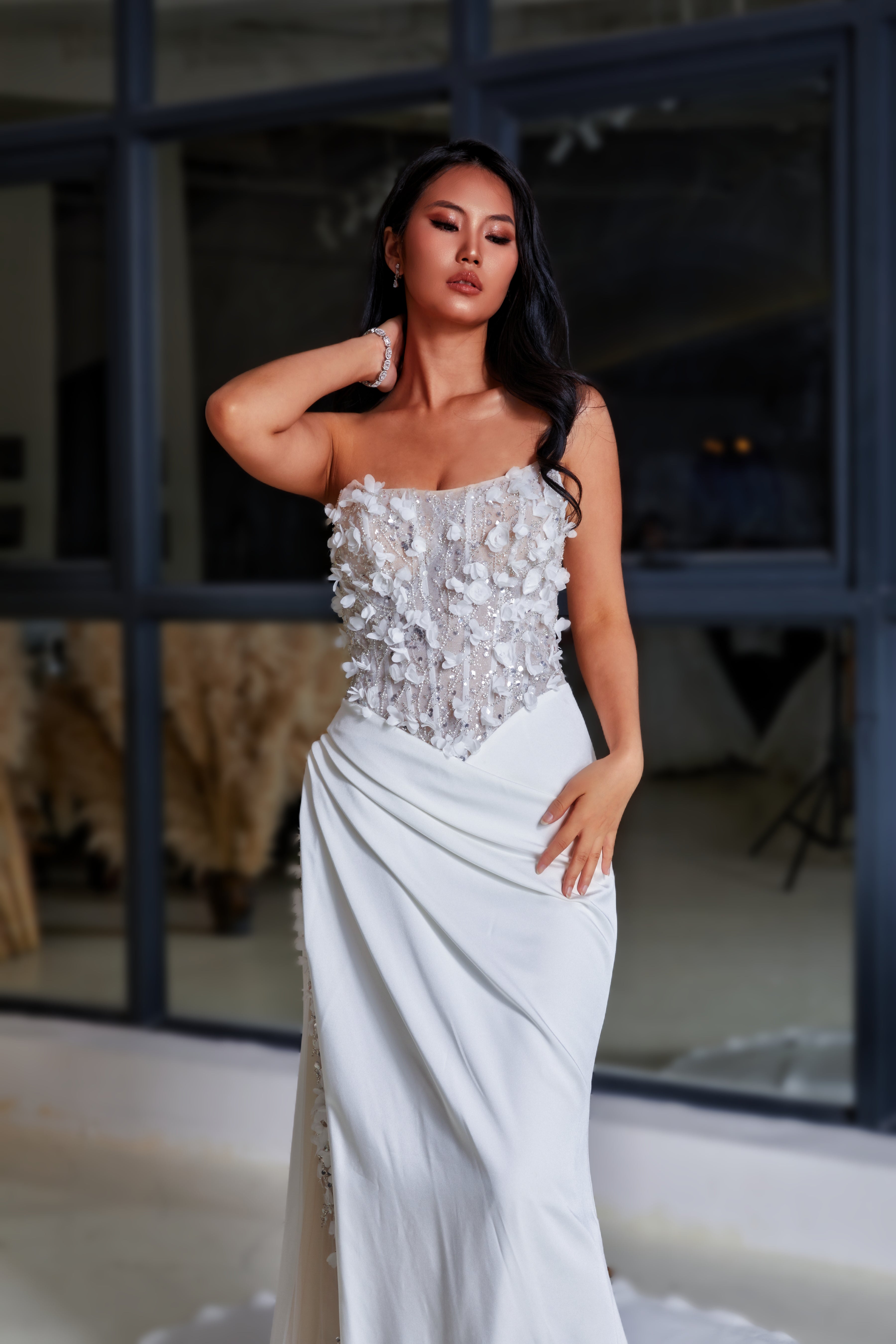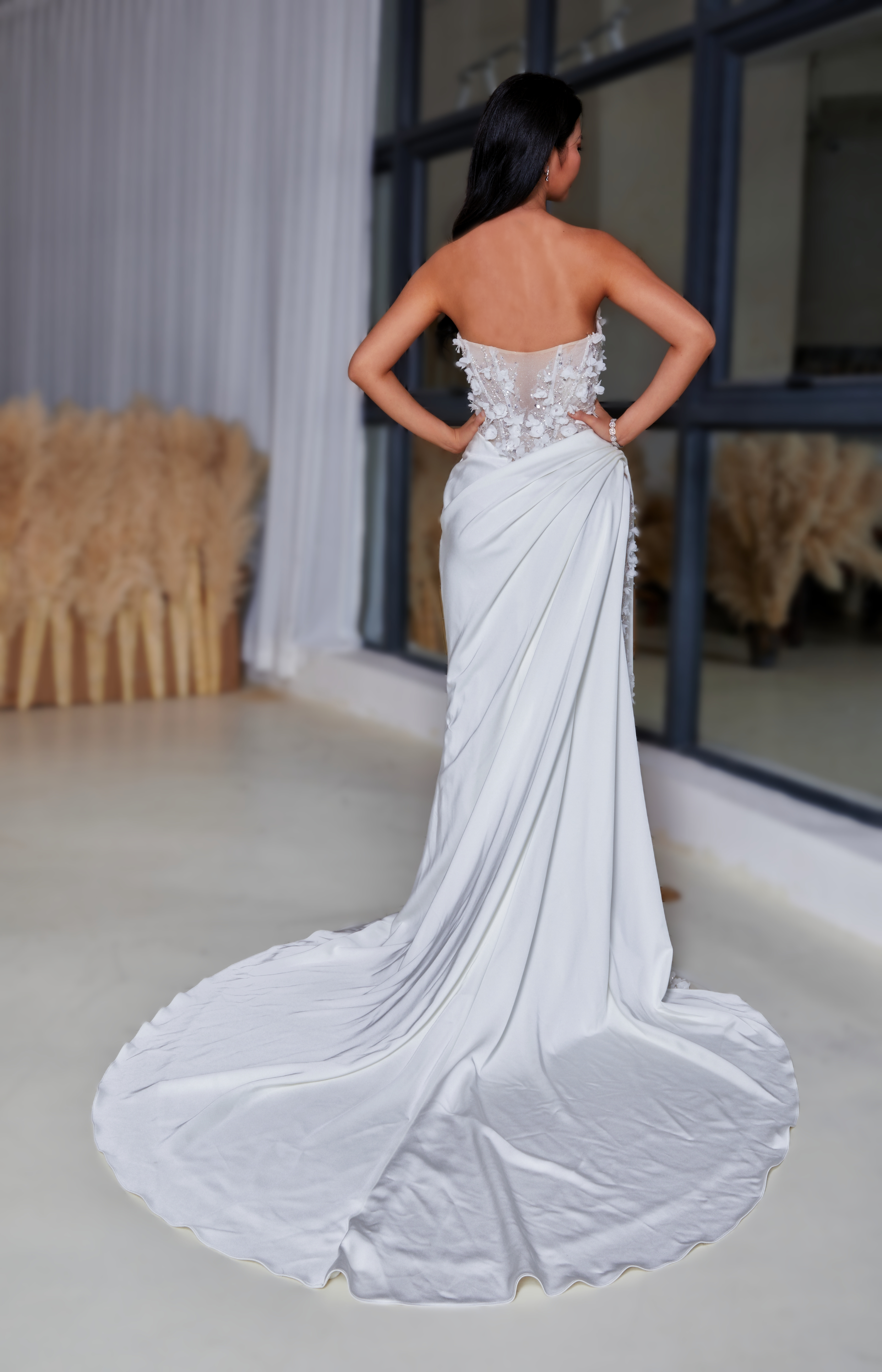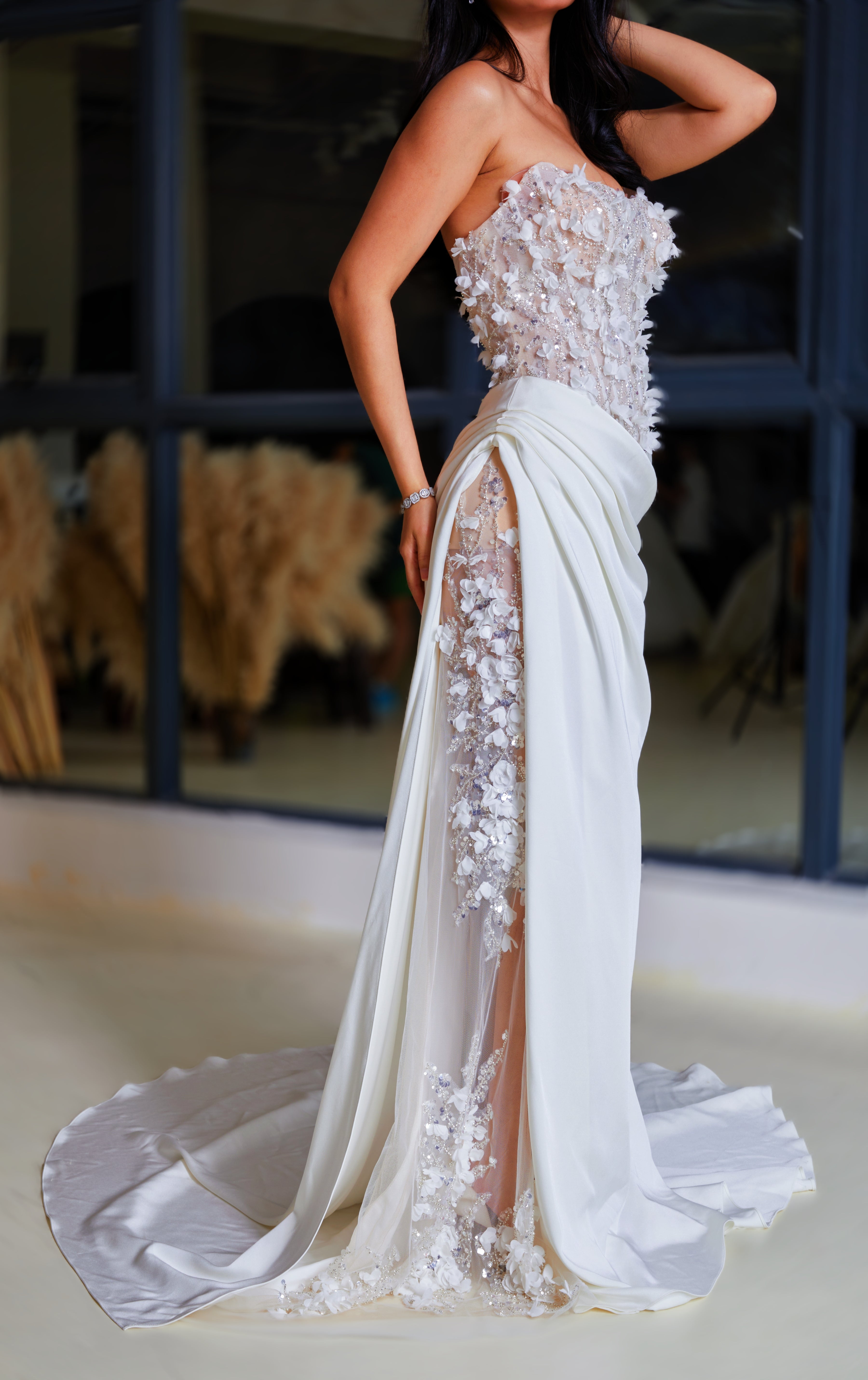 Extravagant sexy fitted wedding gown on sweetheart neckline adorned with beadings and 3D florals wrapped skirt with a daring thigh-slit and zipper closure. Mesmerizing lace appliques along the entire length of the slit covered in sequins and beadings.