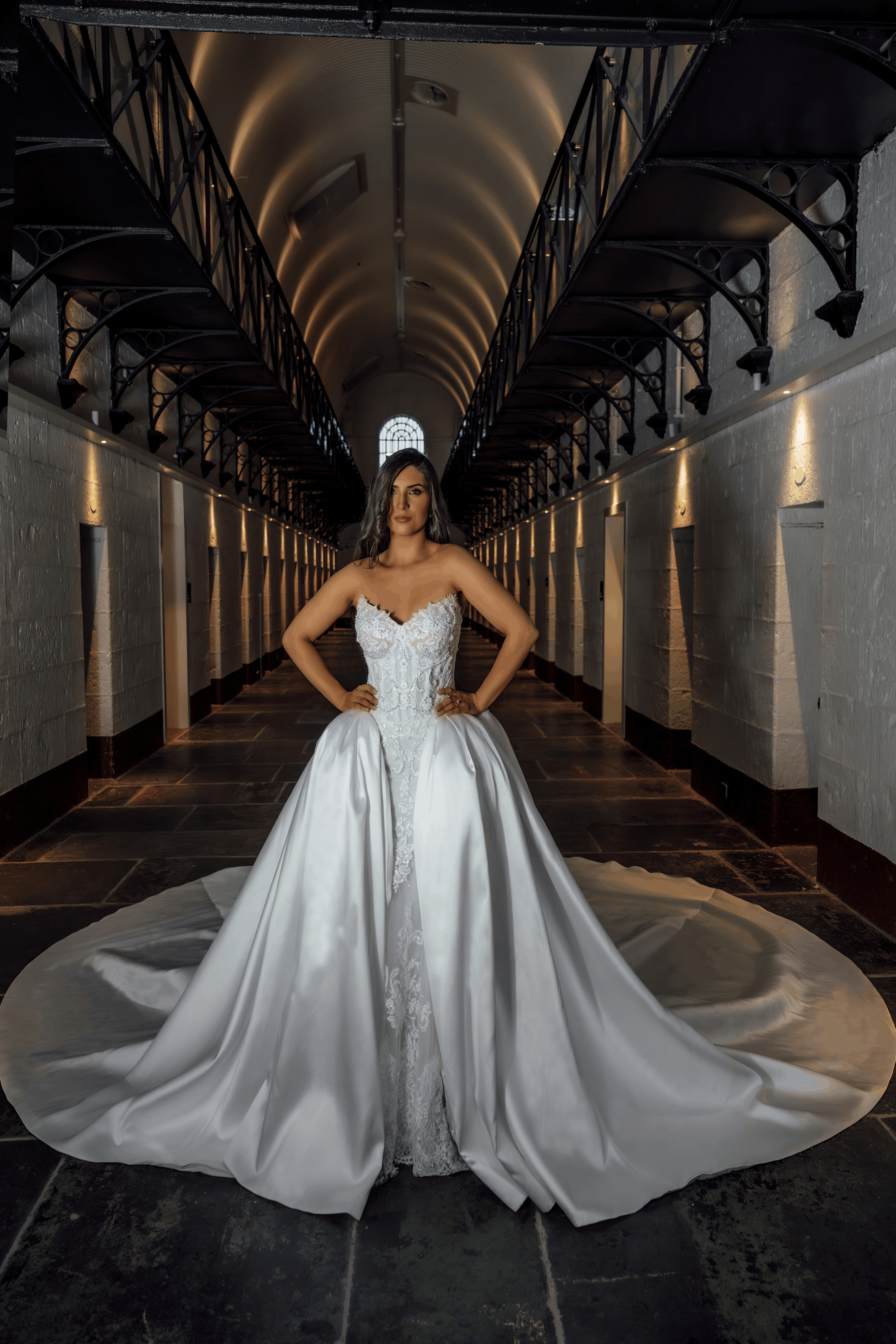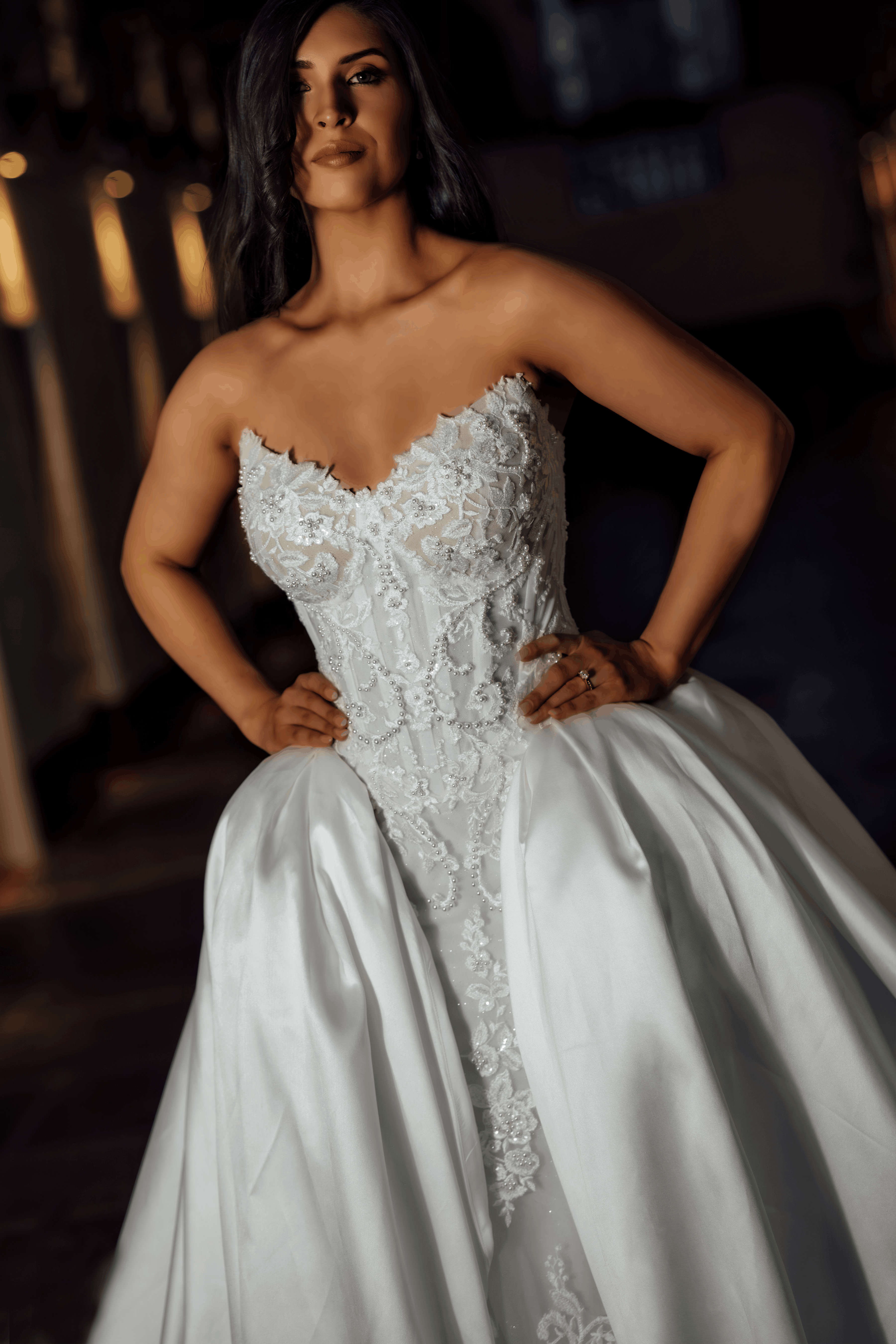 A luxurious Mikado overskirt designed to elevate your bridal look. This detachable piece adds dramatic volume and regal sophistication, effortlessly transforming your gown from ceremony to reception. Perfect for the bride who loves versatility and timeless elegance.
