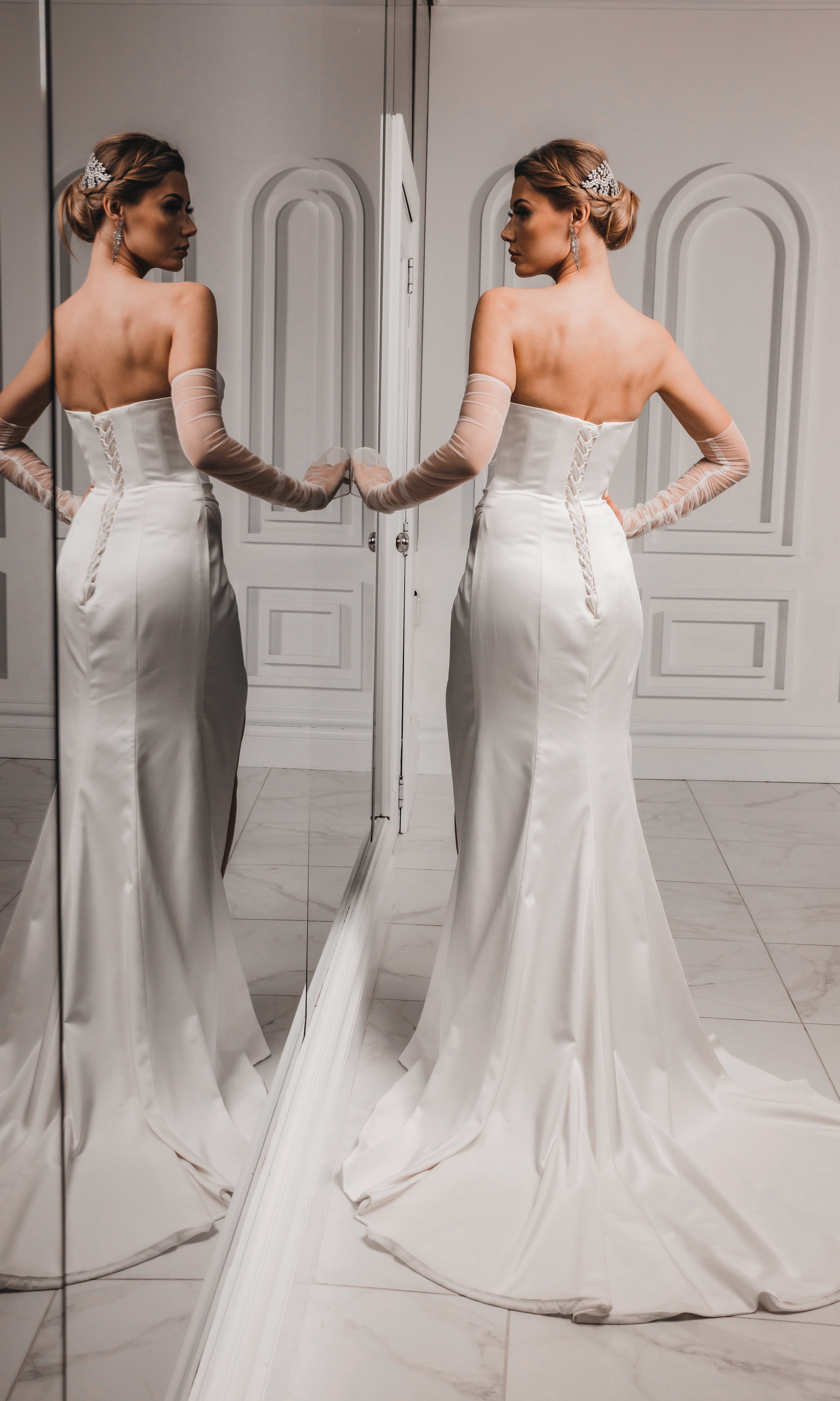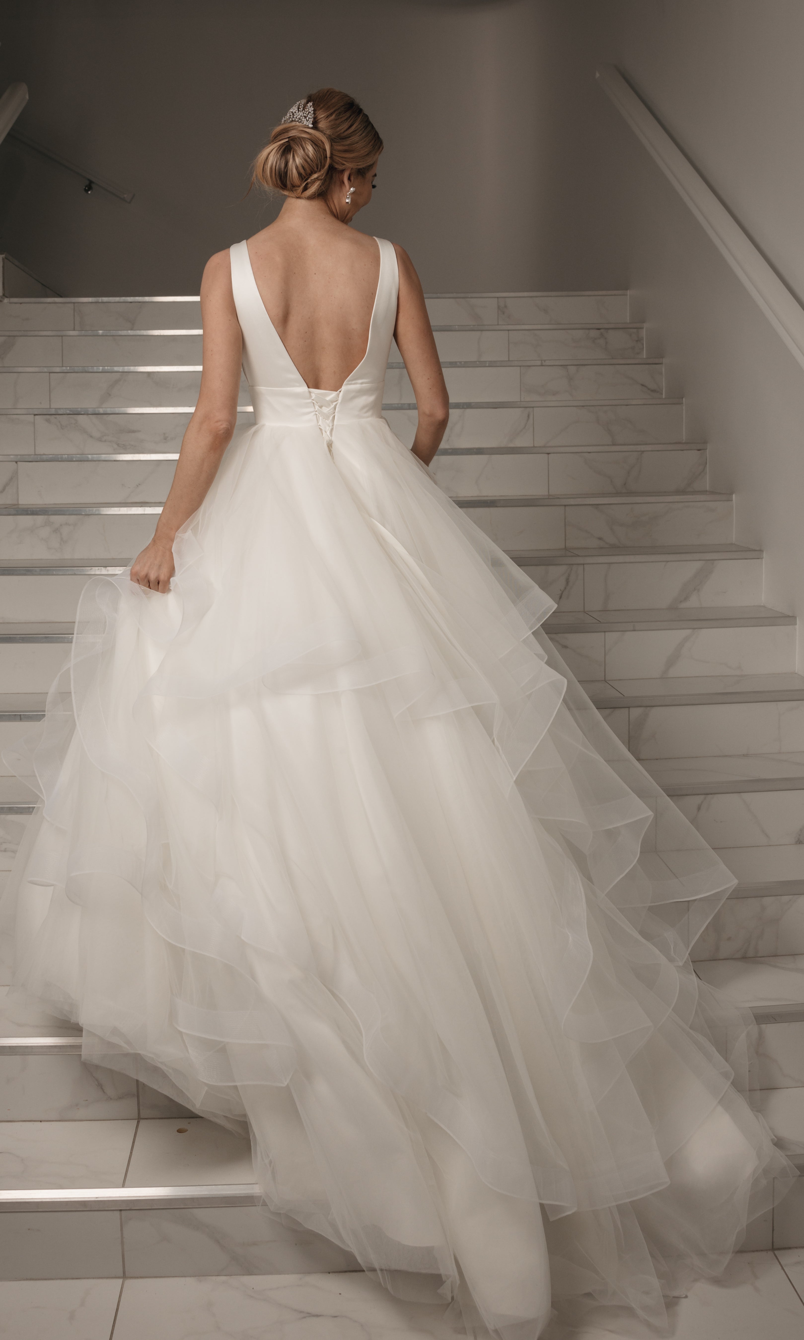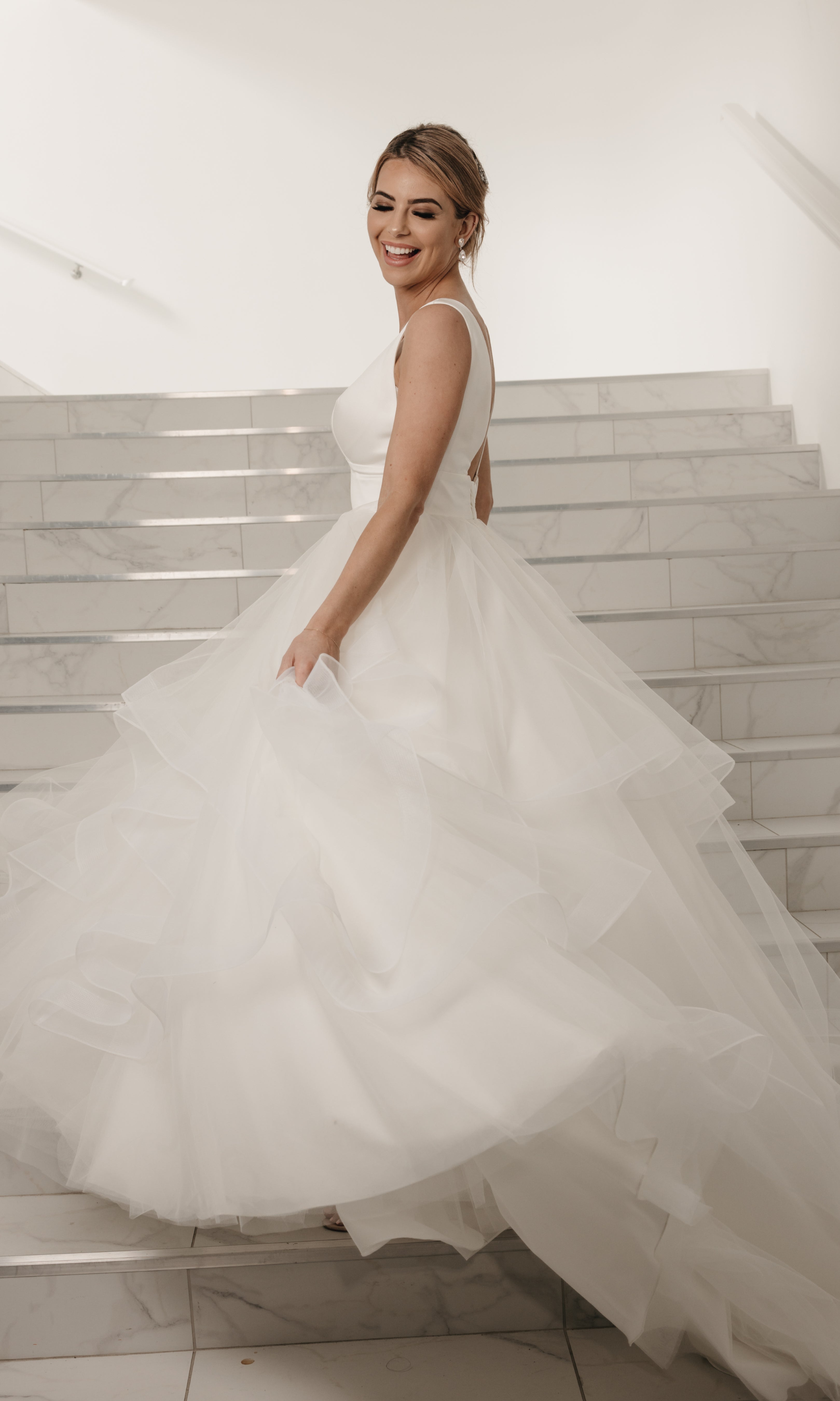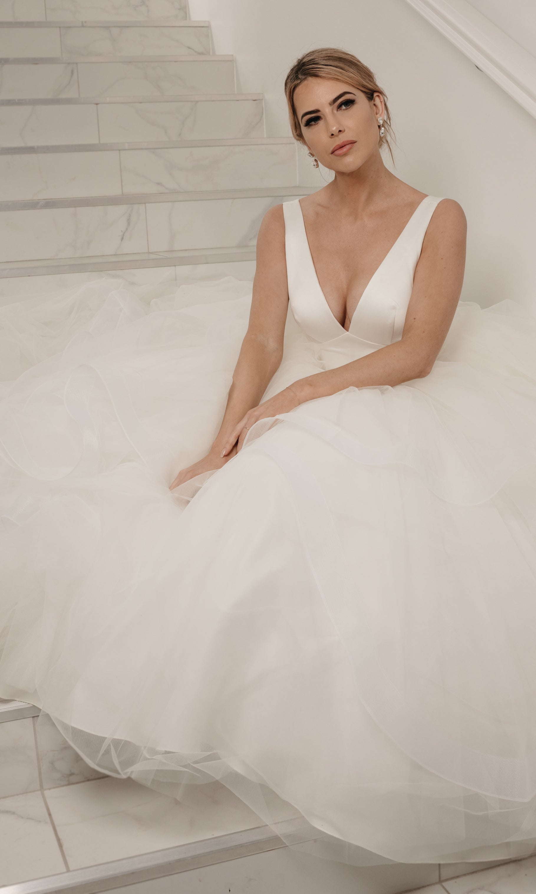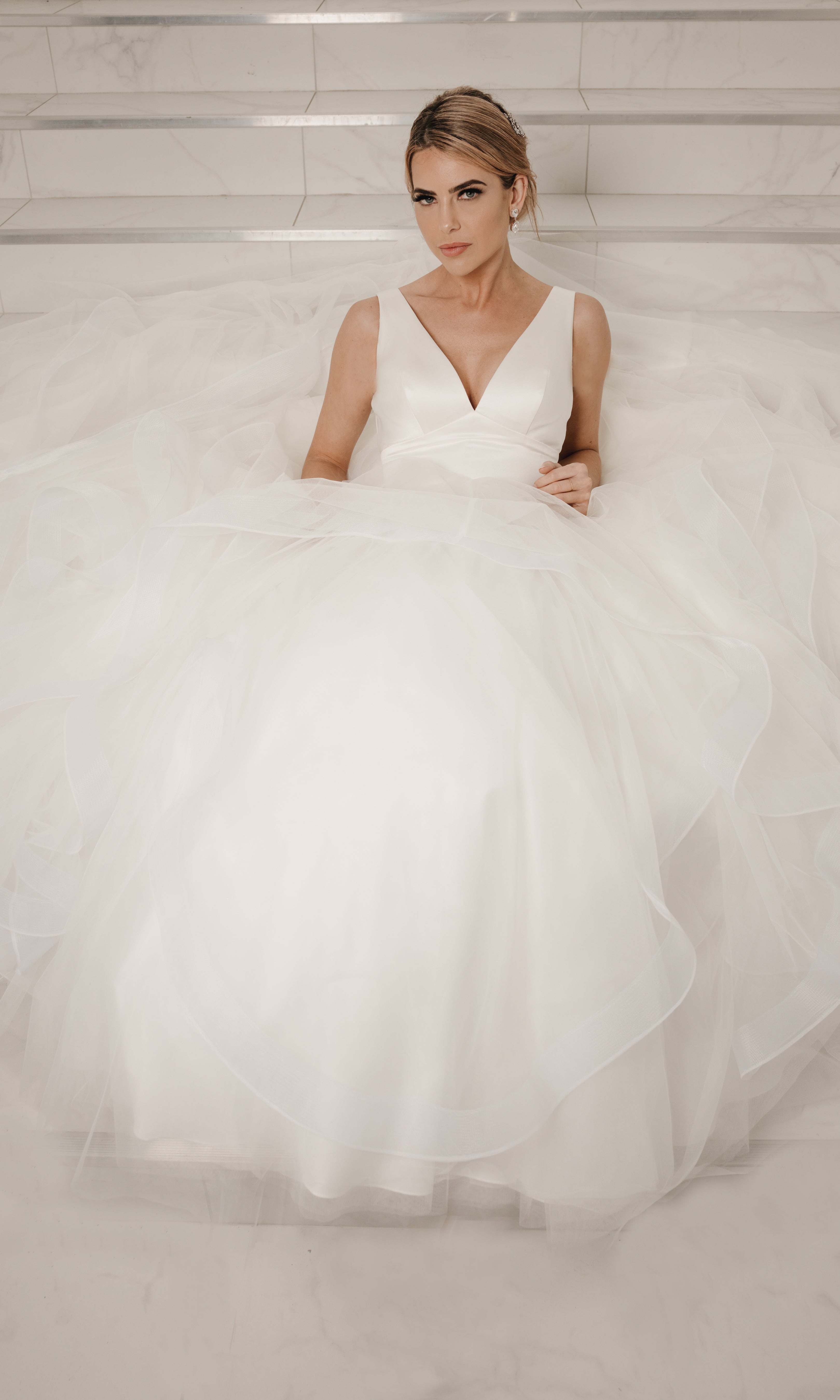 Christina Rossiβs collection of A-line gowns includes timeless, elegant, modern & chic gowns to dresses that are perfect for any wedding theme. The A-line cut flatters a variety of body types, providing a perfect blend of comfort and sophistication. Whether you envision a minimalistic design with clean lines or a more elaborate gown with intricate lace and embellishments, our collection offers something for every bride.