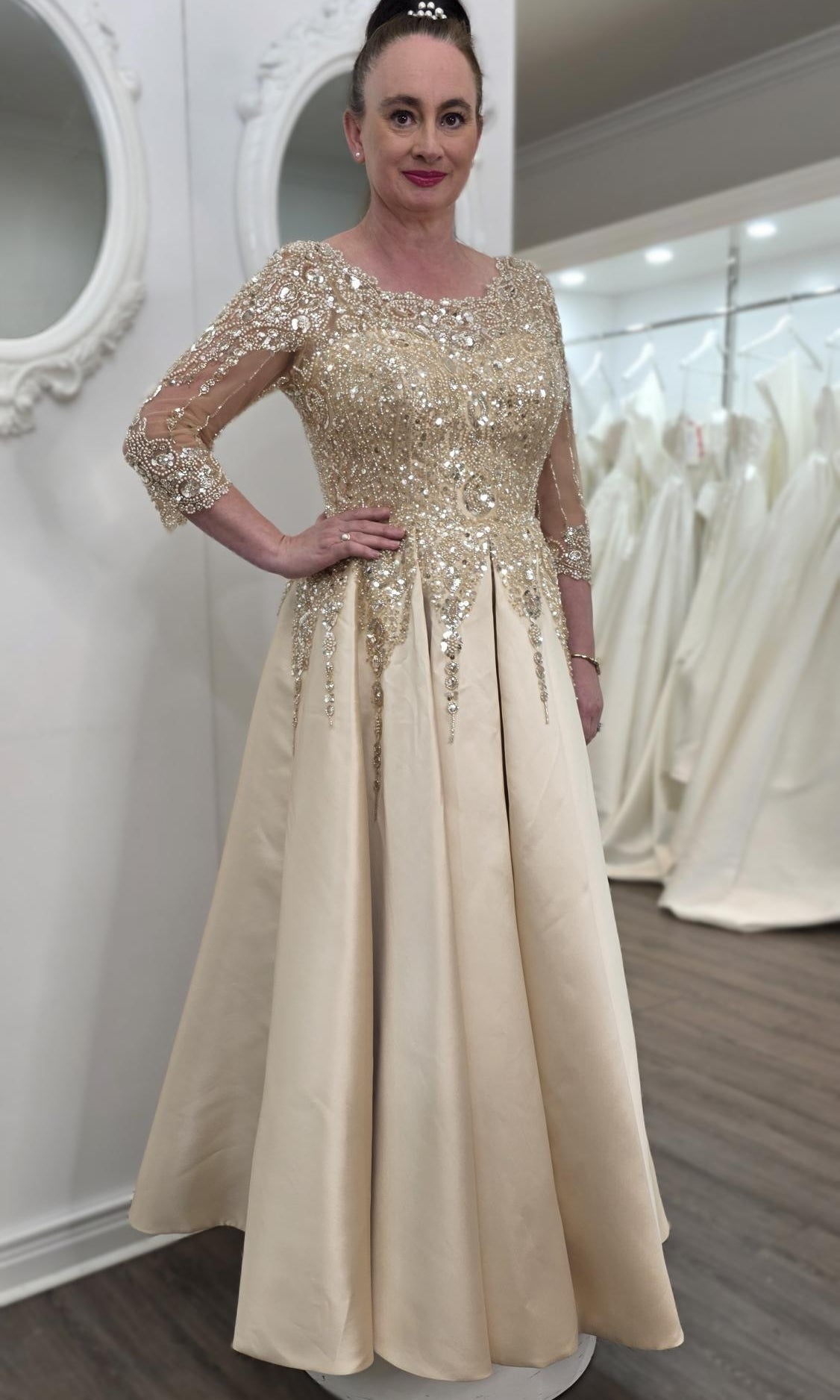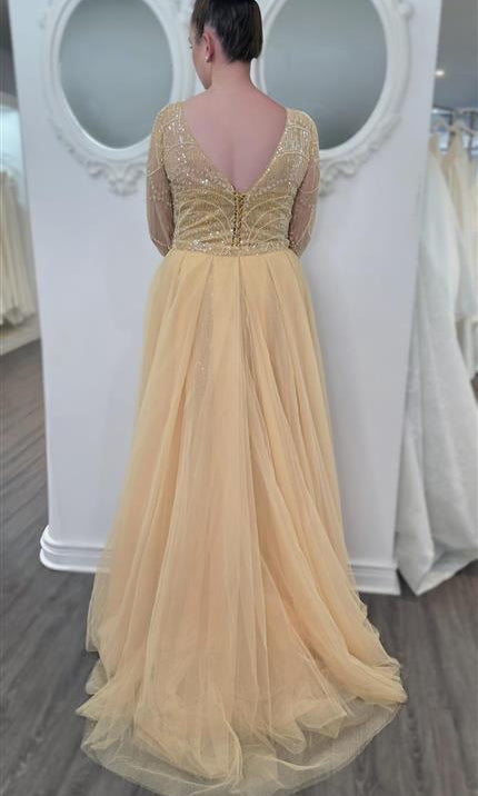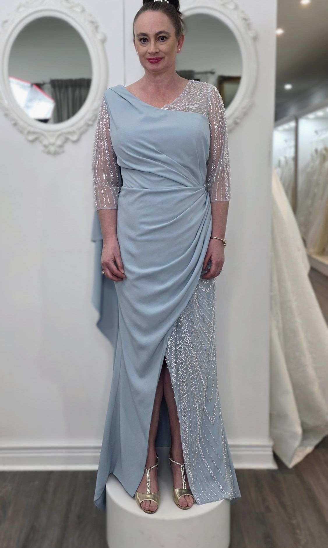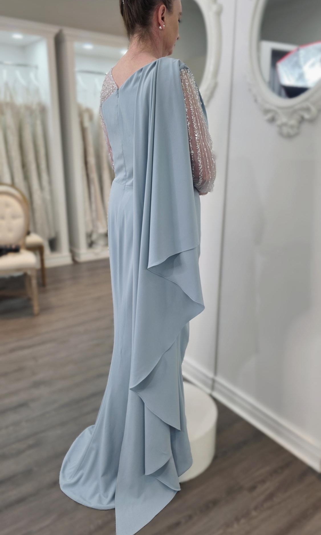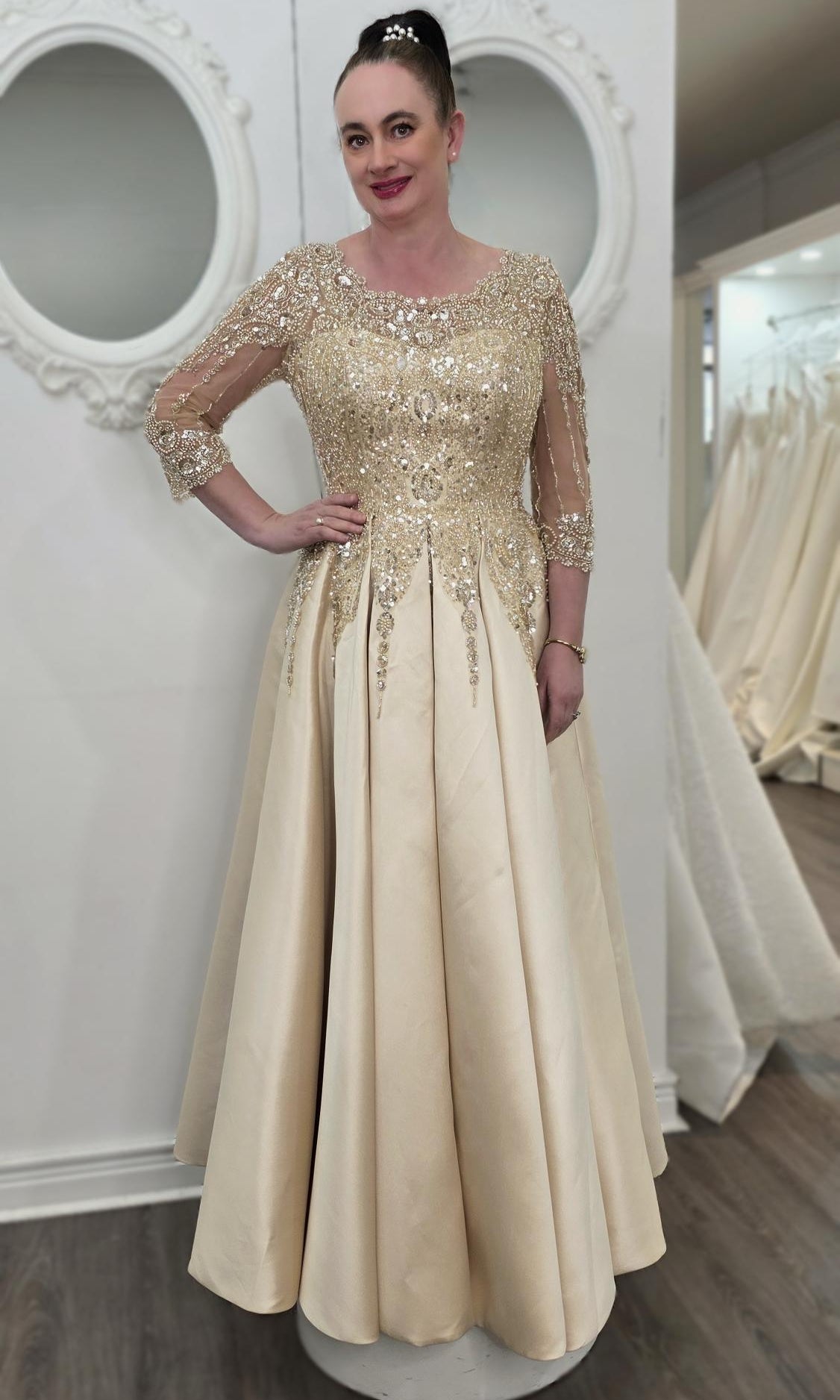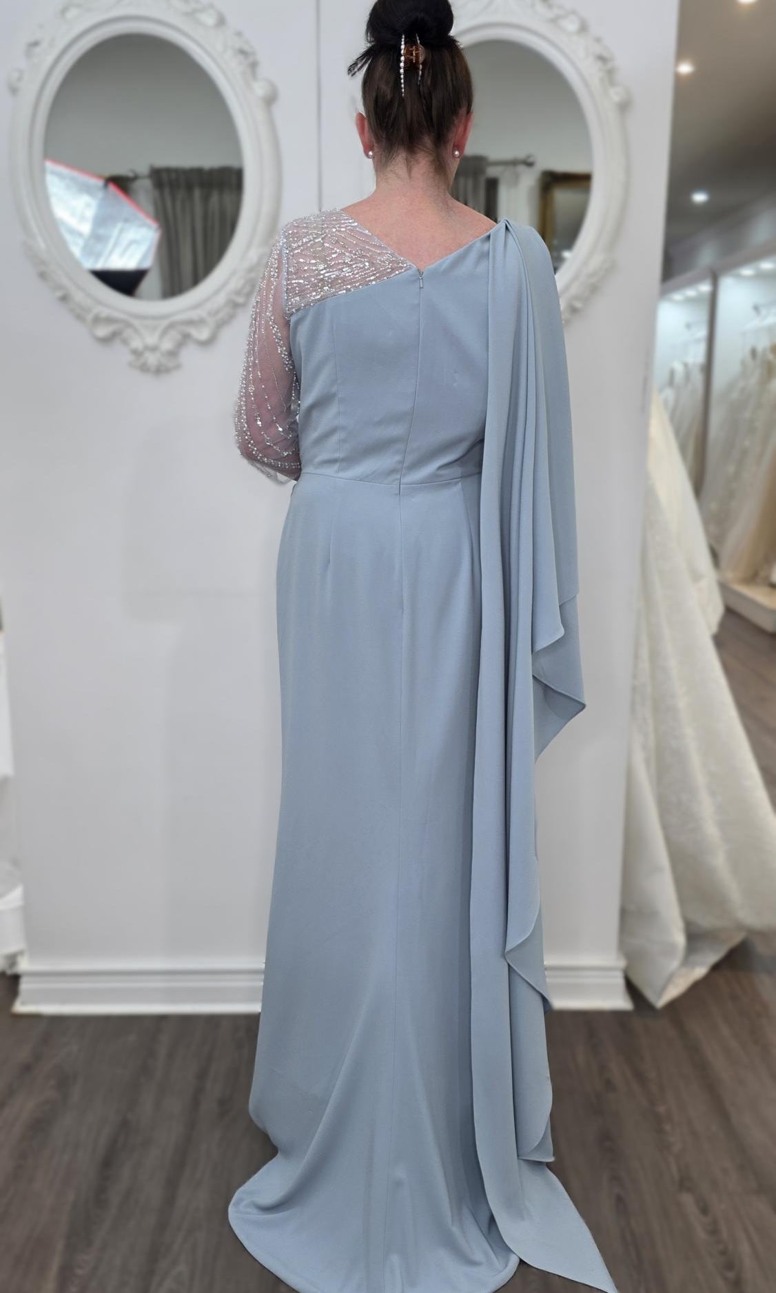 Elevate your special role as mother of the bride with our exquisitely crafted custom gown. This sophisticated dress combines classic elegance with contemporary design elements, ensuring you look and feel remarkable on your daughter's wedding day.