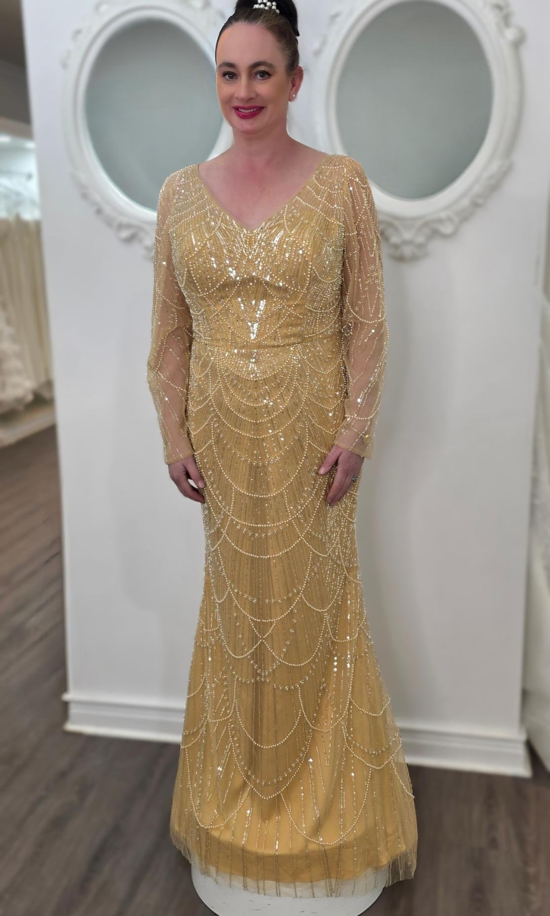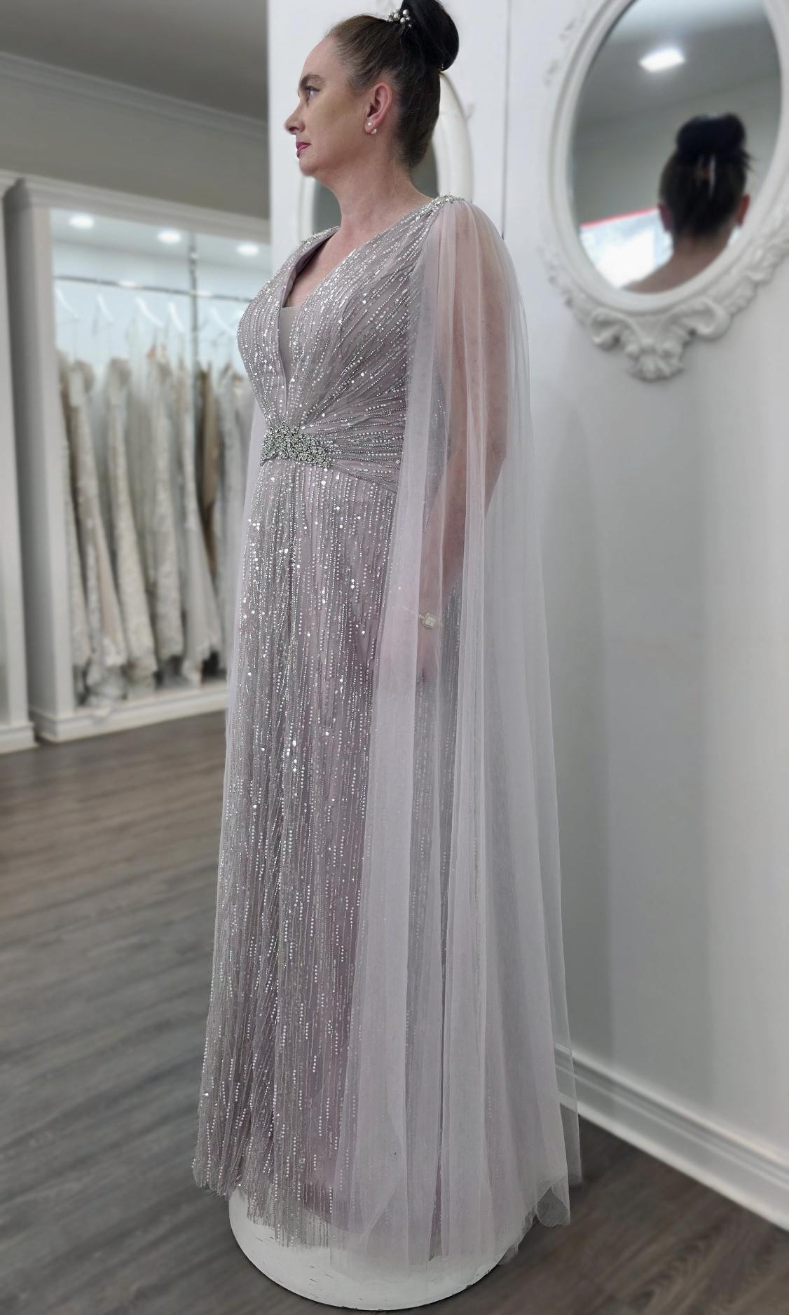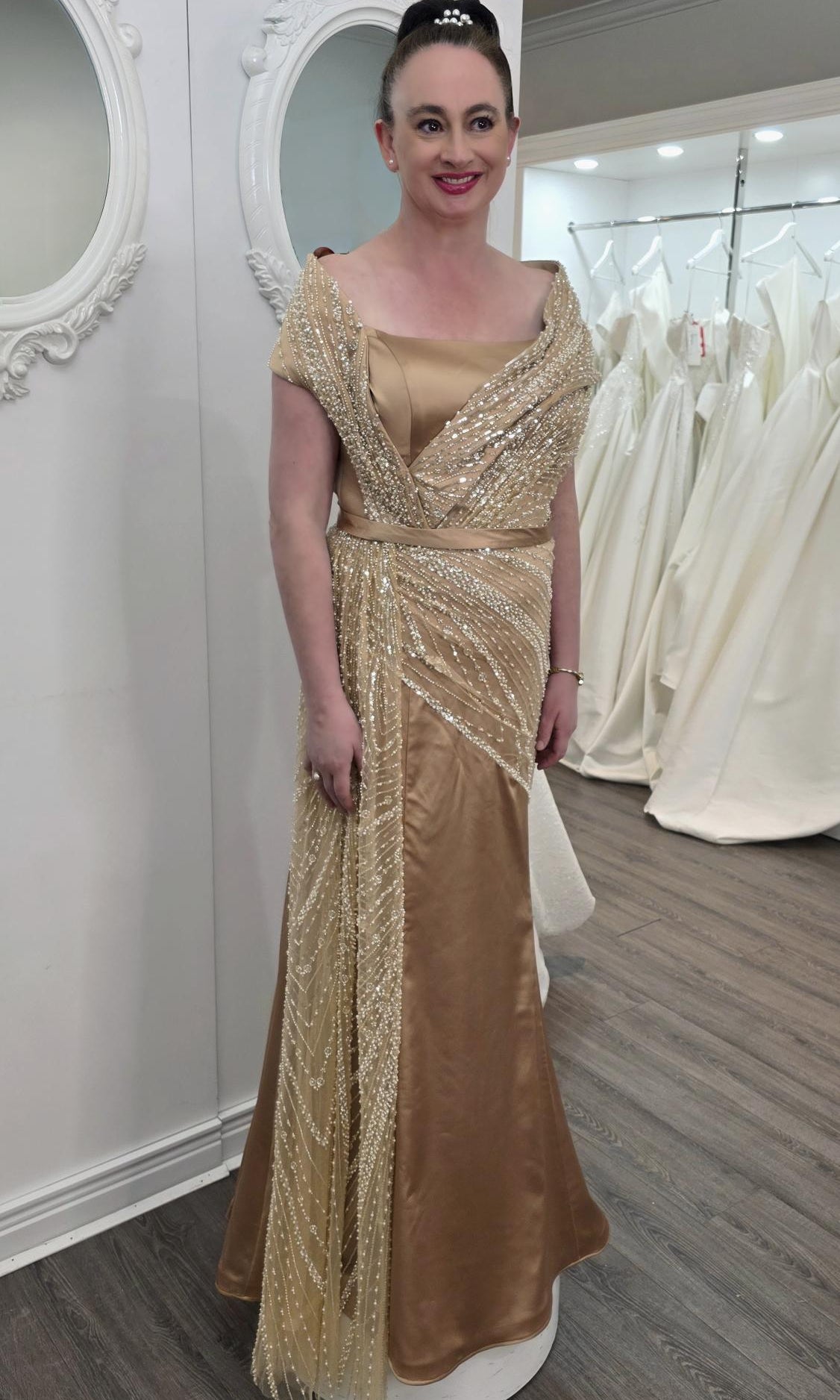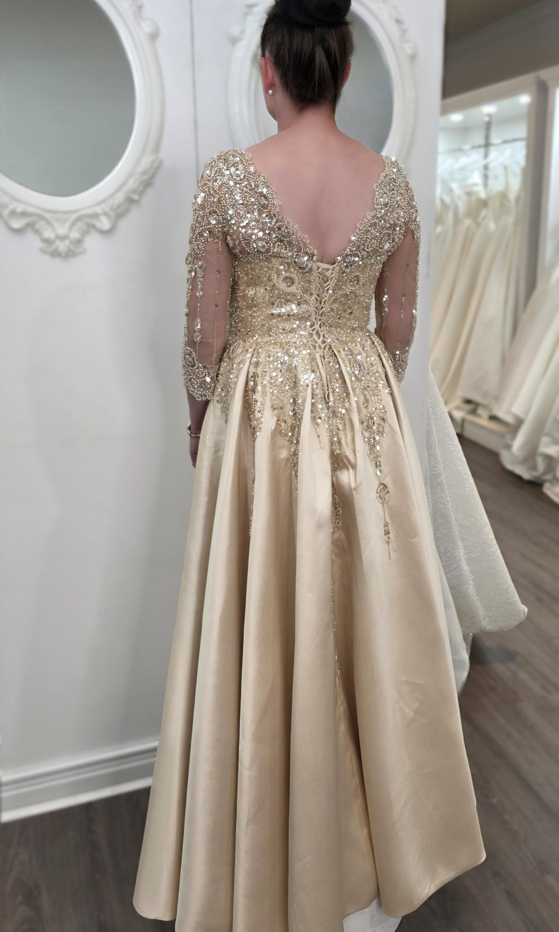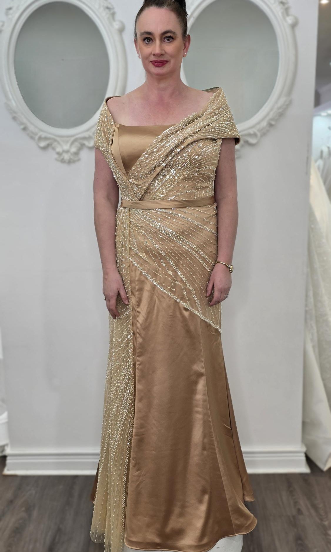 Elevate your special role as mother of the bride with our exquisitely crafted custom gown. This sophisticated dress combines classic elegance with contemporary design elements, ensuring you look and feel remarkable on your daughter's wedding day.
