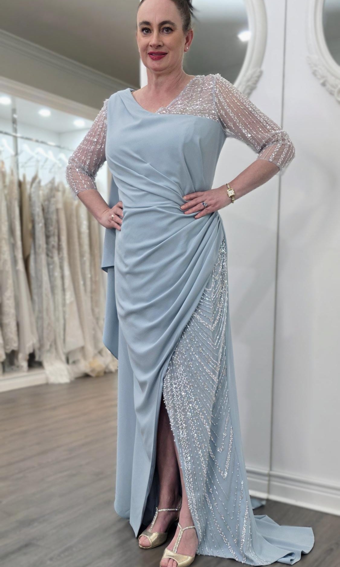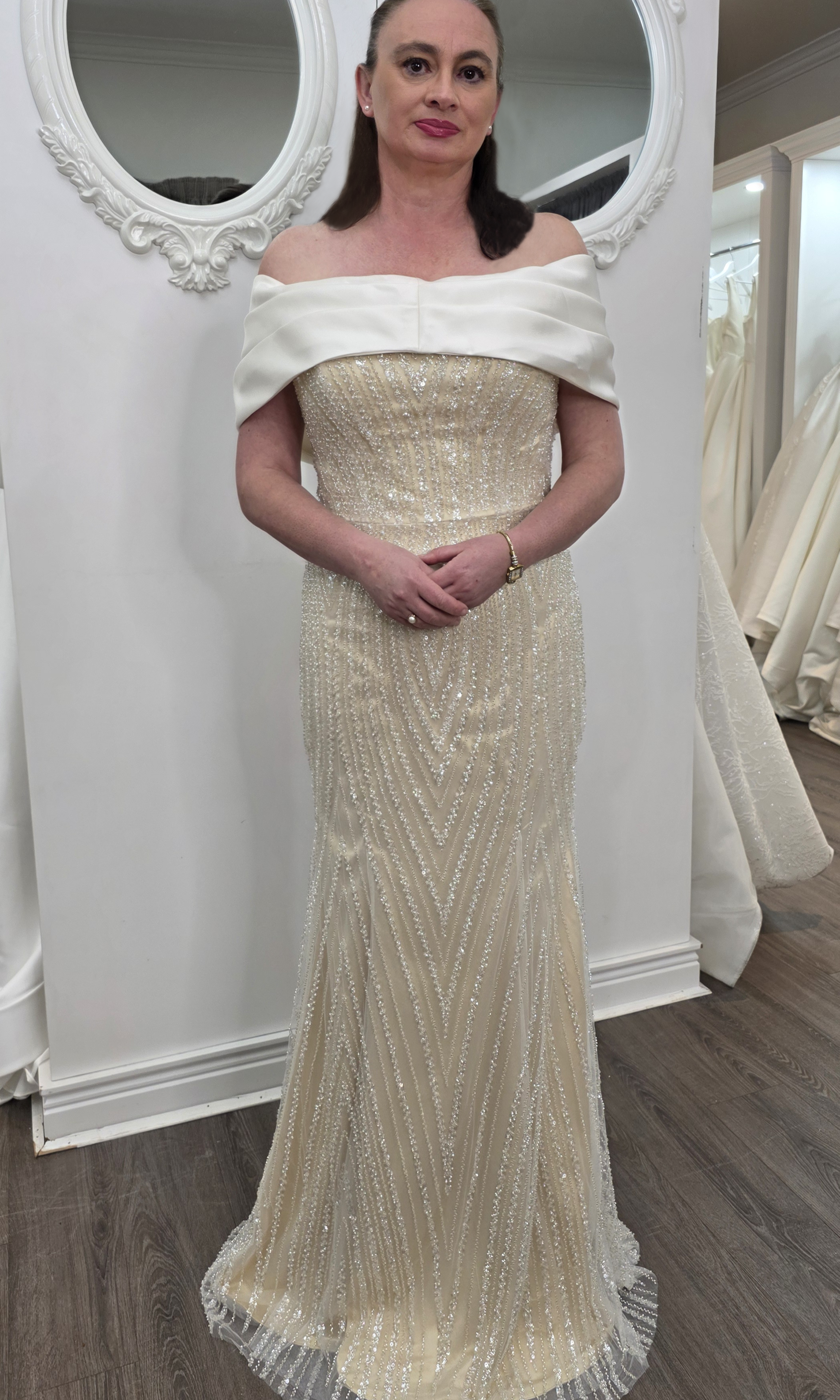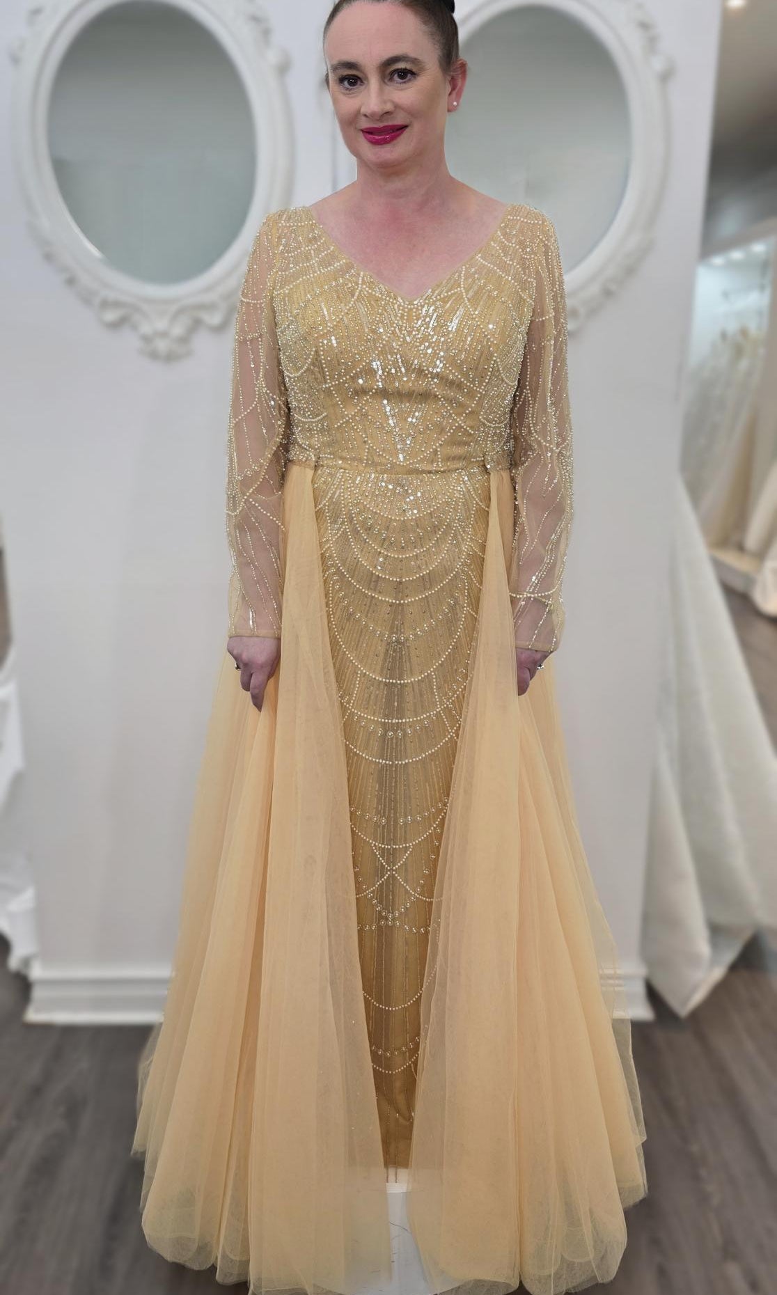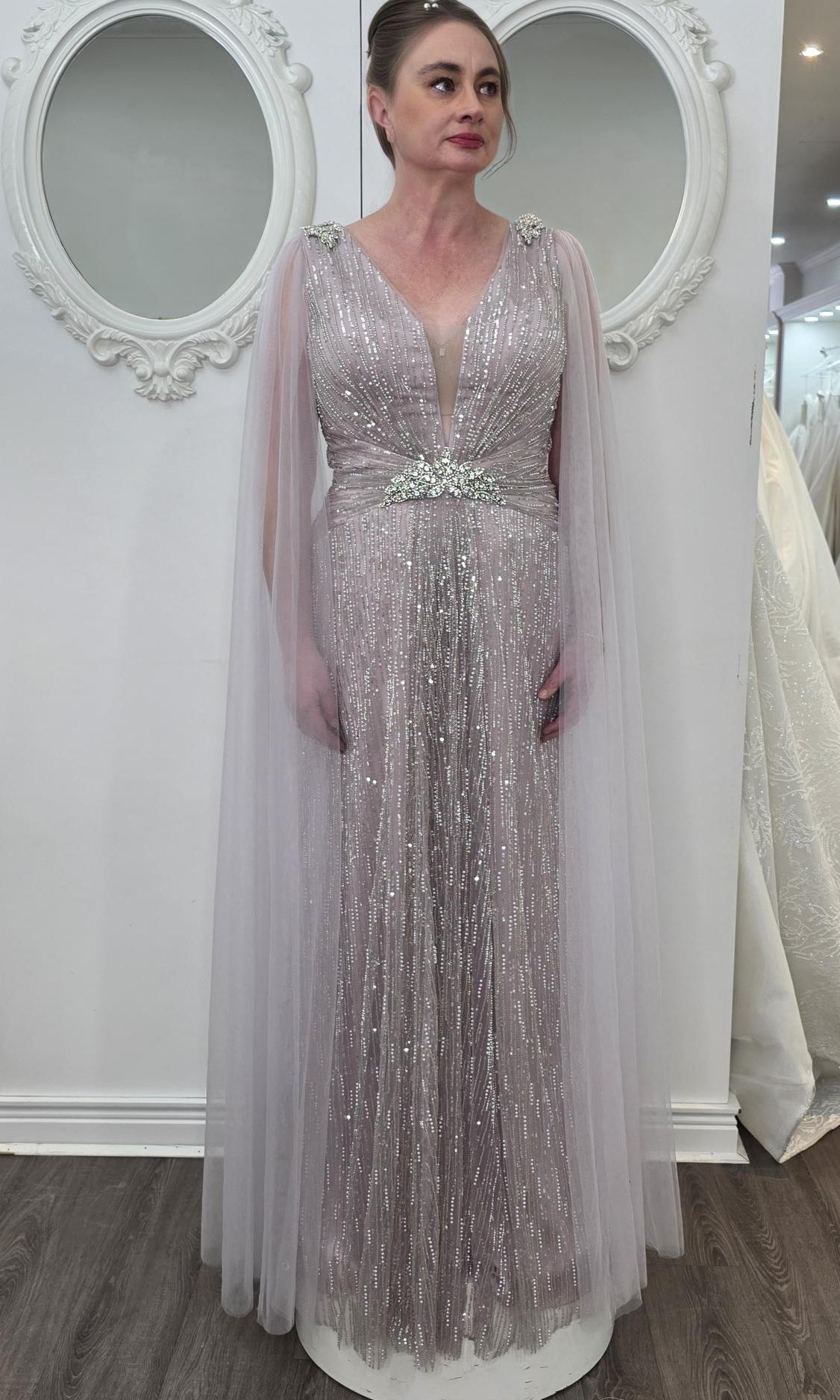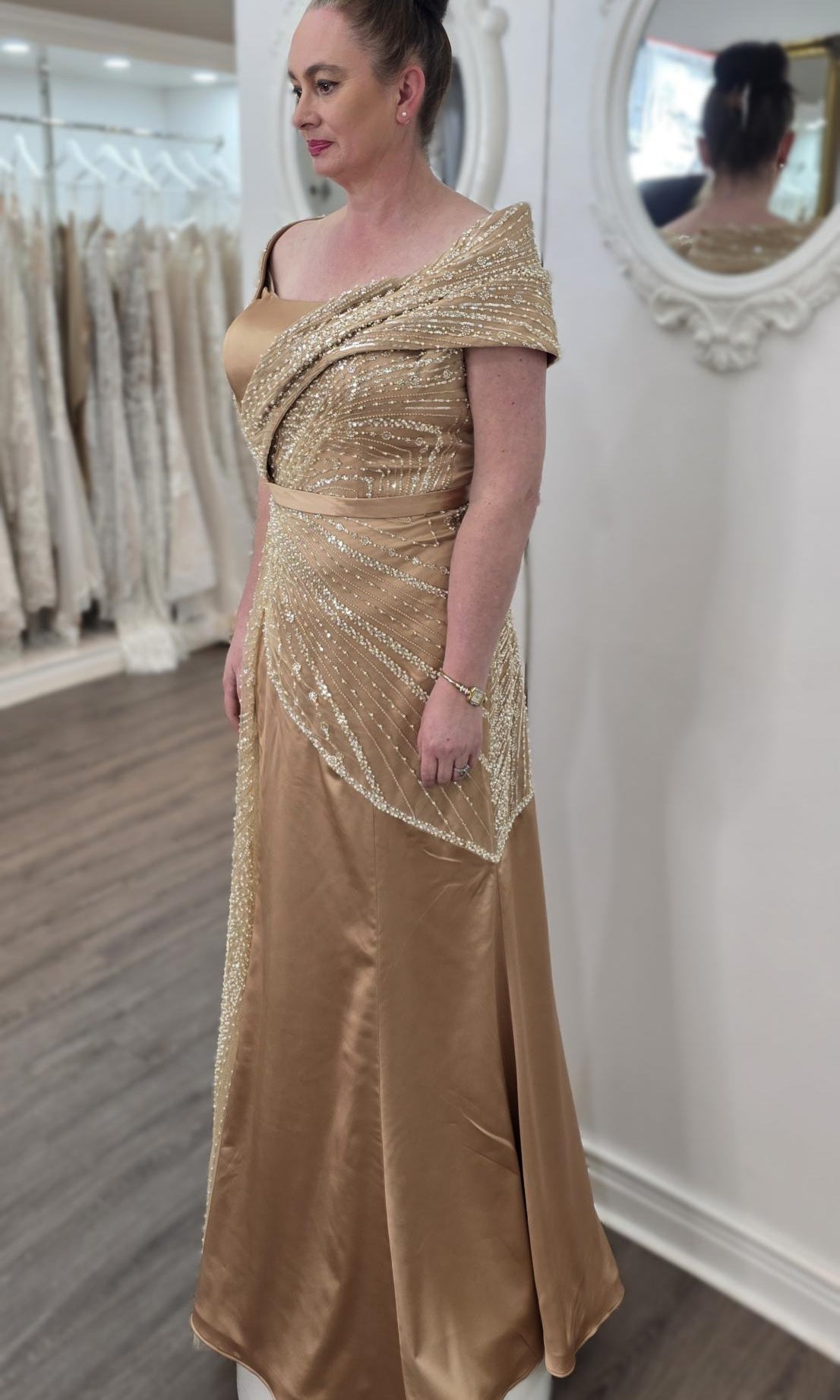 Elevate your special role as mother of the bride with our exquisitely crafted custom gown. This sophisticated dress combines classic elegance with contemporary design elements, ensuring you look and feel remarkable on your daughter's wedding day.