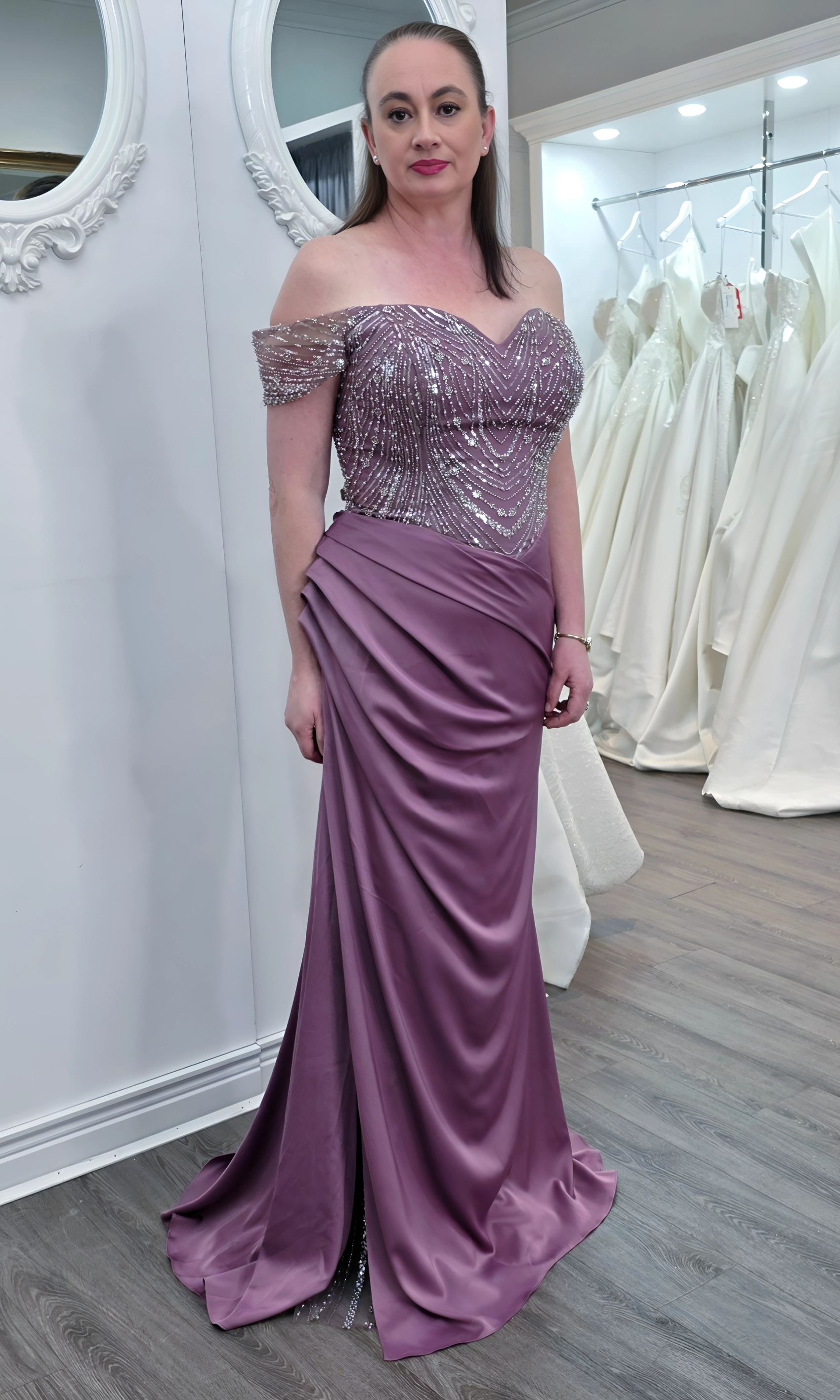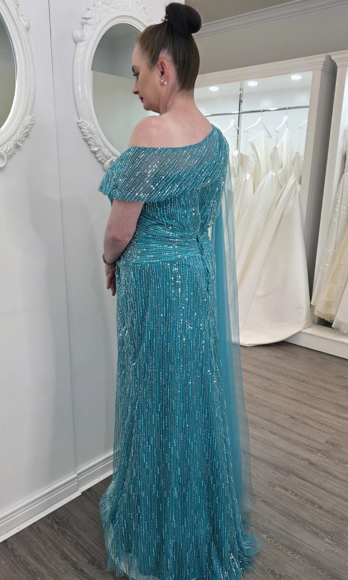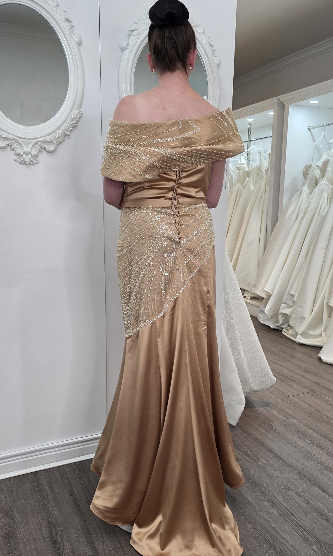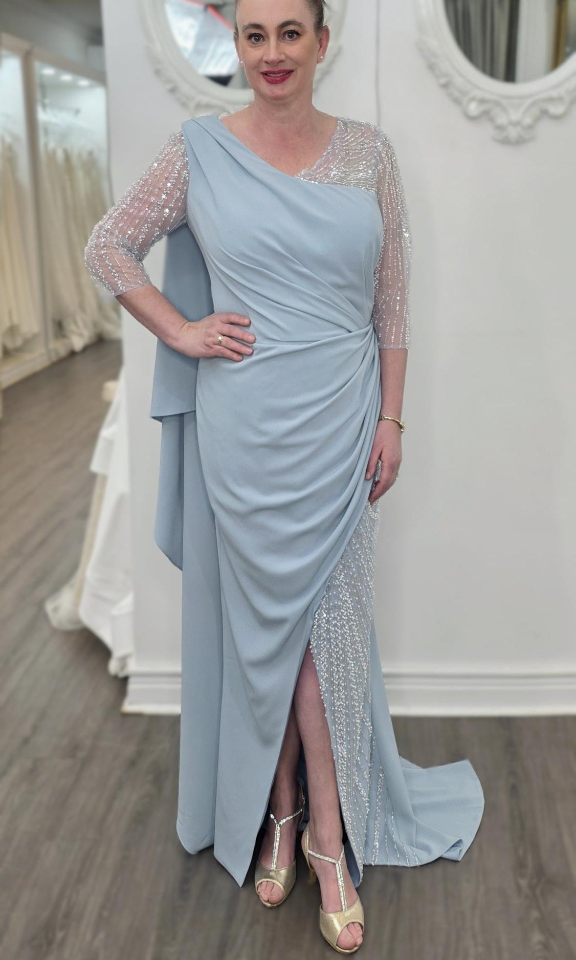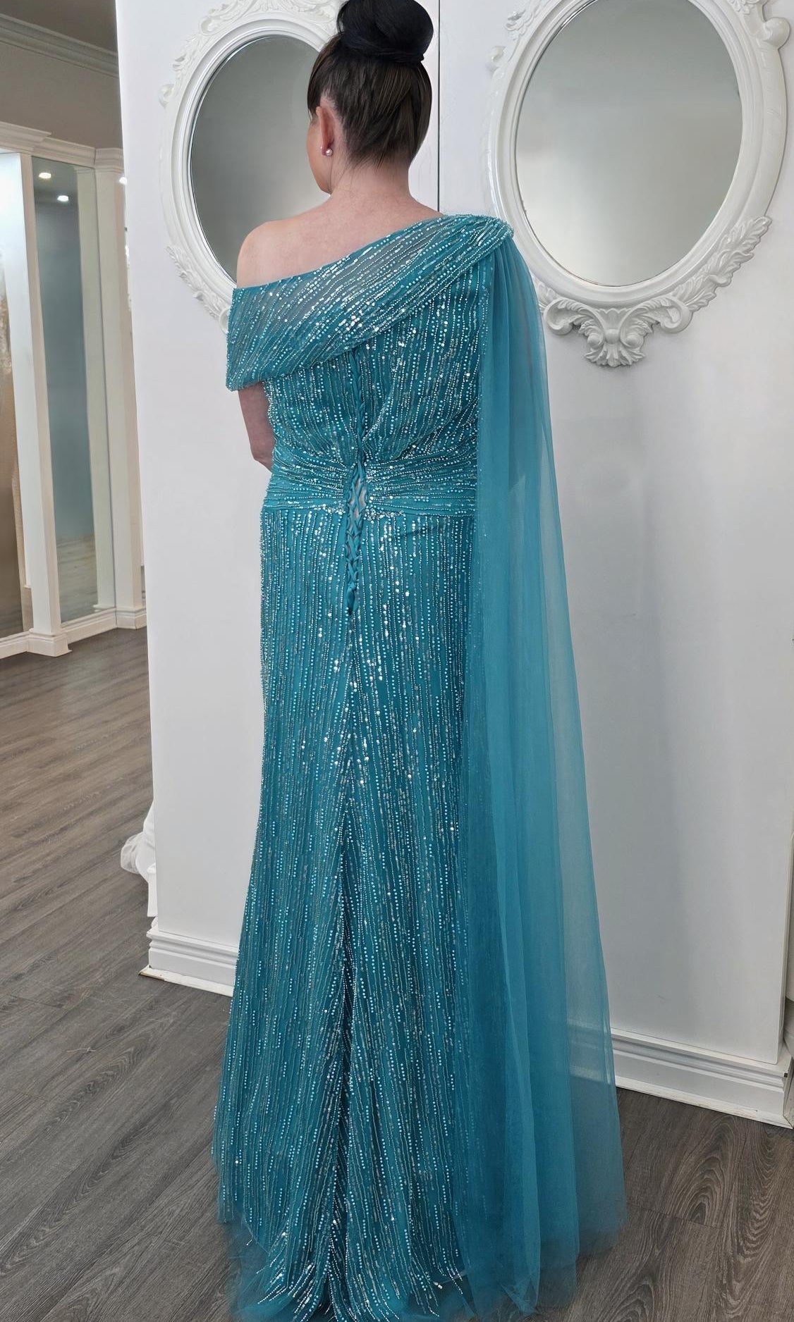 Elevate your special role as mother of the bride with our exquisitely crafted custom gown. This sophisticated dress combines classic elegance with contemporary design elements, ensuring you look and feel remarkable on your daughter's wedding day.