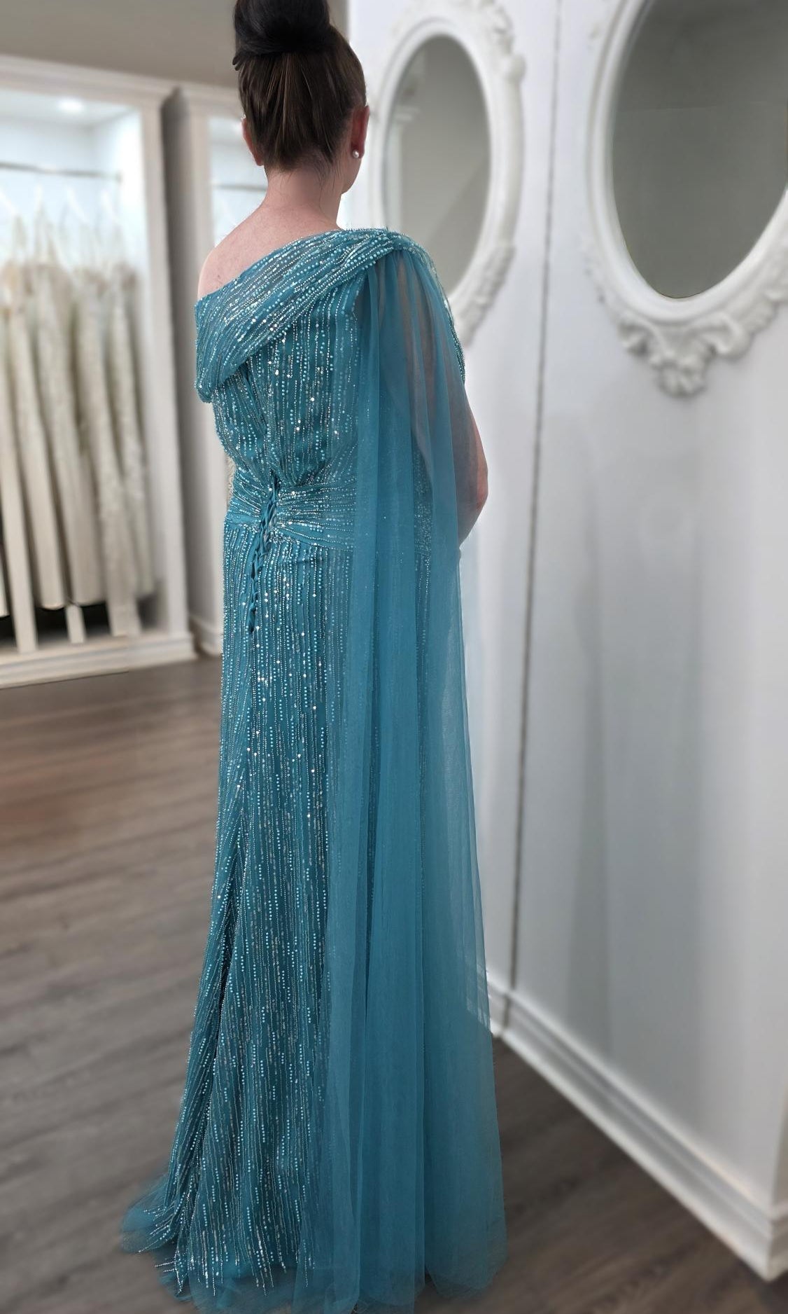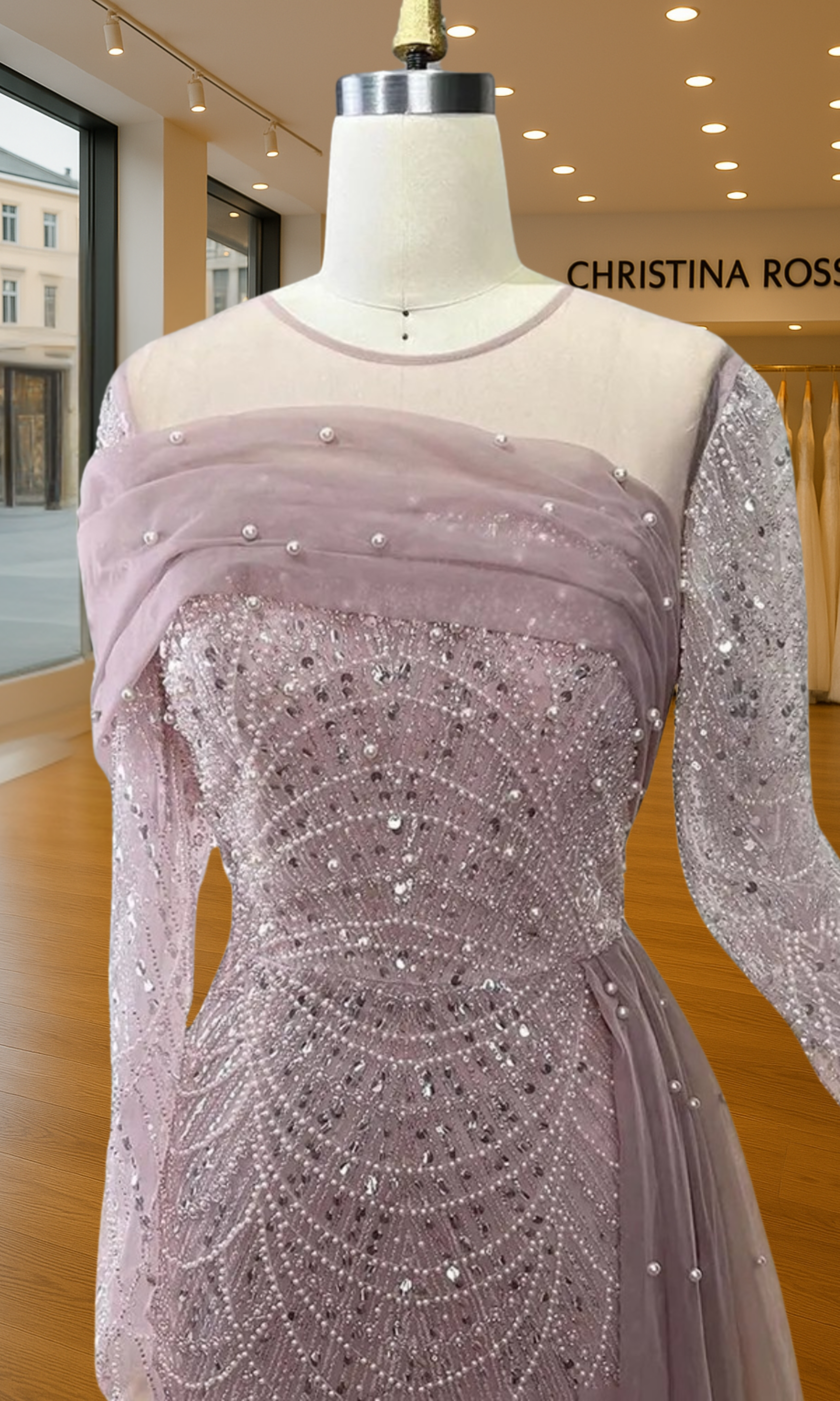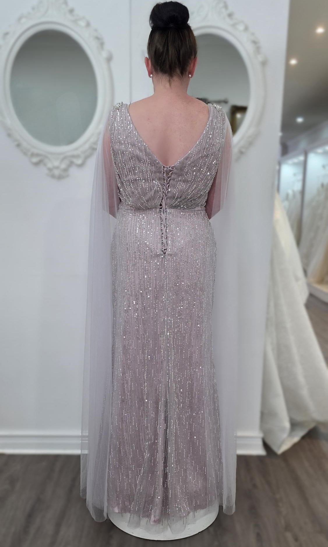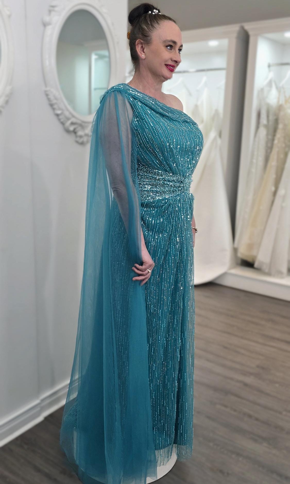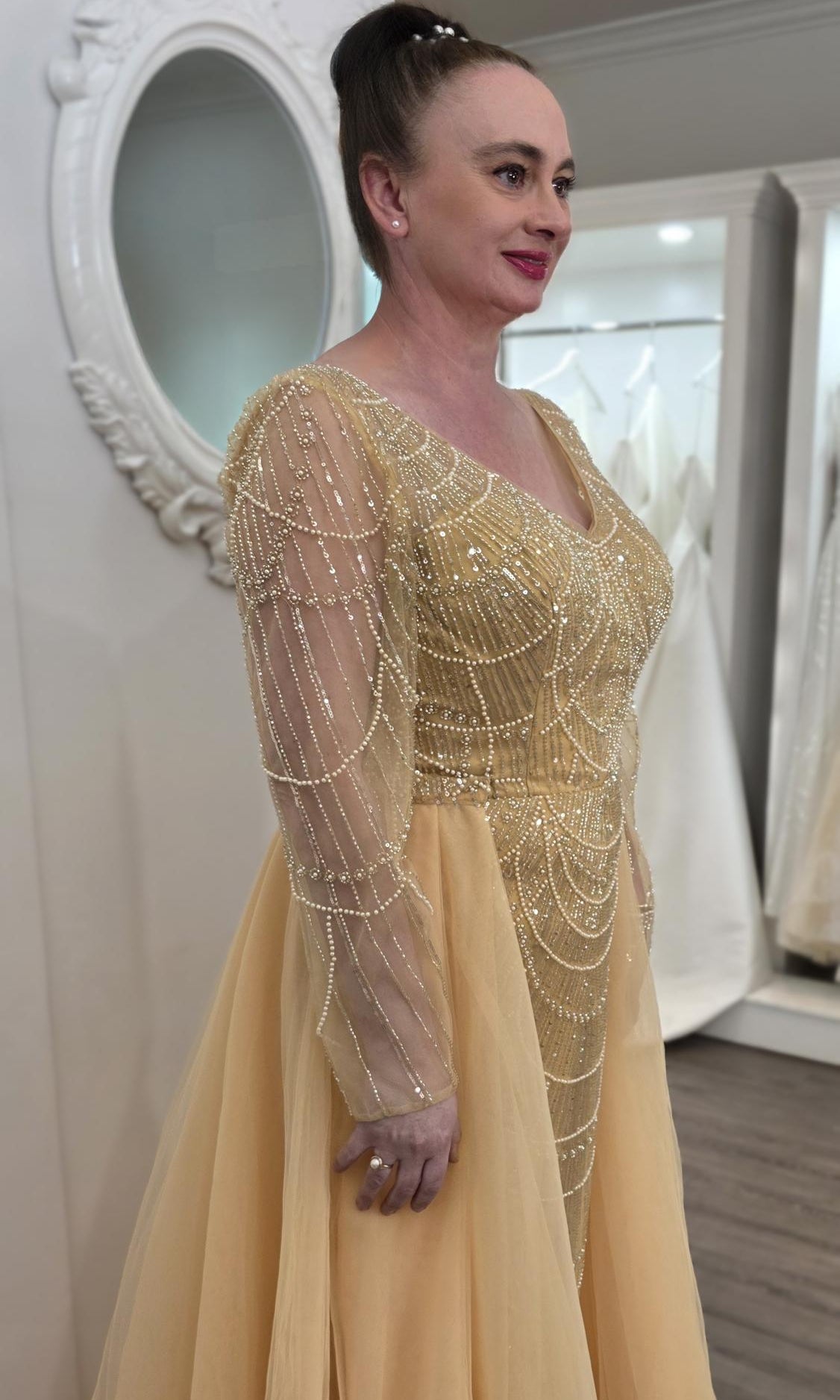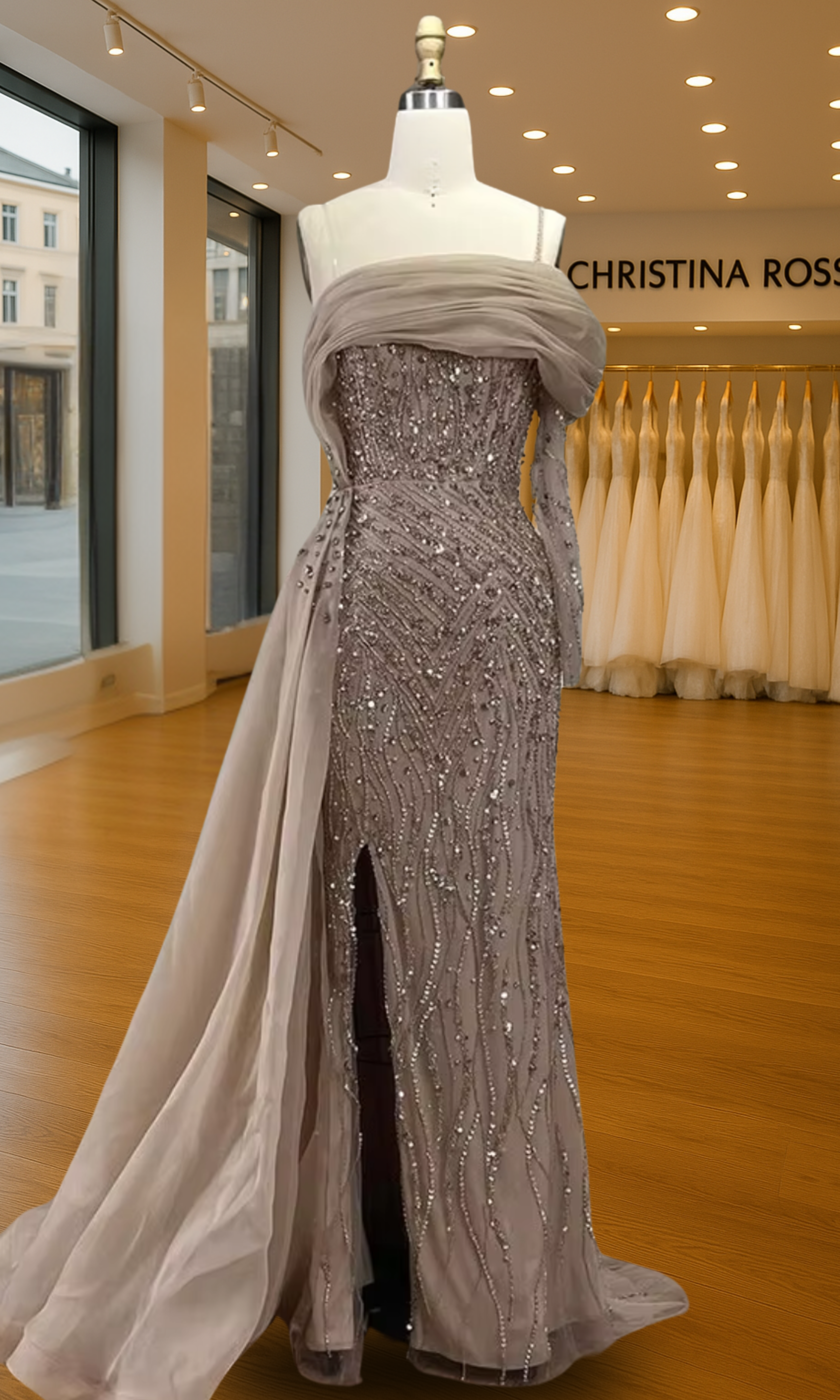 Elevate your special role as mother of the bride with our exquisitely crafted custom gown. This sophisticated dress combines classic elegance with contemporary design elements, ensuring you look and feel remarkable on your daughter's wedding day.