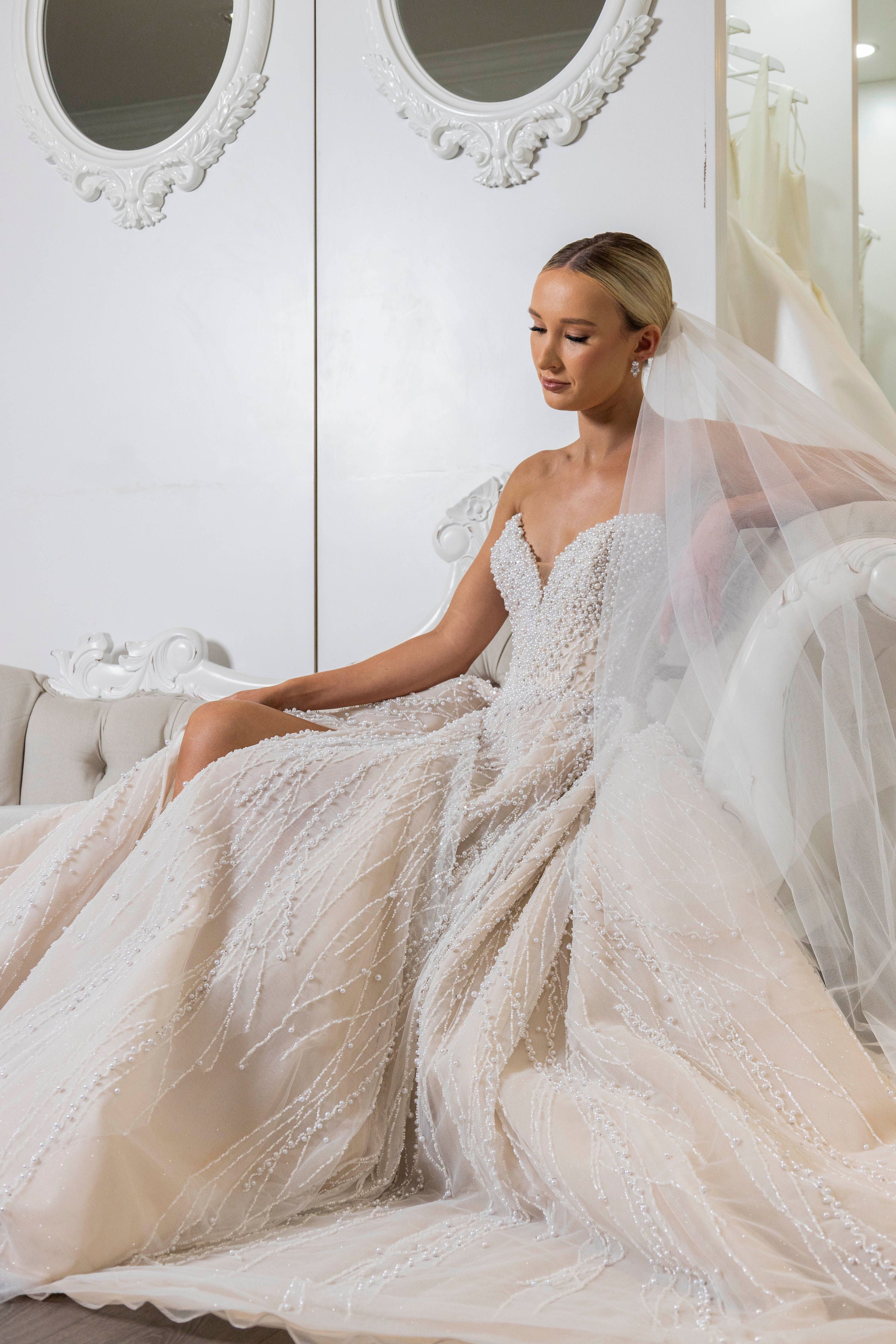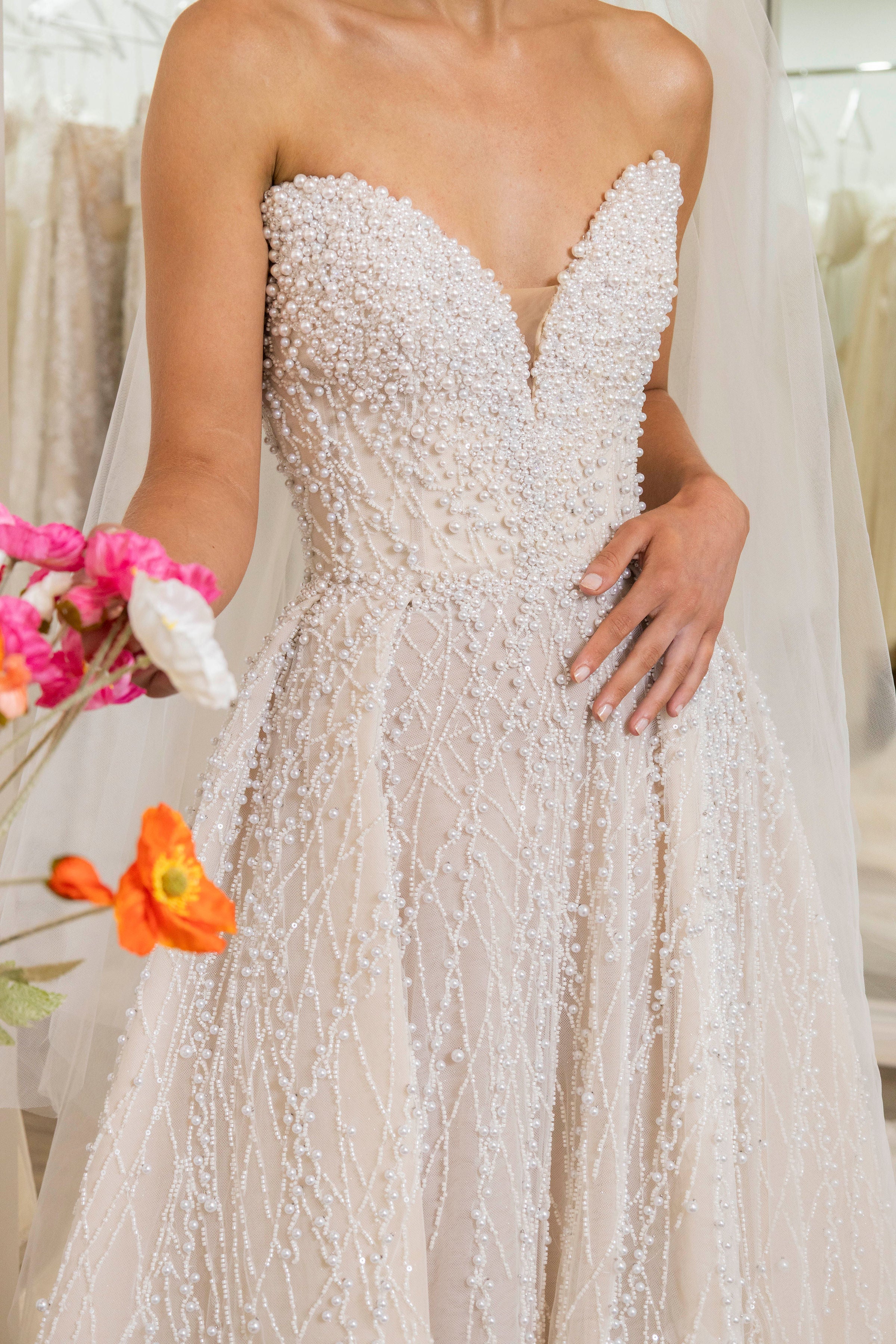 Crafted with the most delicate fully-beaded pearls in lace and tulle. This princess ball gown was hand embroidered with all-over pearls and crystals, and unique beading patterns. Casey is ready to turn heads as you walk down the aisle!