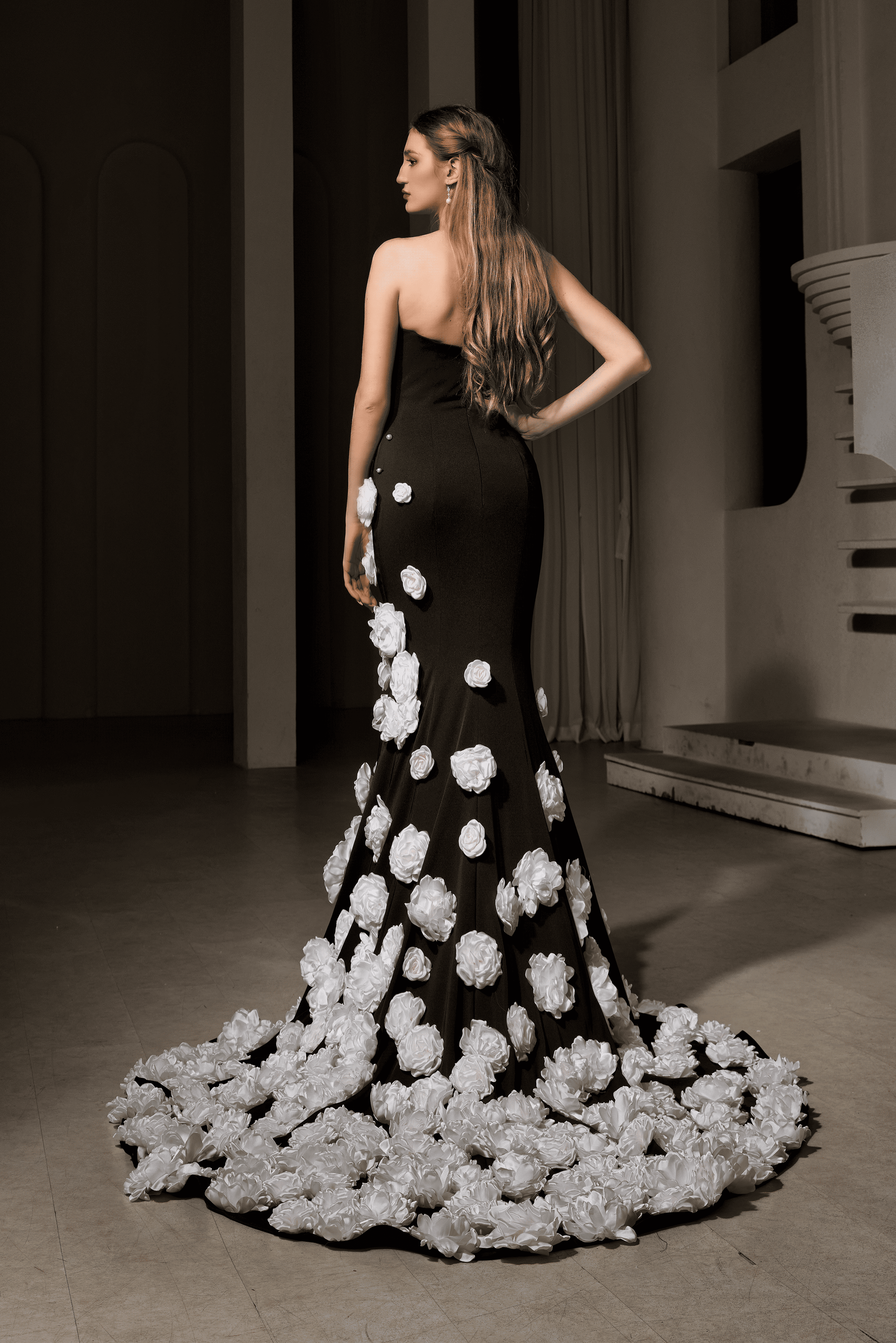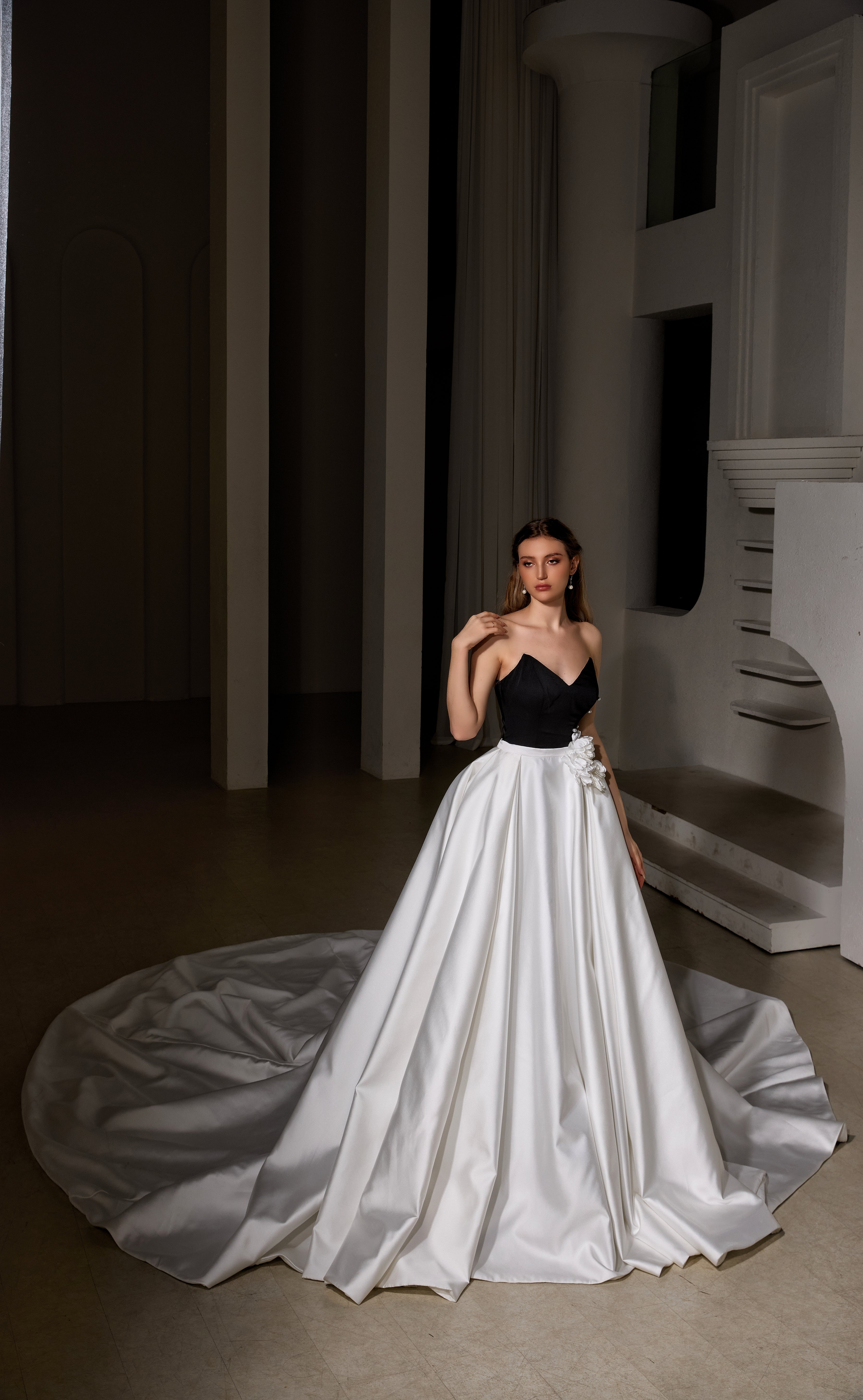 Chic and fashion-forward, this fit-and-flare gown is expertly crafted with luxurious satin fabric. The architectural strapless V-neckline melts into an illusion plunge while intentionally-placed seams adorned with white 3D florals and pearls that effortlessly elongate the body. A seemingly endless train, featuring an invisible zipper closure at the back, complete this elegant and refined bridal look.