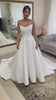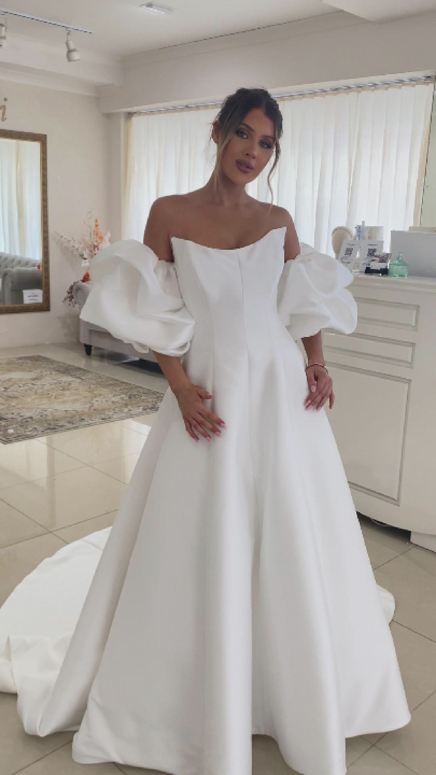 Designed with an elegant off-the-shoulder neckline, the structured bodice features clean lines that beautifully contour the figure before flowing into a full A-line satin skirt that creates a graceful, voluminous silhouette. The statement puff sleeves add a touch of dramatic flair—soft yet sculptural—perfectly balancing contemporary edge with classic bridal charm.