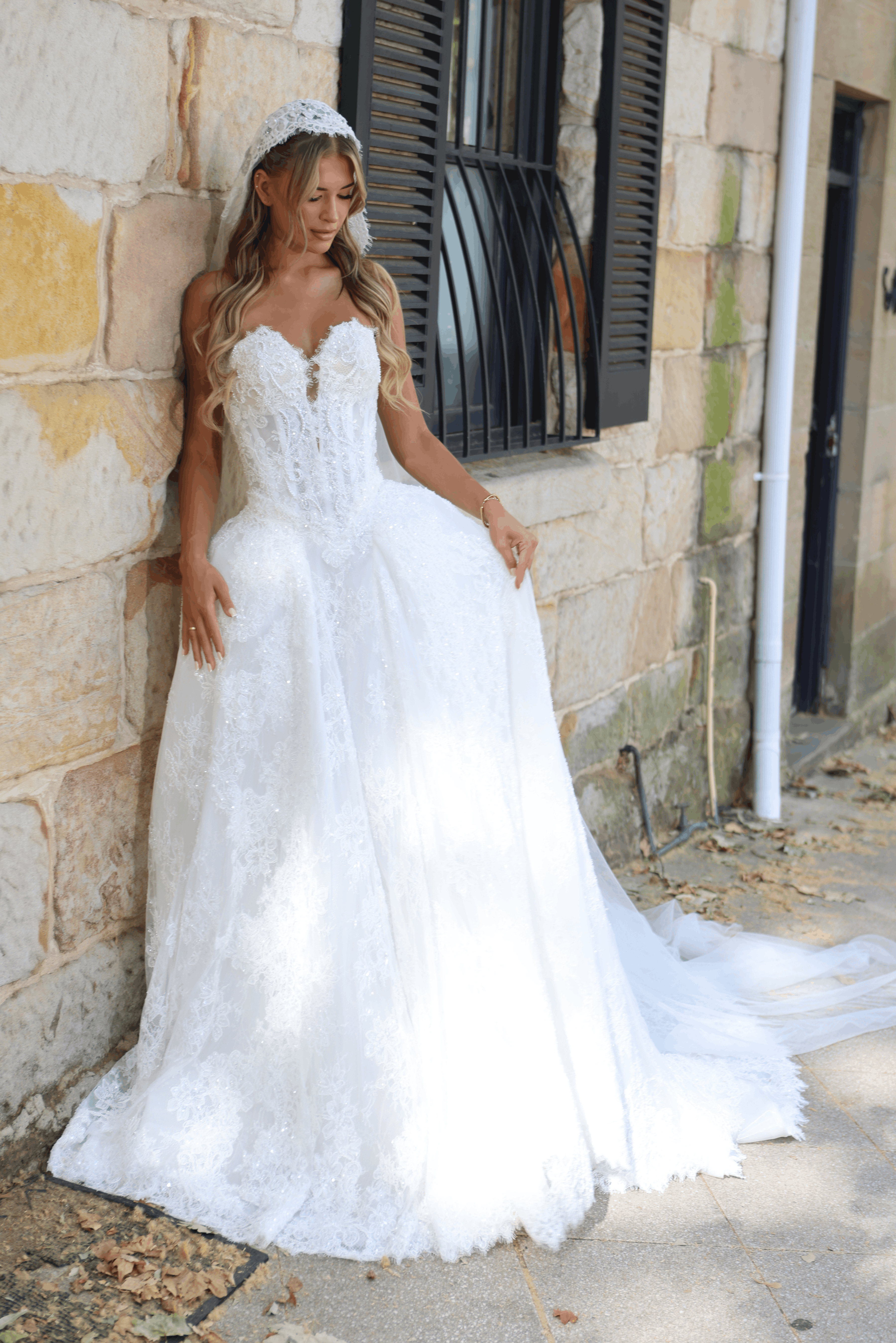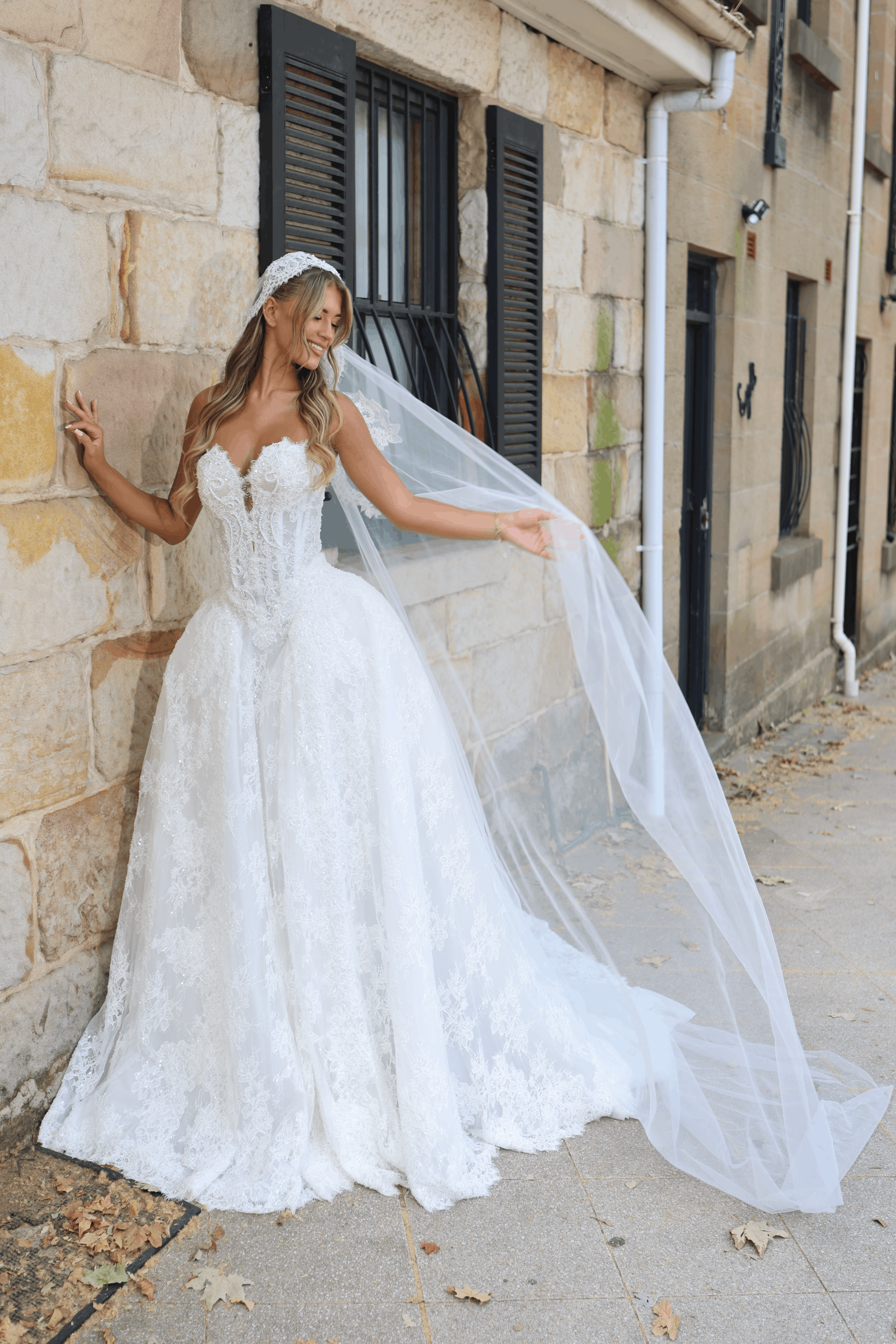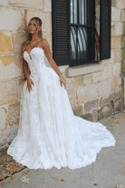 Venice in a sweetheart neckline reimagines this princess ball gown with a softer, romantic allure. The sculpted corset bodice is adorned with intricate lace appliqué over a sheer structured base, curving gracefully across the décolletage to enhance and flatter, while delicate detailing melts seamlessly into the drop-waist. The voluminous skirt blooms into layers of fine and embroidered lace, flowing into a cathedral-length train finished with refined lace edging for a truly regal statement.