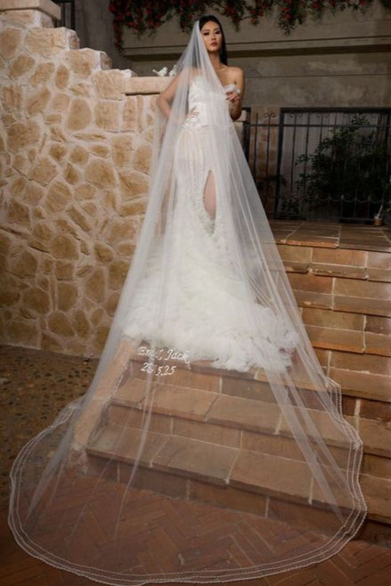 Transform your bridal look with our stunning Bella cathedral veil, where classic sophistication meets contemporary design. Featuring an eye-catching horsehair trim that creates architectural definition and movement, this veil makes an unforgettable statement for the modern bride.