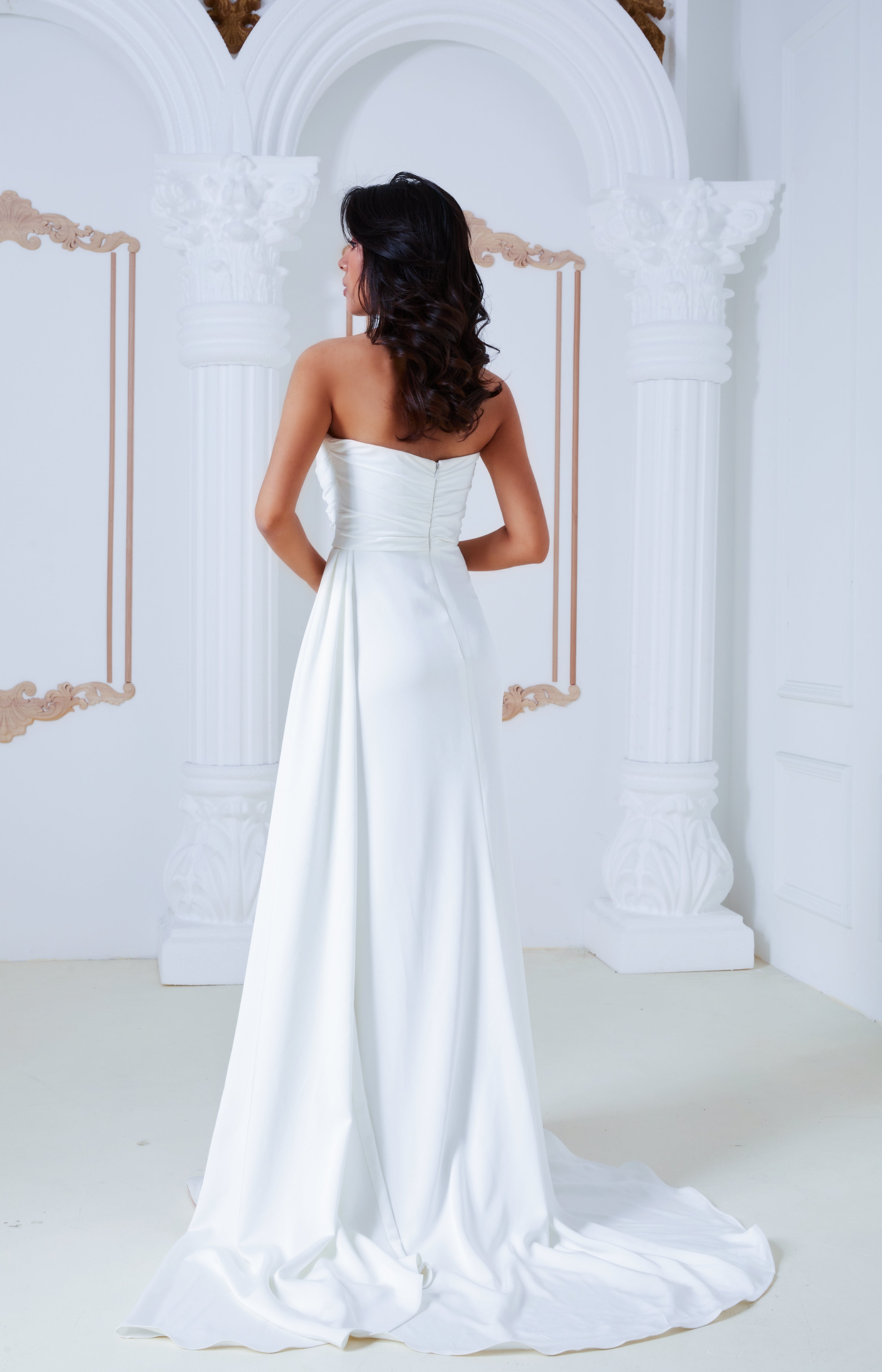 Kathy is for the bride who wants a timeless, classic, and elegant. Made from satin featuring a front split, cat eye neckline, this gown showcases a deep-V chestline and a graceful sweep train. Custom-tailored for a perfect fit, it's the ideal choice for brides seeking a timeless and refined look.
