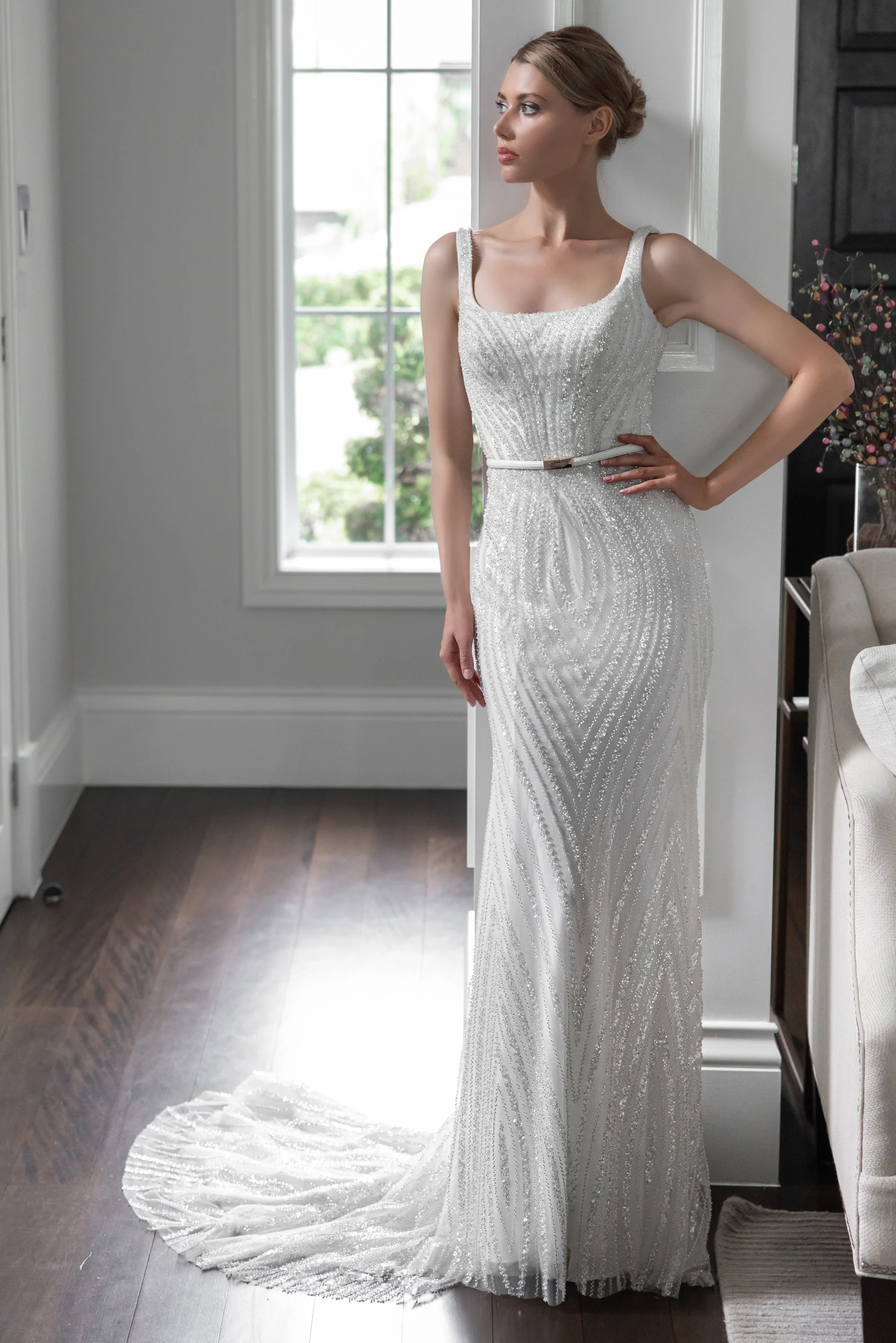 Modern linear sparkle beaded fitted gown with modern square neckline. Couture Style includes Calico fitting, made-to-your-size measurement, and basic customization option.