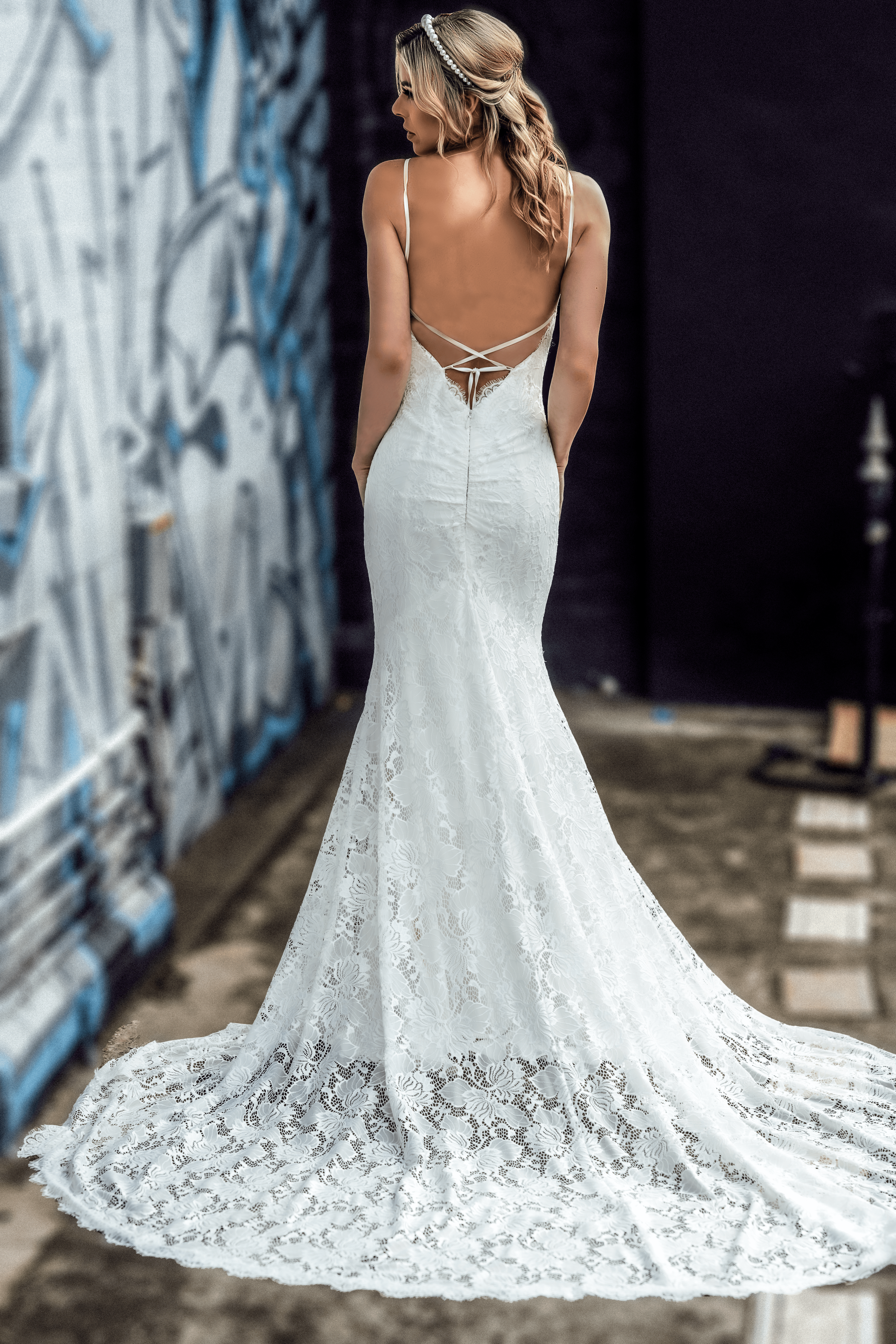 A combination of the dramatic silhouette and featuring iconic, stretchy lace, SAMMY is finished with exquisite eyelash detailing around the plunging V-neckline, low back and hem. A fit-and-flare silhouette that accentuates your best assets, achieving the perfect amount of va-va-voom! Zeynep comes with spaghetti straps, ivory lining & an artistic train.Β