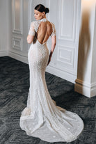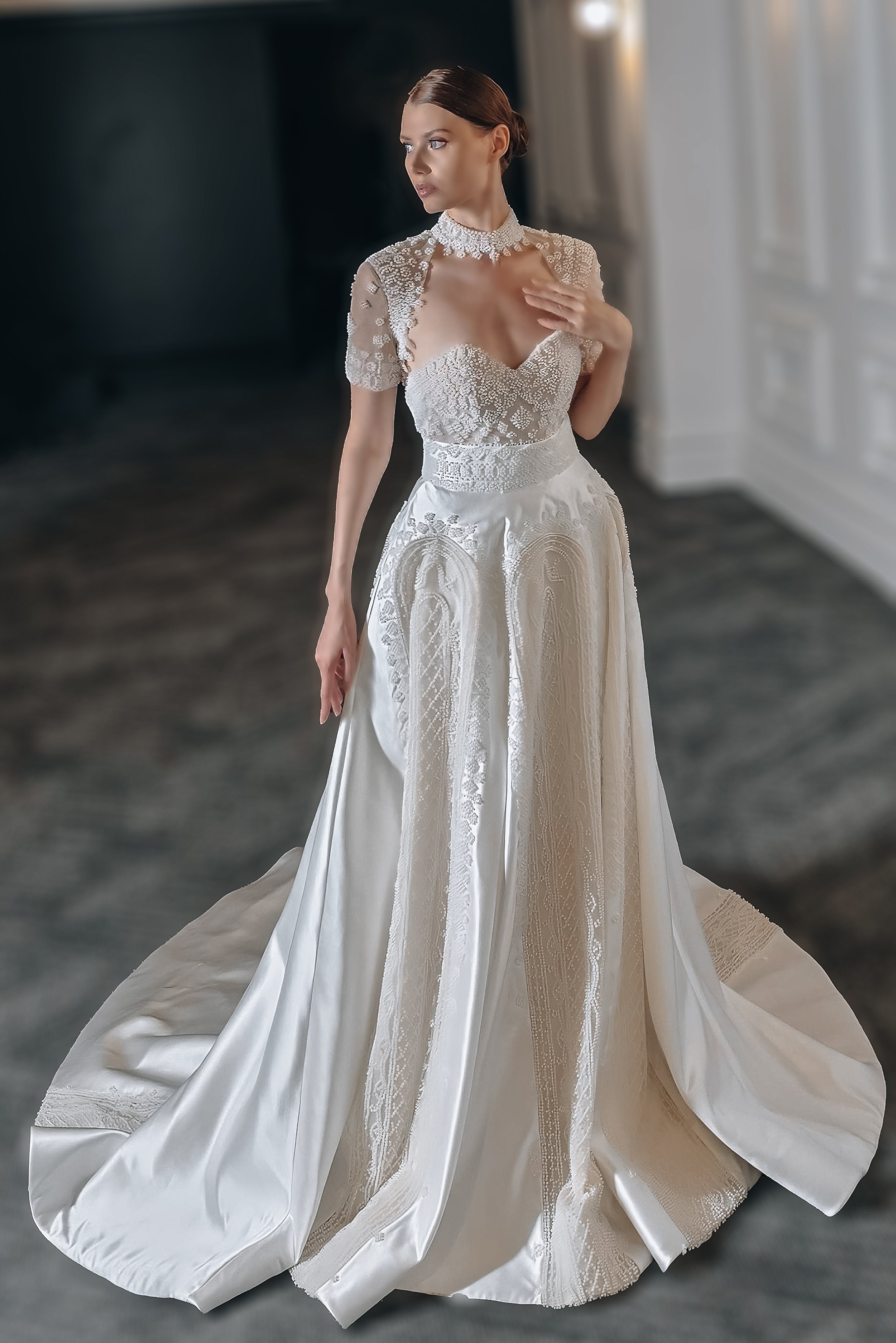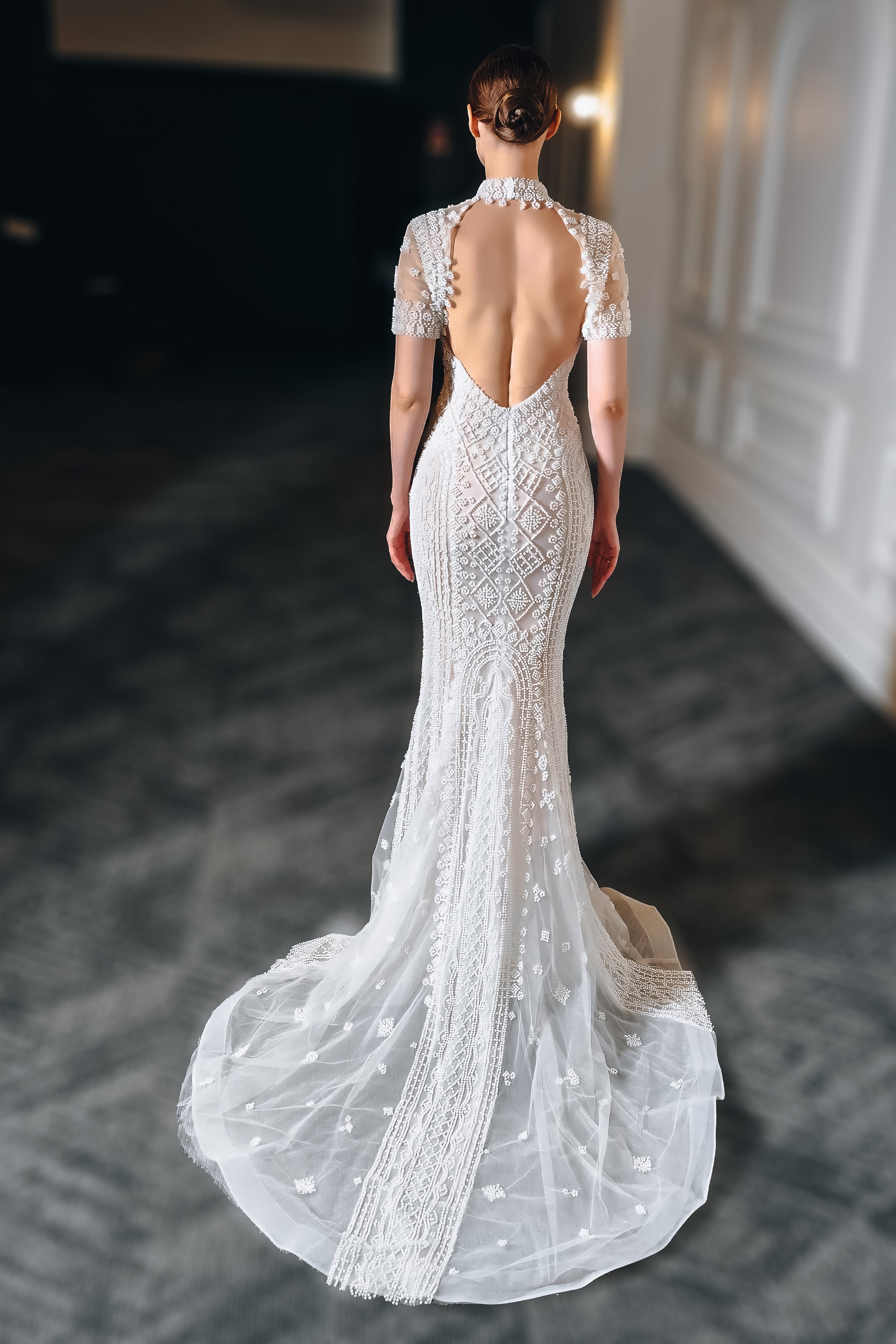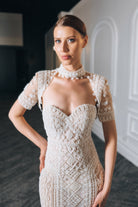This gorgeous mermaid gown gracefully embraces the body with on-trend asymmetrical hand-made beadings. Its detachable bolero, and train give you an additional look that's perfect on your wedding day. Crafted in luxurious embroidered lace and tulle.