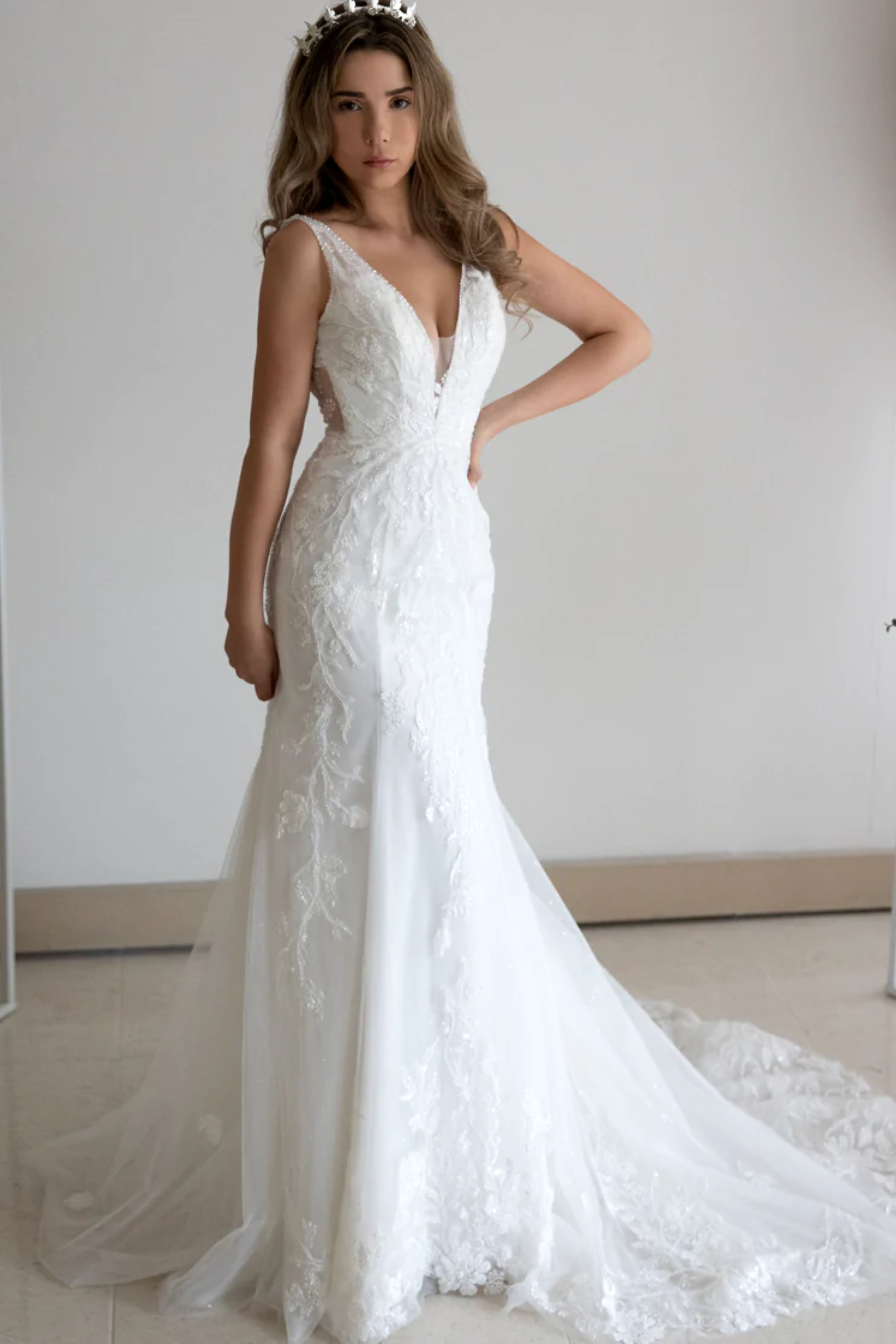 Figure-hugging fit and flare design that flows freely into a perfect mermaid train, with deep-plunge neckline and tulle illusion back details.