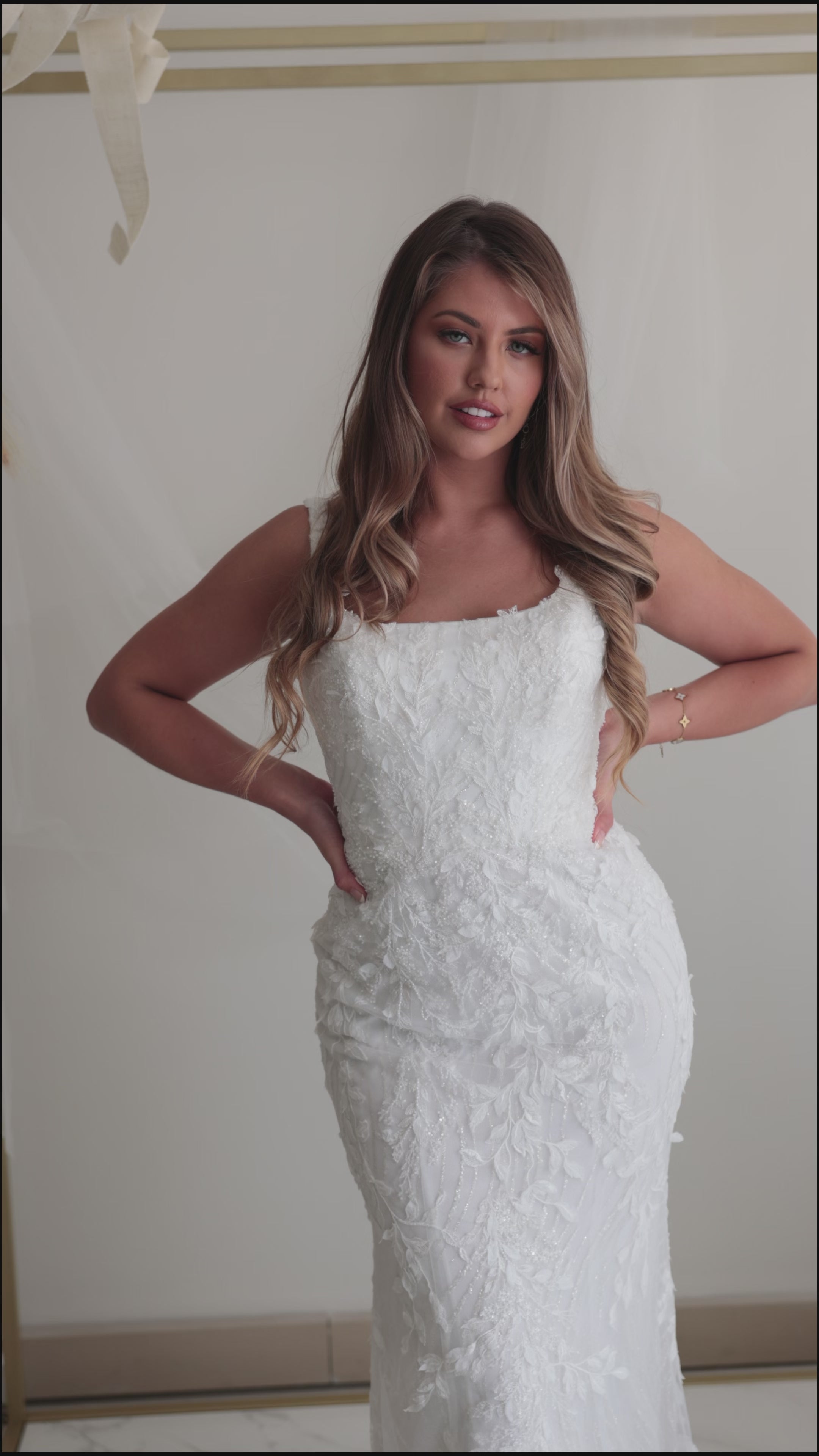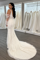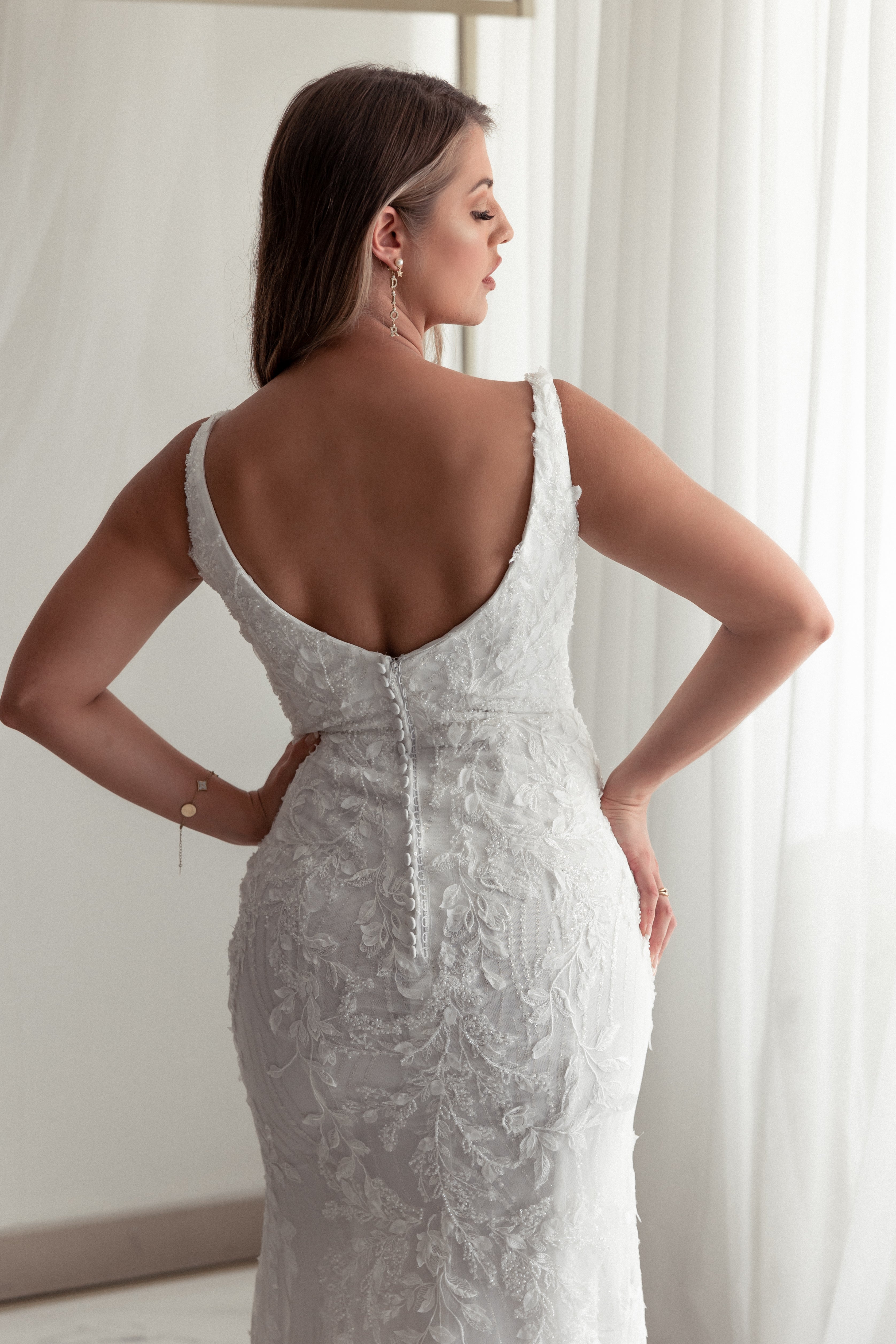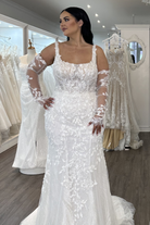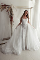 Be a glam goddess in our Astrid wedding dress. The fitted mermaid gown accented with 3D lace motifs including a detachable overskirt is the perfect mix of timeless and modern. The see-through bodice with a square neckline with floral straps and a sexy low back.