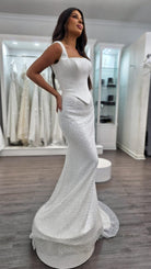 Designed for the contemporary bride who adores timeless glamour, this gown is the perfect harmony of structure and sparkle — minimal, luxurious, and endlessly captivating.