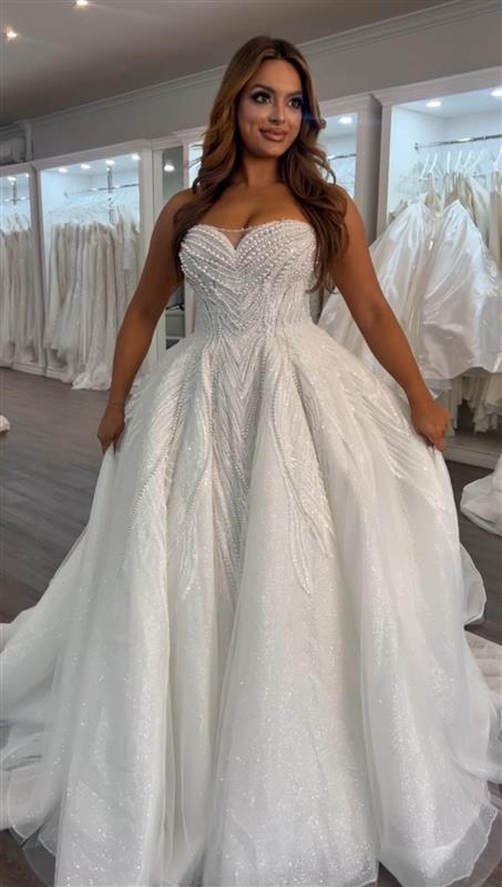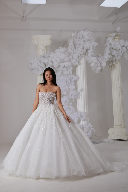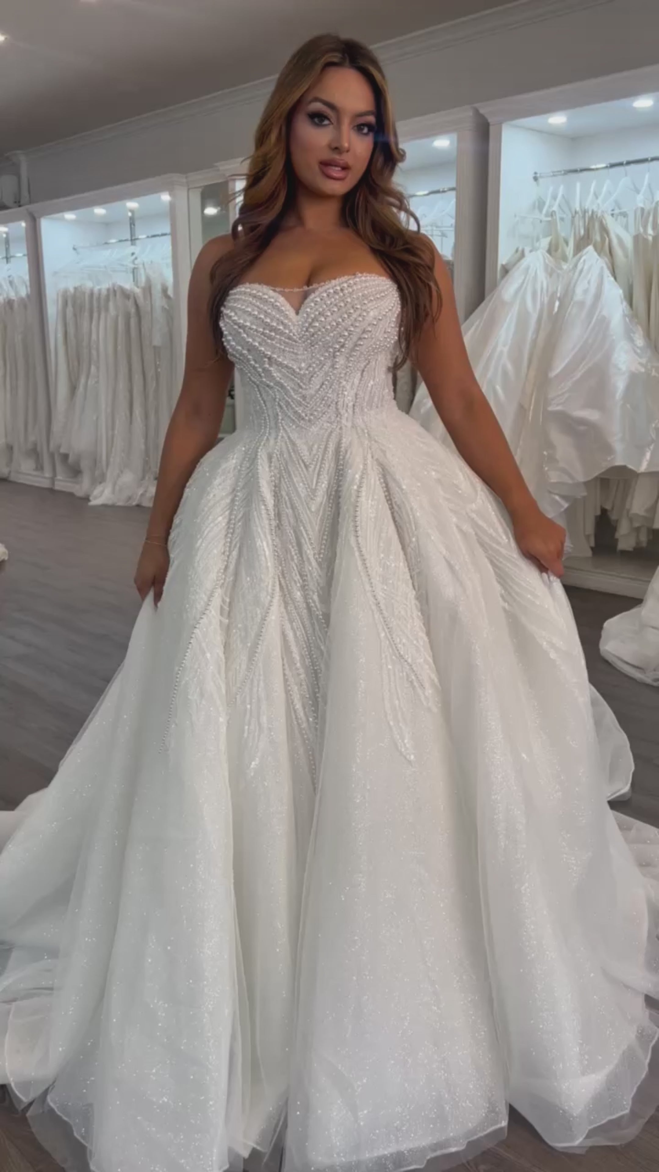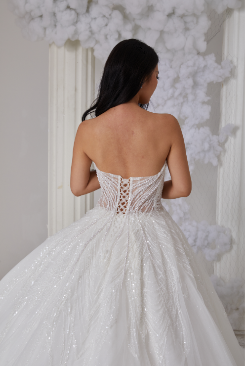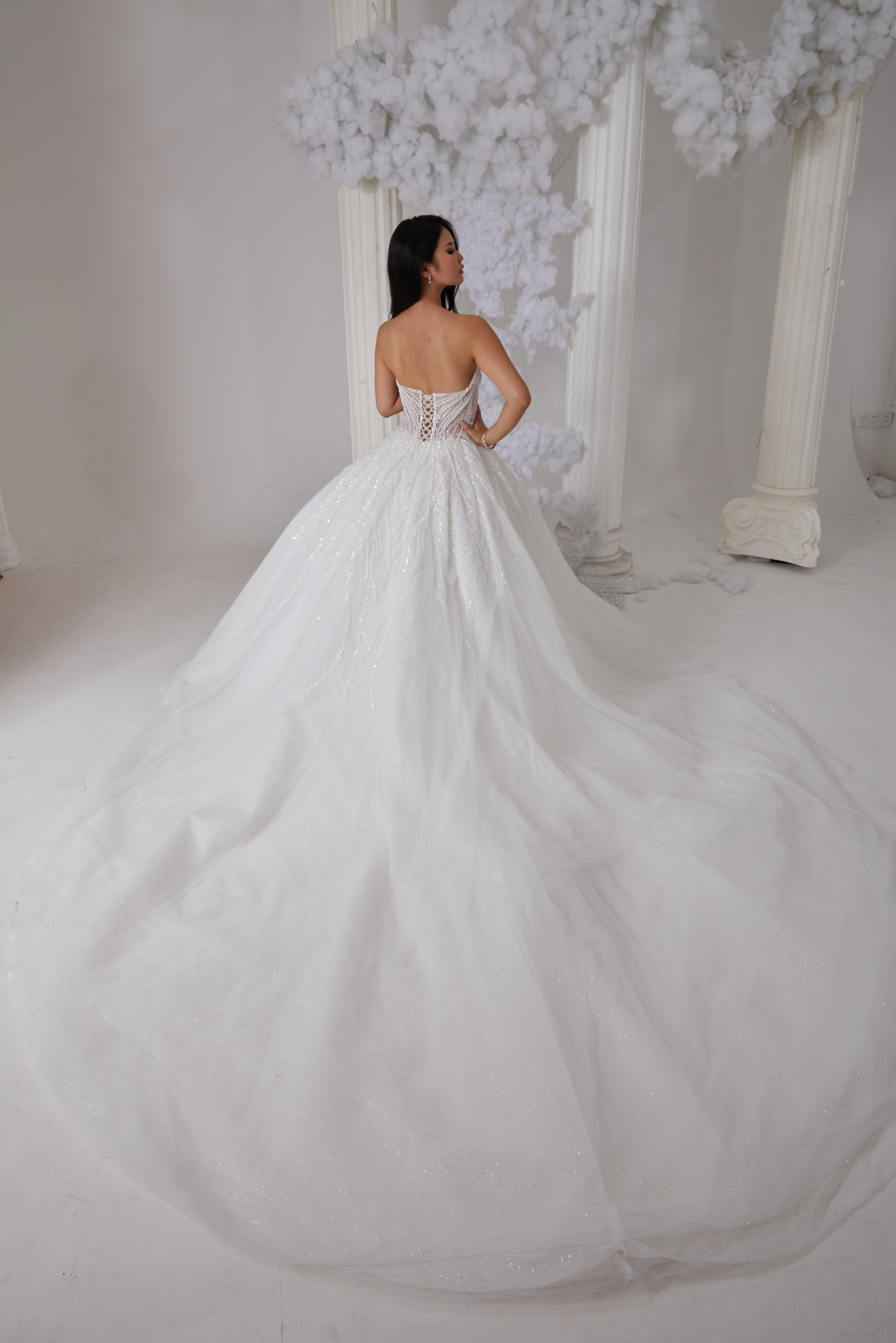 Exceptional wedding ball gown with exquisite embellishments of sequins, beads, and lustrous pearls. Featuring a boat neckline with an additional shaping corset sewn in, and a lace-up on the back. The bridal look ends with a dreamy tulle skirt cascading into a magnificent long train. The dress can be custom-tailored.