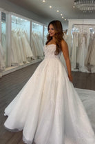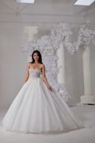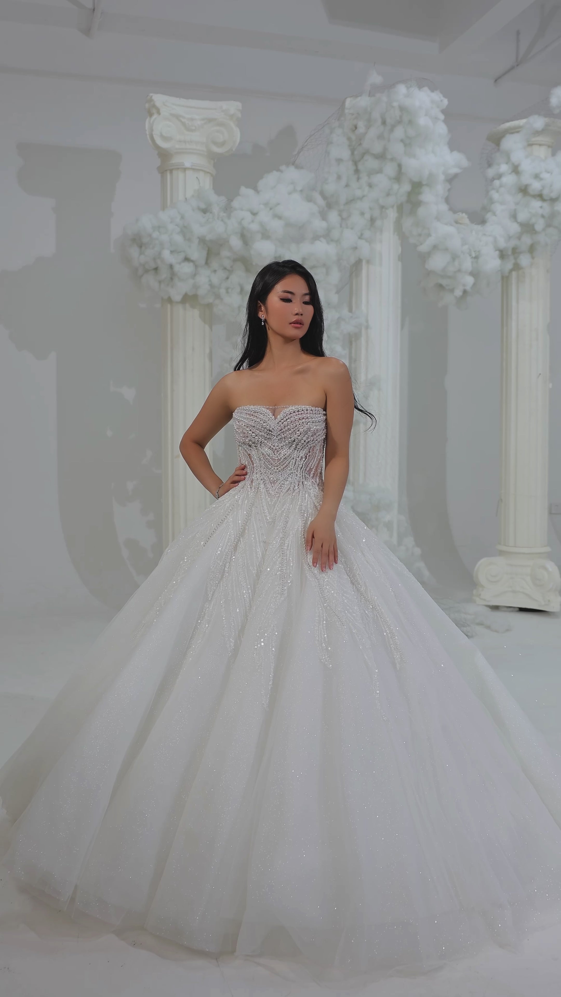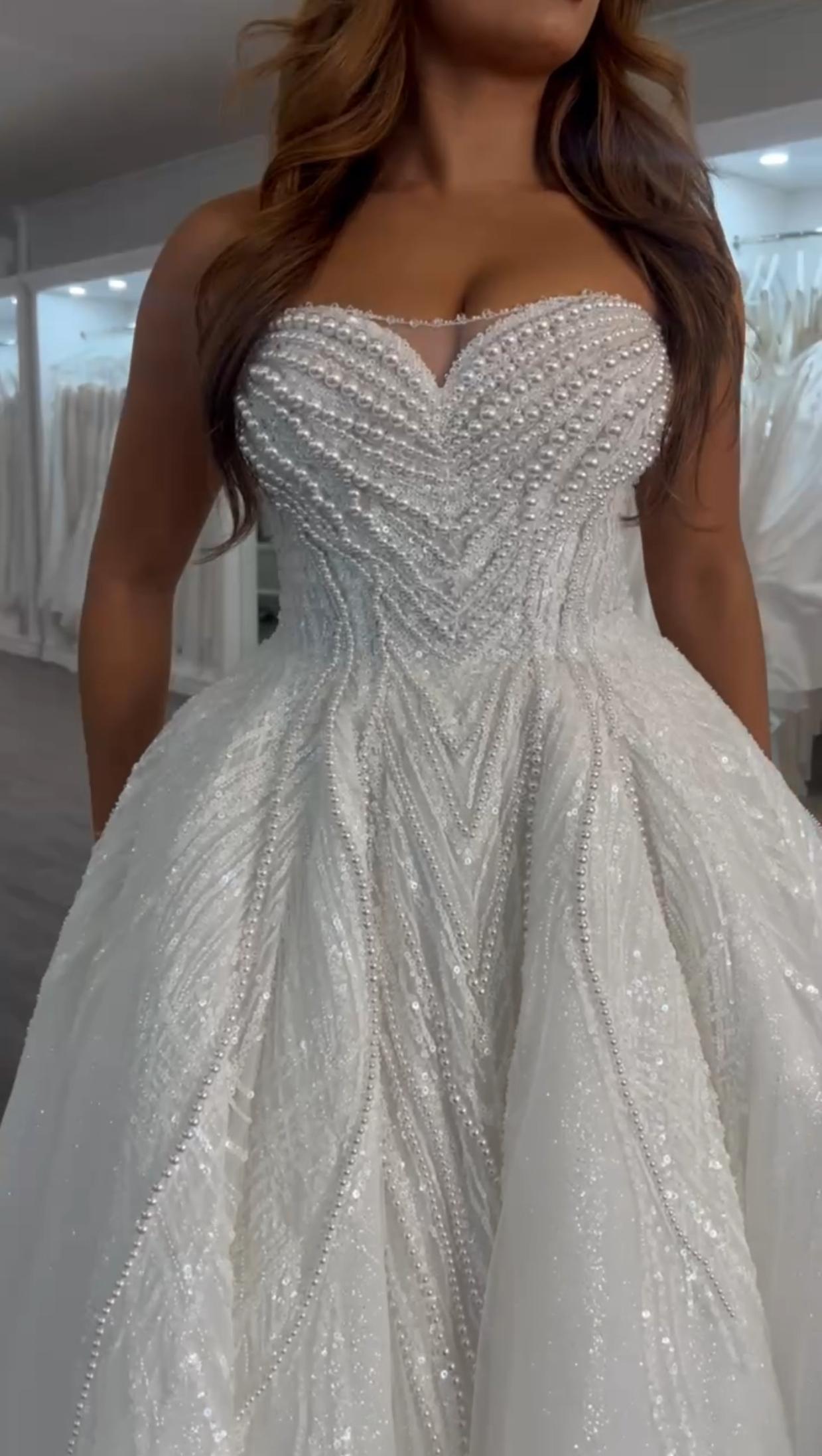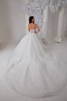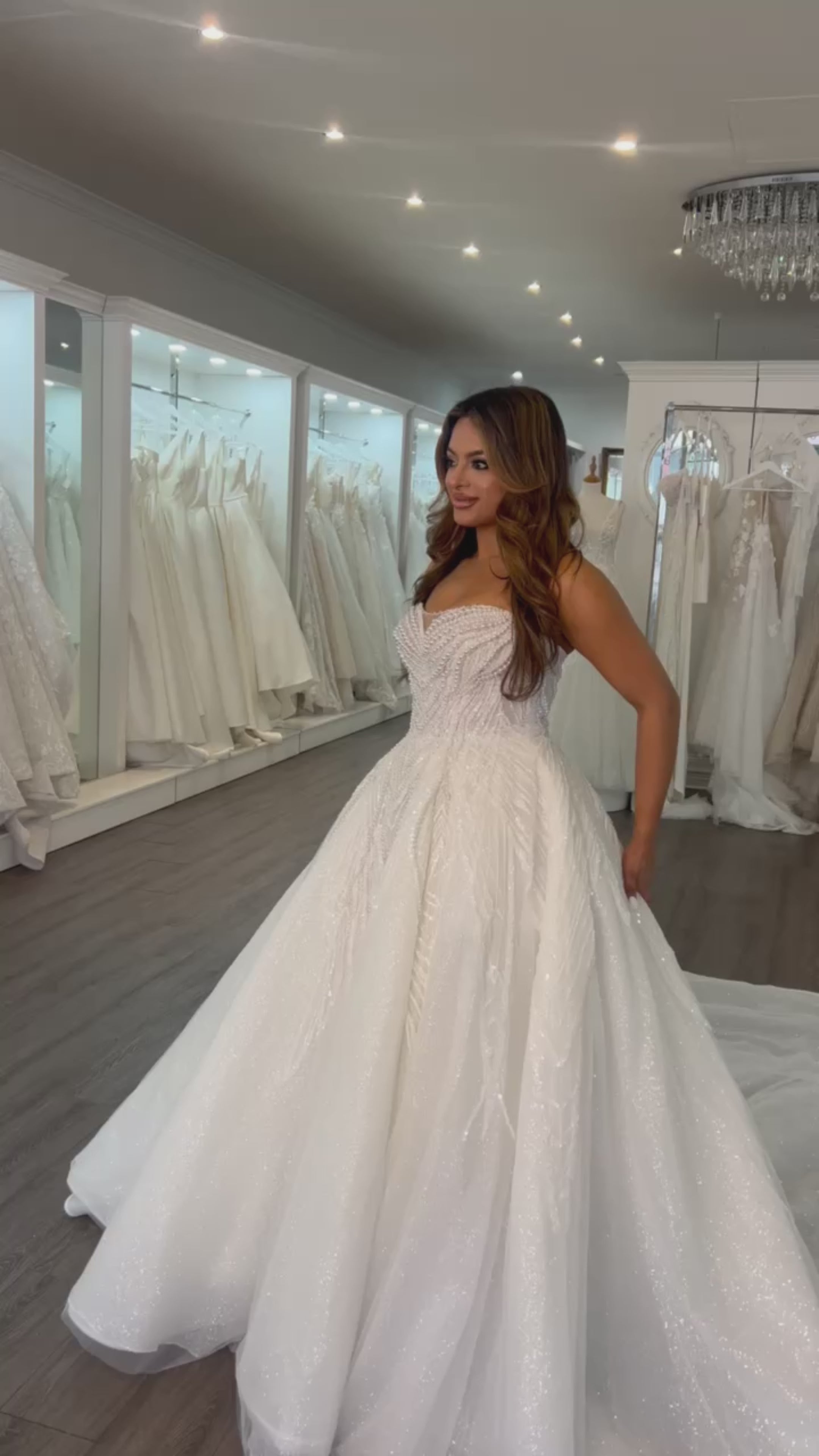 Exceptional wedding ball gown with exquisite embellishments of sequins, beads, and lustrous pearls. Featuring a boat neckline with an additional shaping corset sewn in, and a lace-up on the back. The bridal look ends with a dreamy tulle skirt cascading into a magnificent long train. The dress can be custom-tailored.