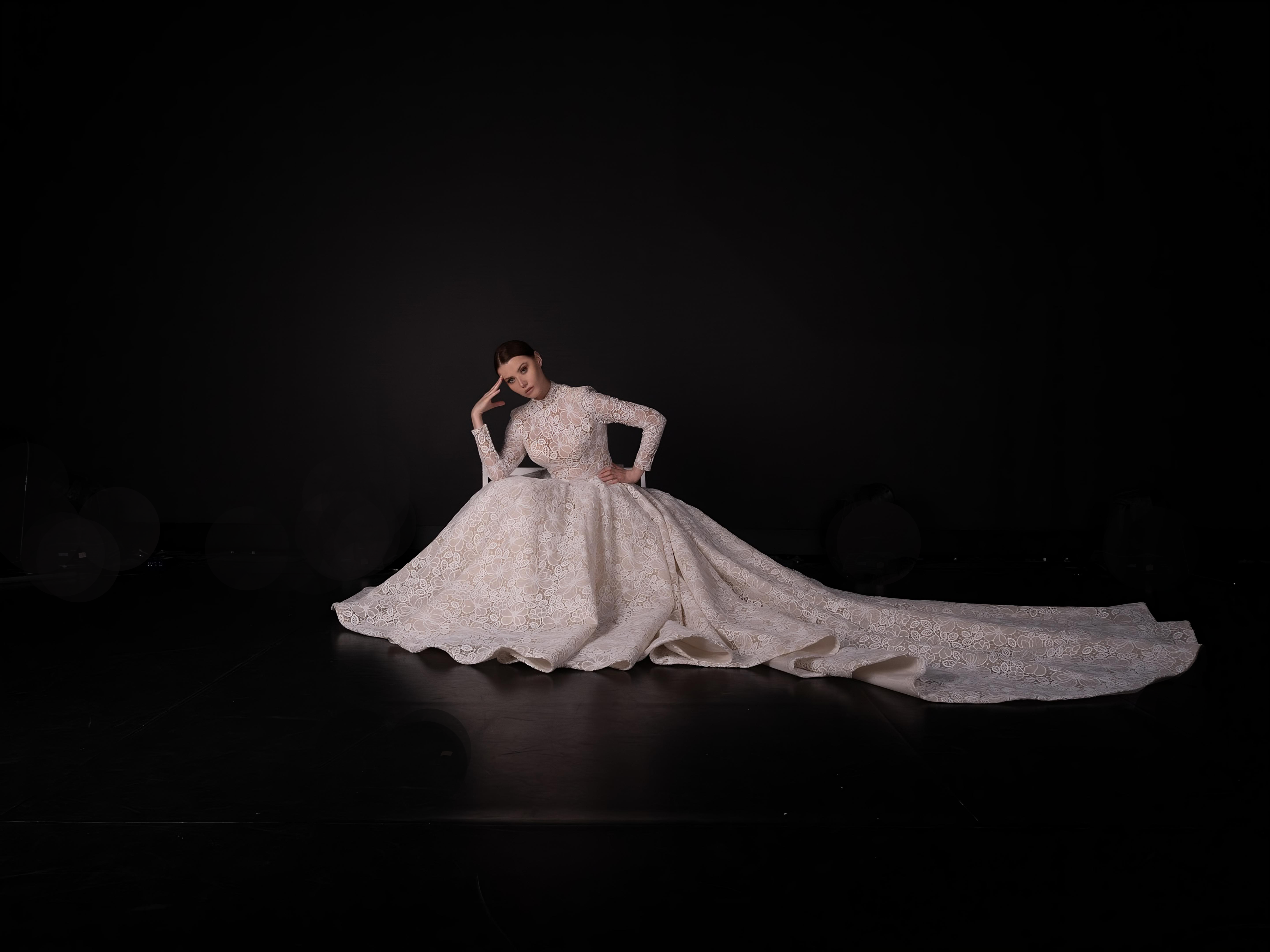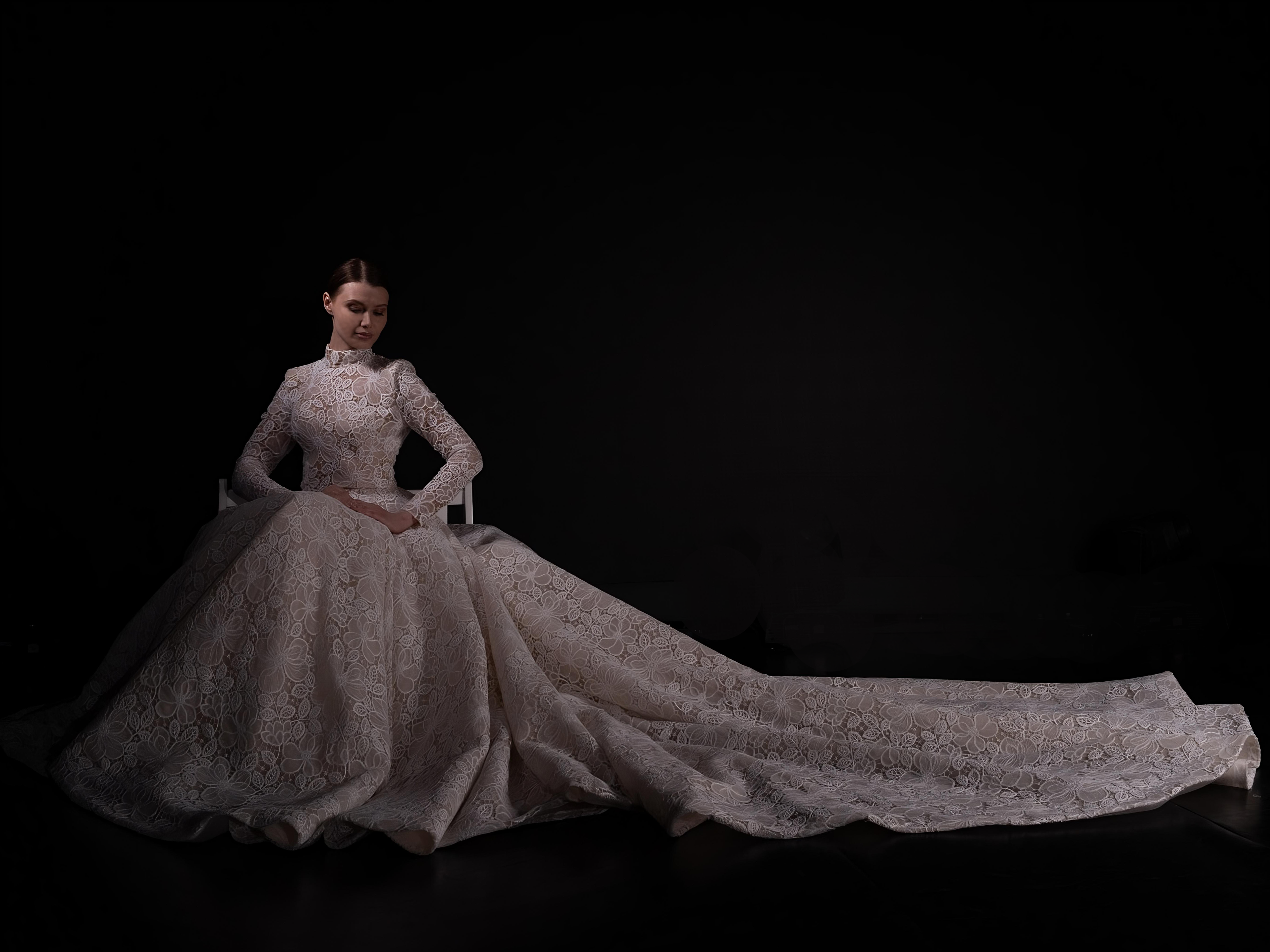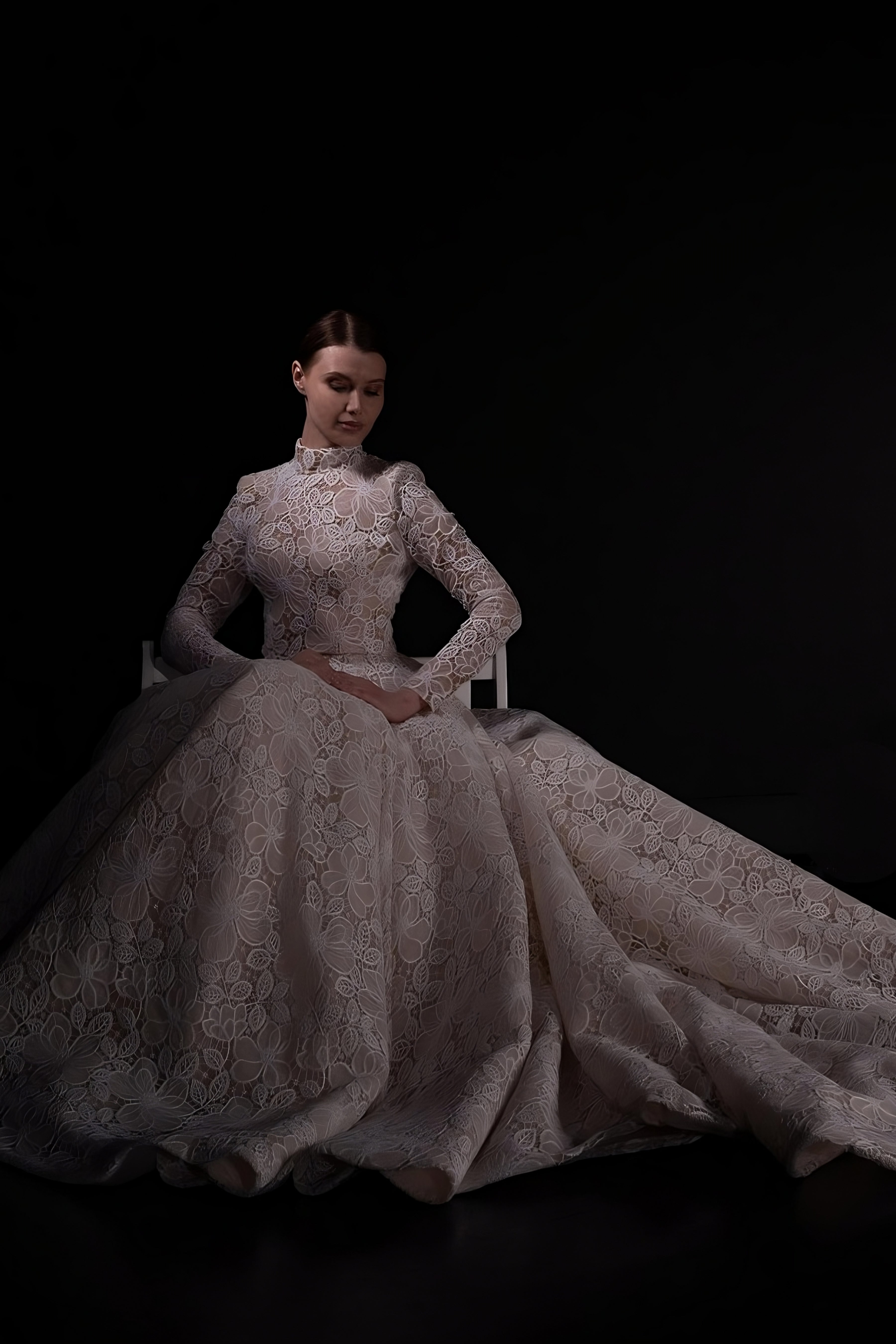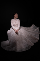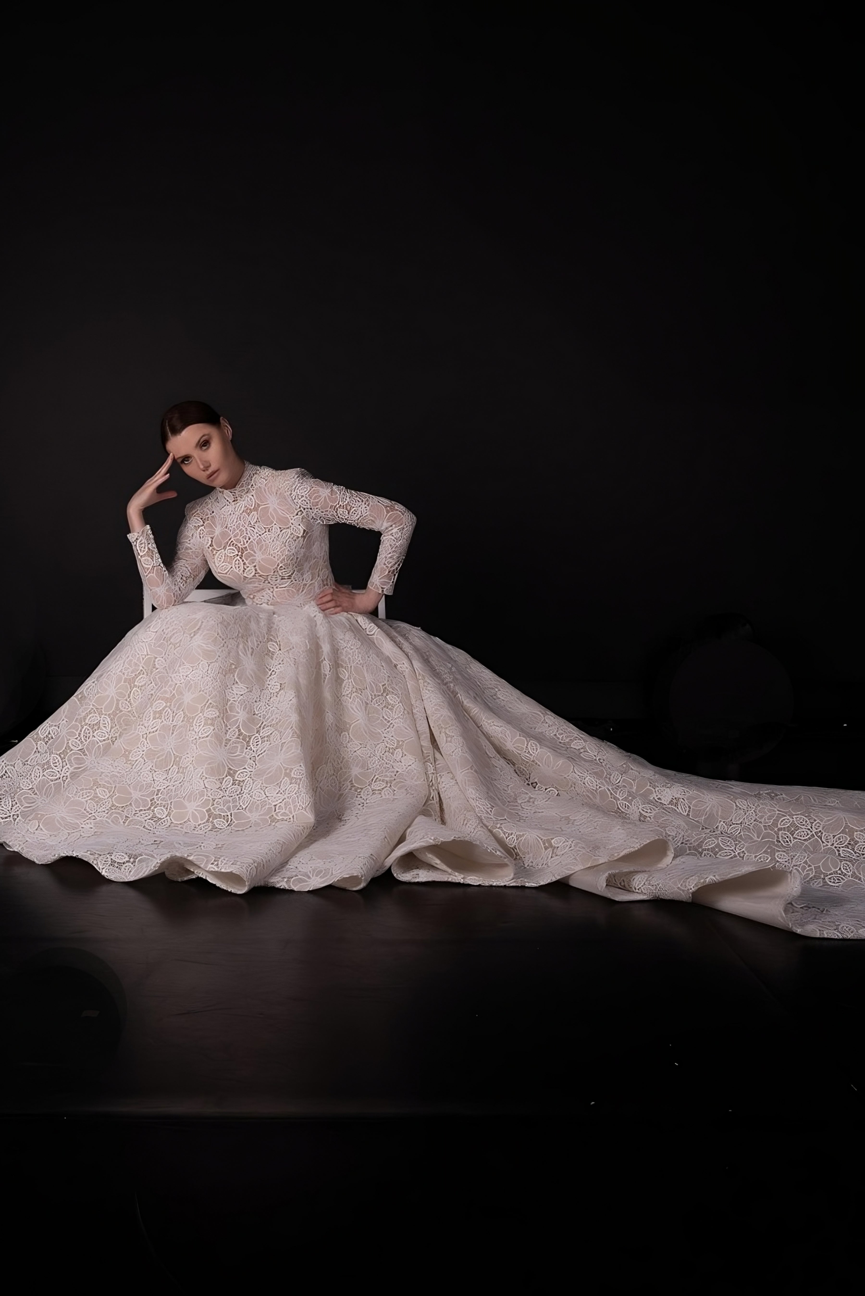 Be ready to catch everyone's eyes in this couture design by Christina Rossi Couture. Shows off in an all-over lace design, intricate details of floral pattern in a full cover neckline, and flaunts modesty in all angles. Charlotte has a cathedral train and customisable based on your desire.