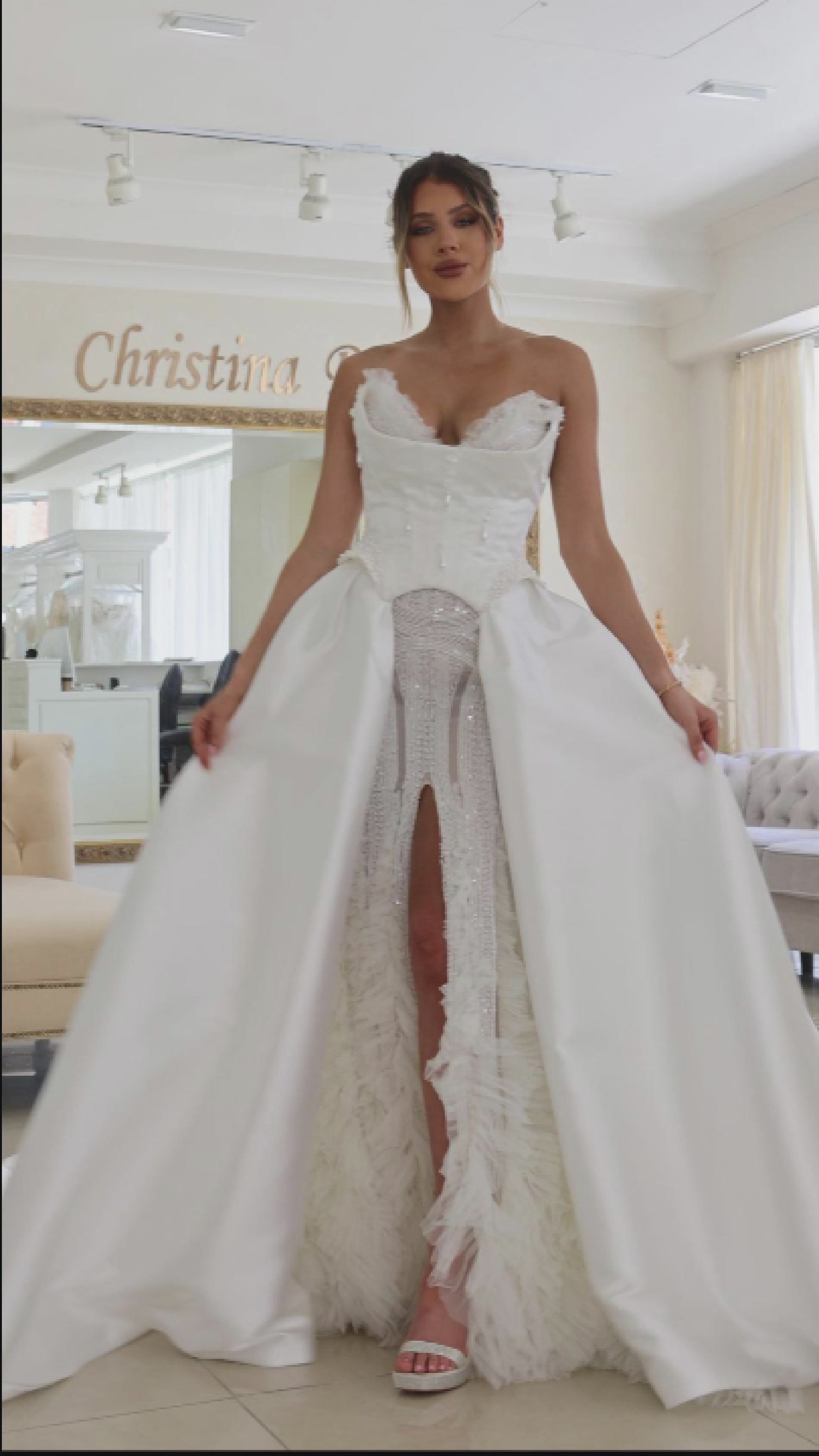 Splendid lace and tulle detachable corset entirely adorned by hand with crystal, pearls, 3D florals, and sequined embellishments that fold into mesmerizing waves ornament. Featuring a sexy slit in the middle of the skirt, an impressive waist detail, a lace closure on the back. Can be complemented by a matching minimalist or matching veil.