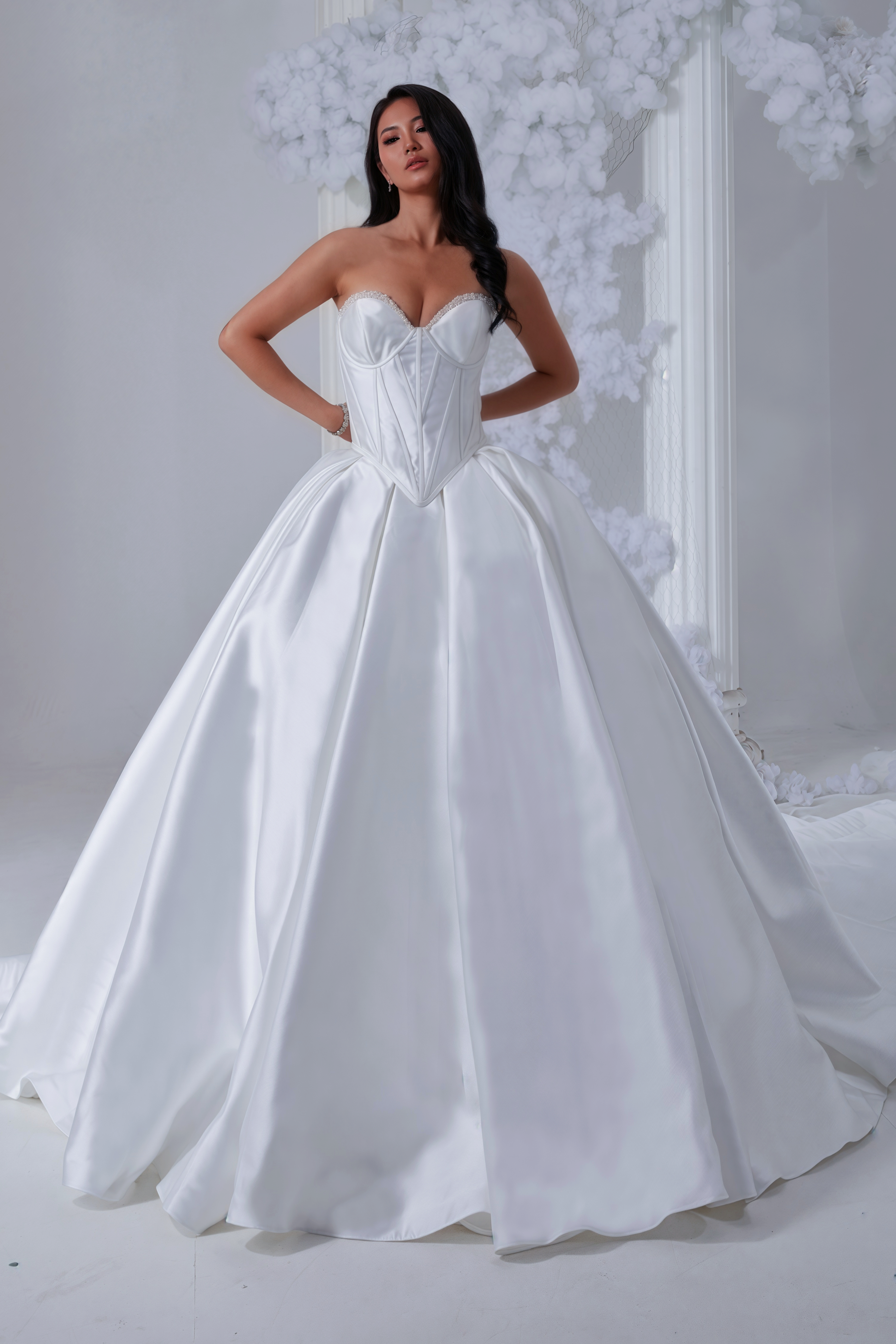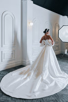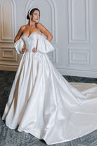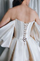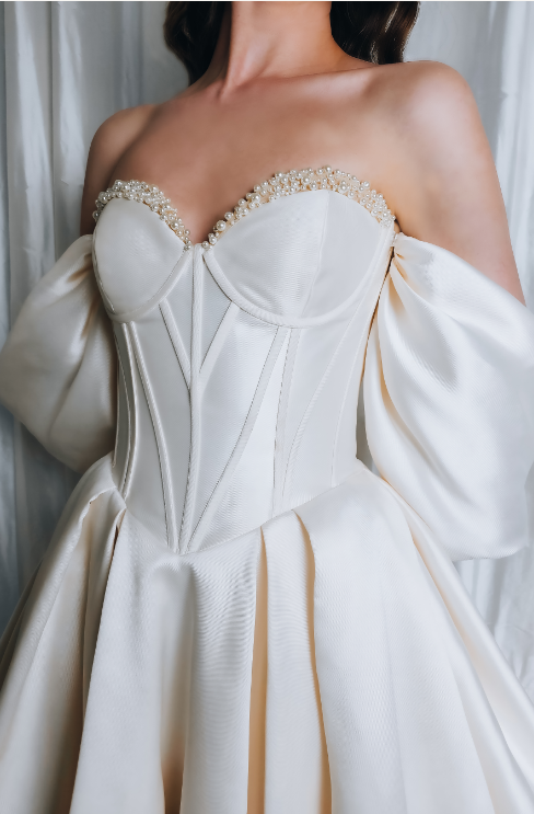 EMMA features a structured corset and hand-beaded pearls on the front neckline. The puff sleeves are everything in this off-the-shoulder wedding dress made of luxurious Mikado fabric! Every woman deserves to wear an elegant, stylish, and out-of-this-world wedding dress.