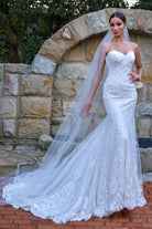 Mermaid style that has a sweetheart neckline, detailed lace applique over layers of textured tulle with scalloped lace hemline.