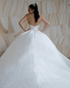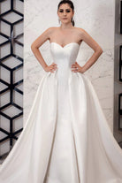 A high-quality silk Mikado, modern style fit & flare wedding gown with a long detachable train. Couture Style includes Calico fitting, made-to-your-size measurement, and a basic customization option.