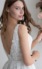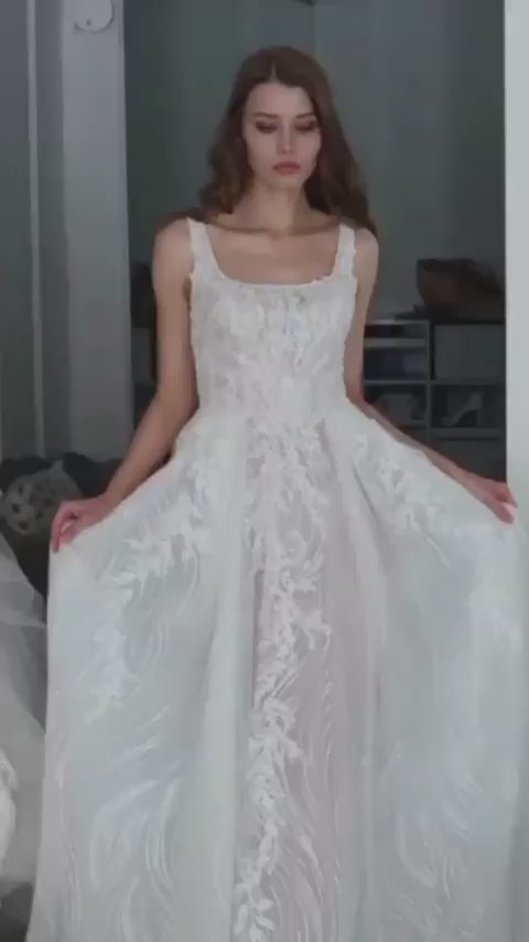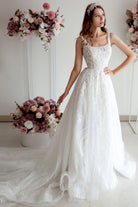 Soft A-line skirt with embellished leafy chiffon lace, sheer bodice with a square singlet top neckline and fine straps. Couture Style includes Calico fitting, made-to-your size measurement, basic customization options.