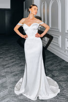 A modernized sweetheart neckline is accented by soft pleating and an asymmetrical bodice for an effortless allure to an impeccably tailored look. The off-the-shoulder straps are detachable while the fit-and-flare silhouette is accentuated by sophisticated contour seaming.