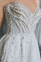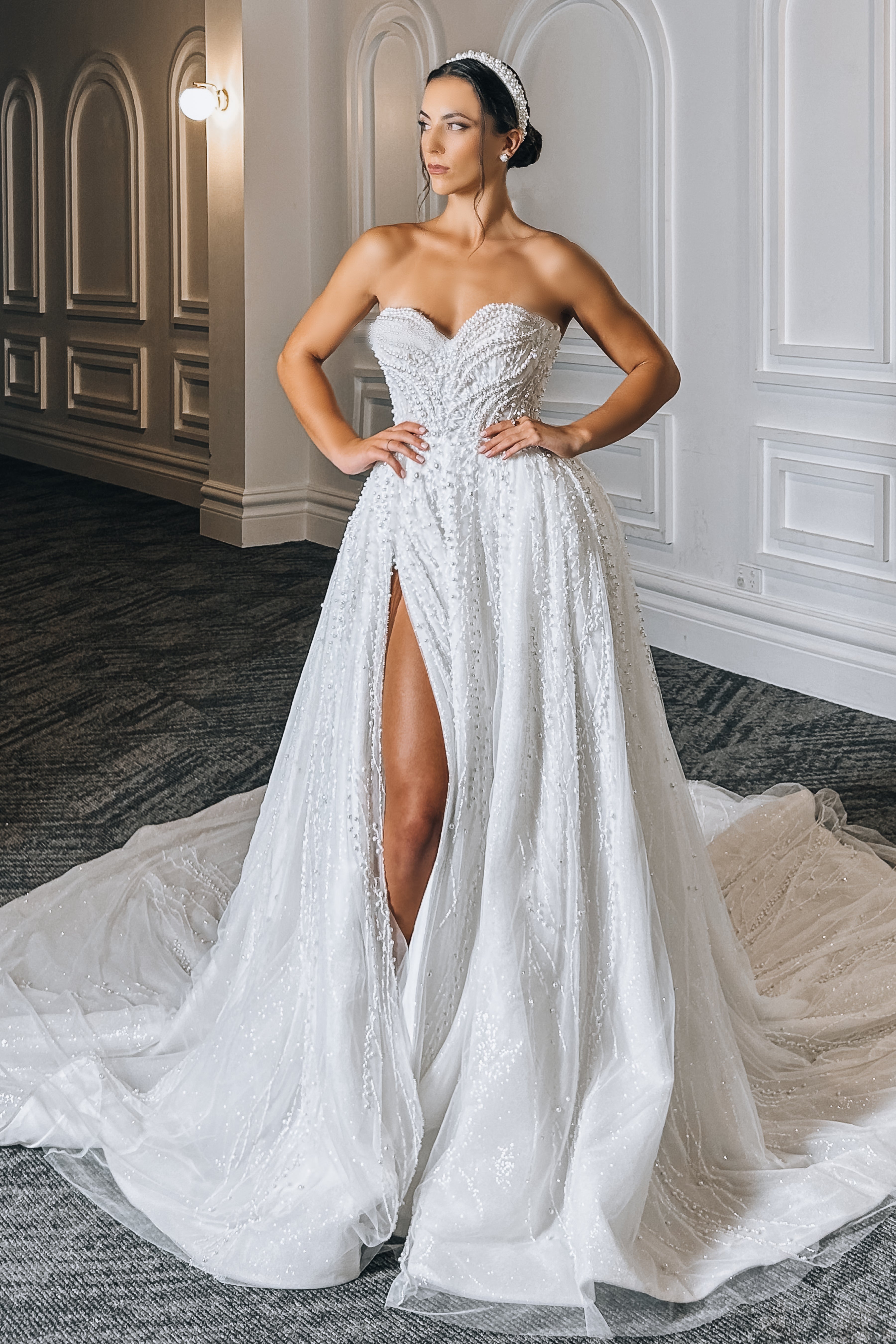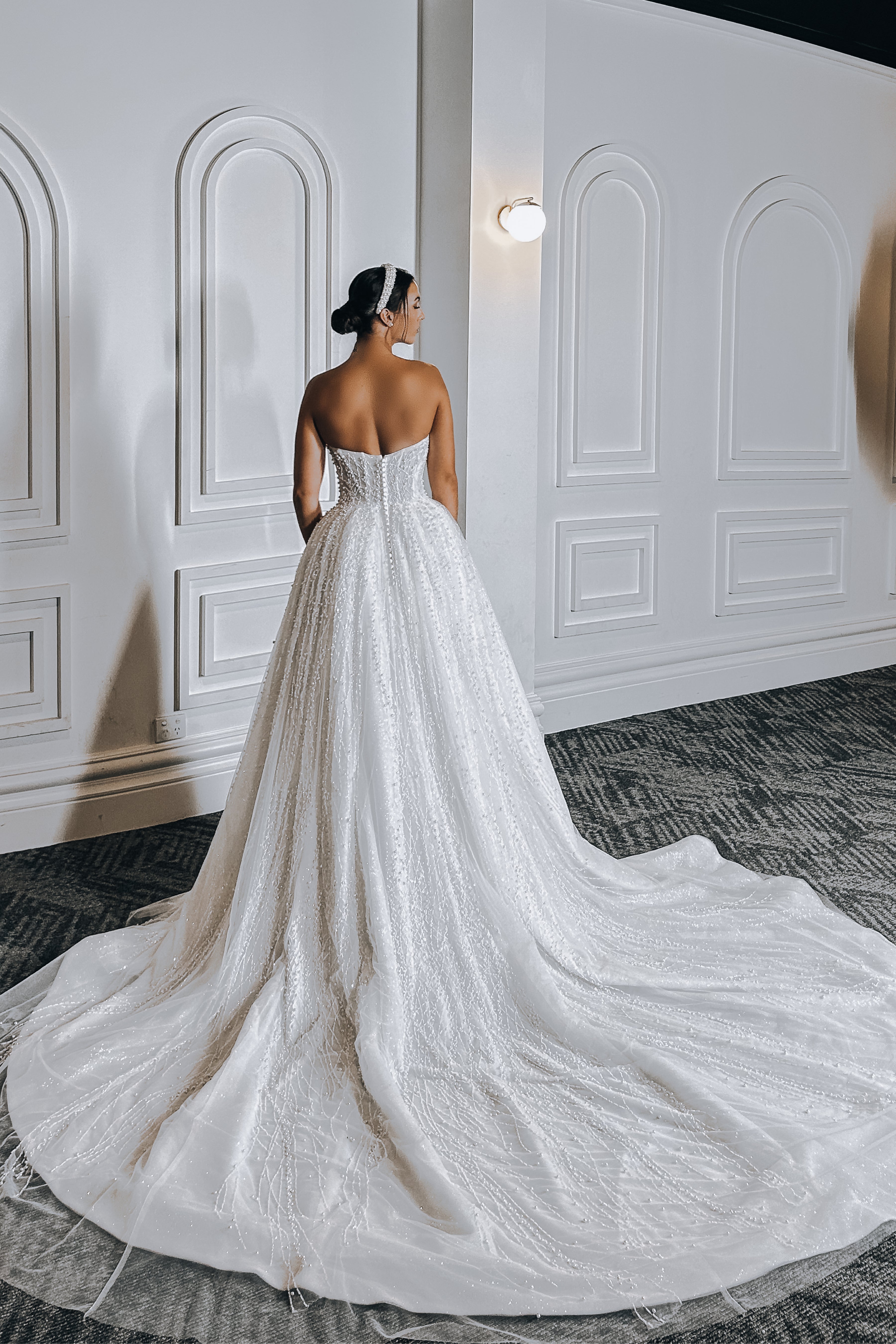 Crafted with the most delicate high-end shimmer tulle, and luxurious details, hand embroidered with all-over pearls and crystals, and unique beading patterns. Madeleine will give you a royalty and elegant look and feel.
