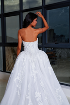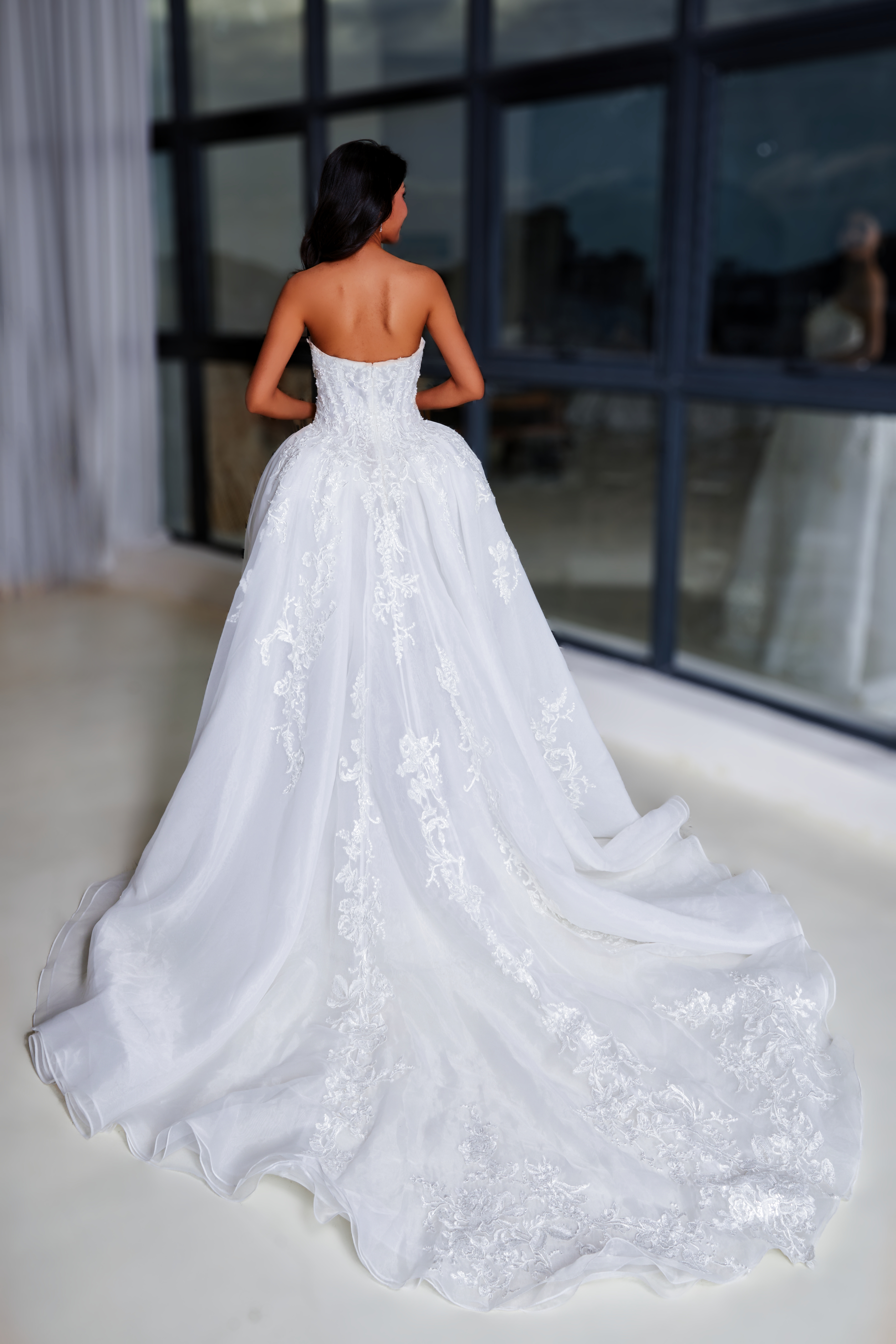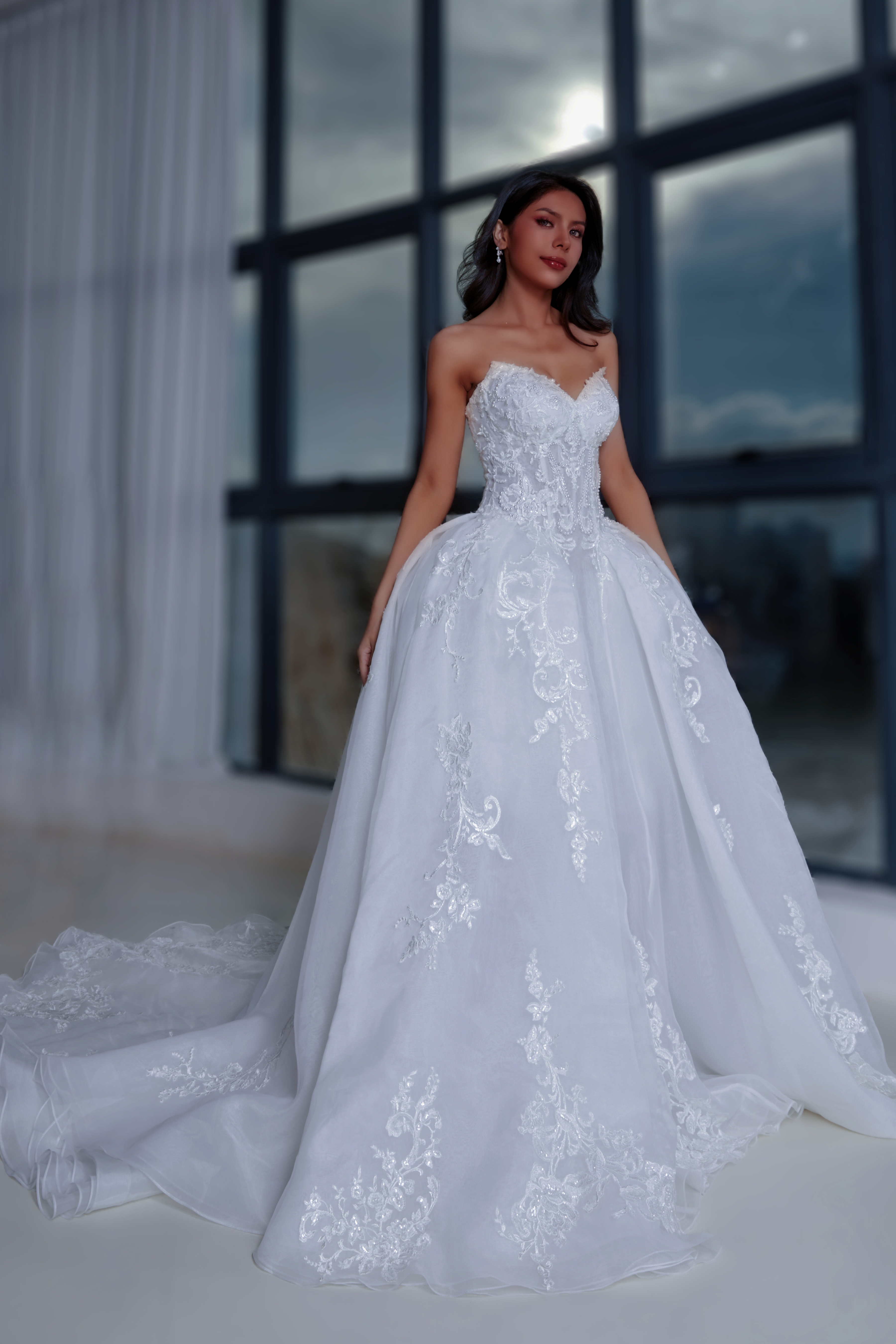 Dramatic Princess ball gown adorned by hand with intricate sequins, beading ornaments, and embroidered lace applique. Featuring a fitted boned corset with a daring cat-eye neckline that has built-in cups, and a basque waist shape on the front. The voluminous skirt has a long train and can be extended based on your desire.