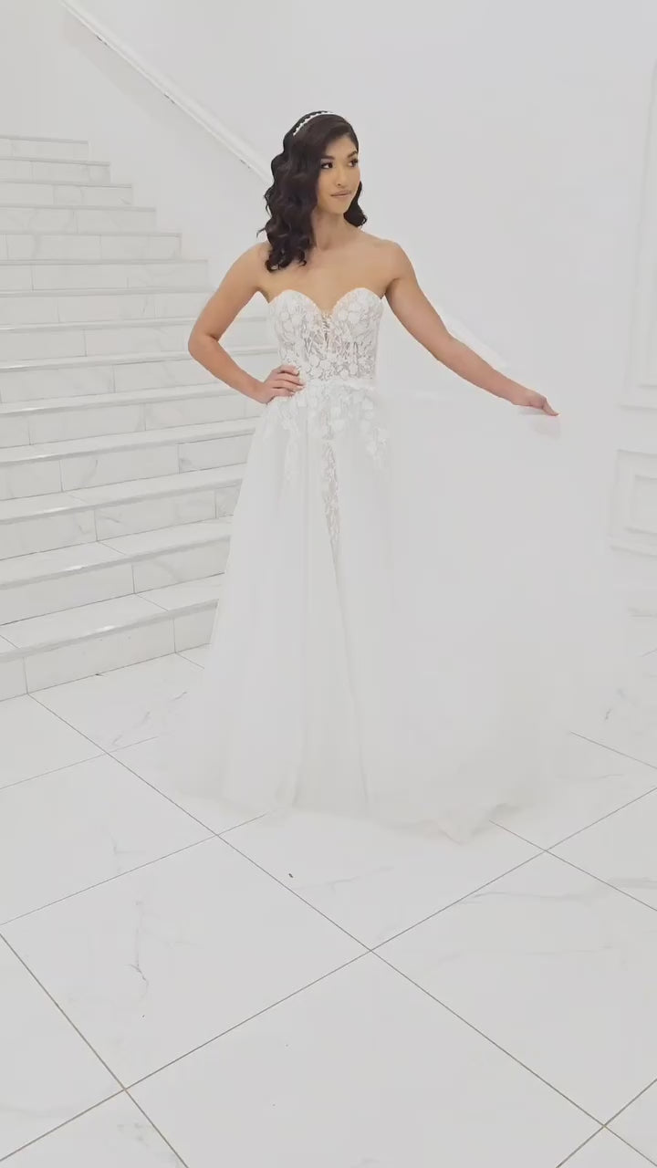 What's more romantic than an off-the-shoulder lace corset ballgown? One that's crafted in multi-layered silk and sparkle tulle, adorned with 3D floral lace embroidery cascading down the box-pleated full skirt, and plunging V-neckline. Meet NORA.