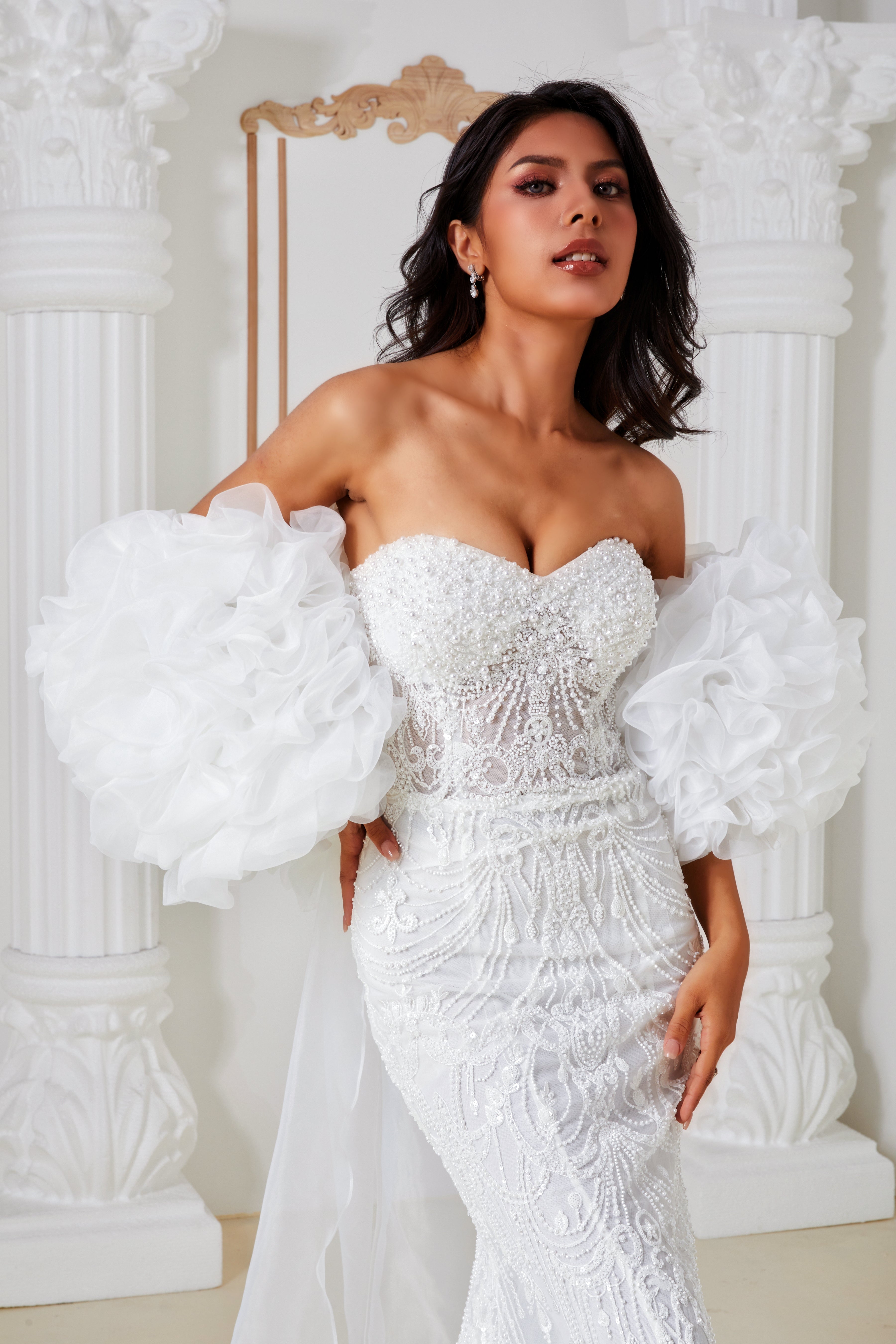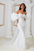 Prepare to dazzle on your wedding day with this mesmerizing mermaid, a fitted wedding dress. Adorned with shimmering sequins and intricate beadwork, it radiates glamour and luxury. The glamorous element of sophistication and allure beautifully accentuates your curves. For added versatility, a detachable floral cape sleeve is a must.