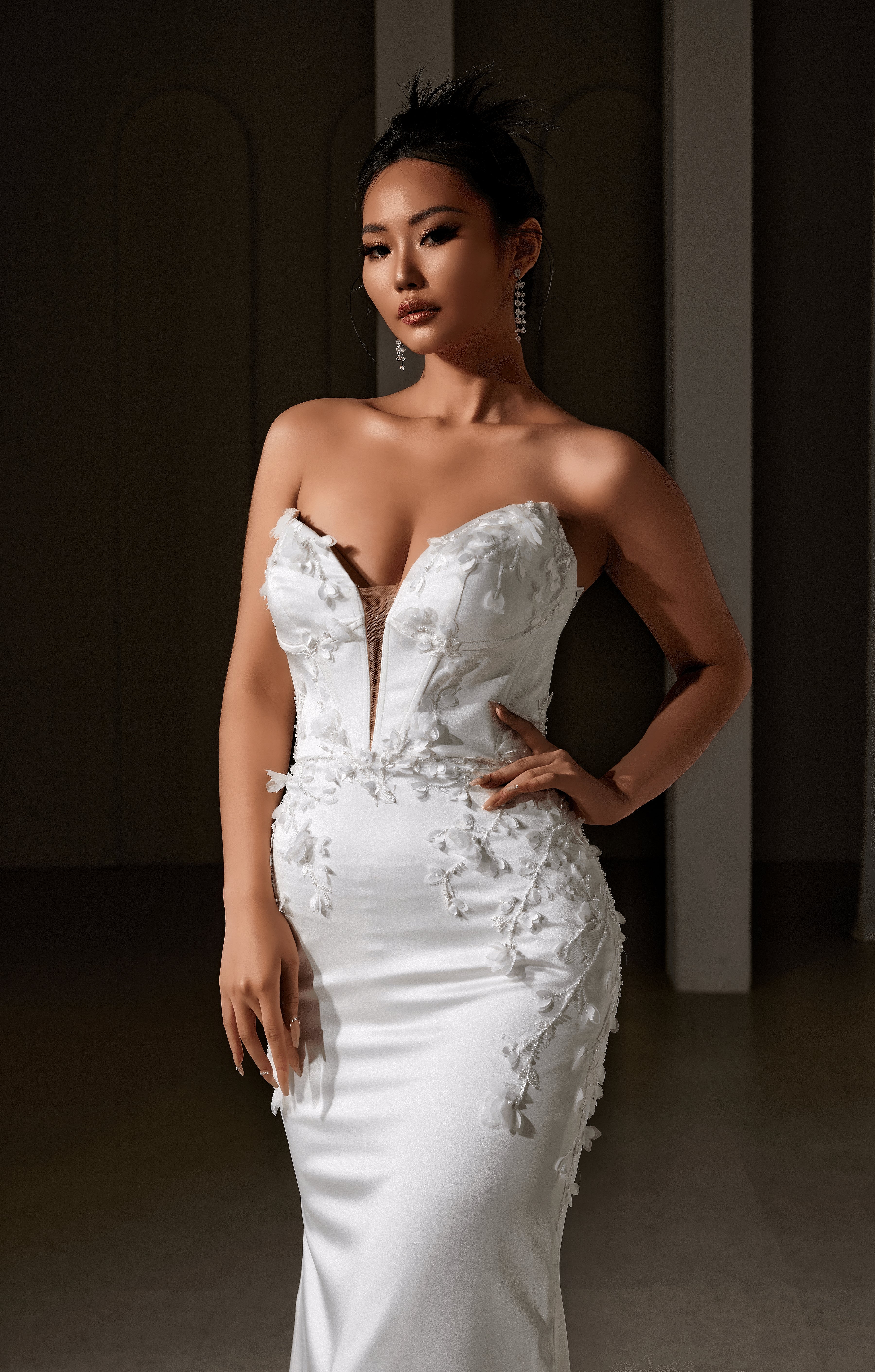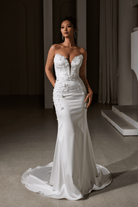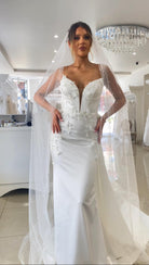 Exquisite straight wedding gown crafted from lace and satin shaped in a gorgeous floor-length fitted silhouette. Featuring an illusion deep v-neckline adorned with cat-eye edges on the neckline, soft and whimsical embellishments, and a fitted bodycon silhouette with a short train. Can be complemented with a matching veil or custom the way you desire.
